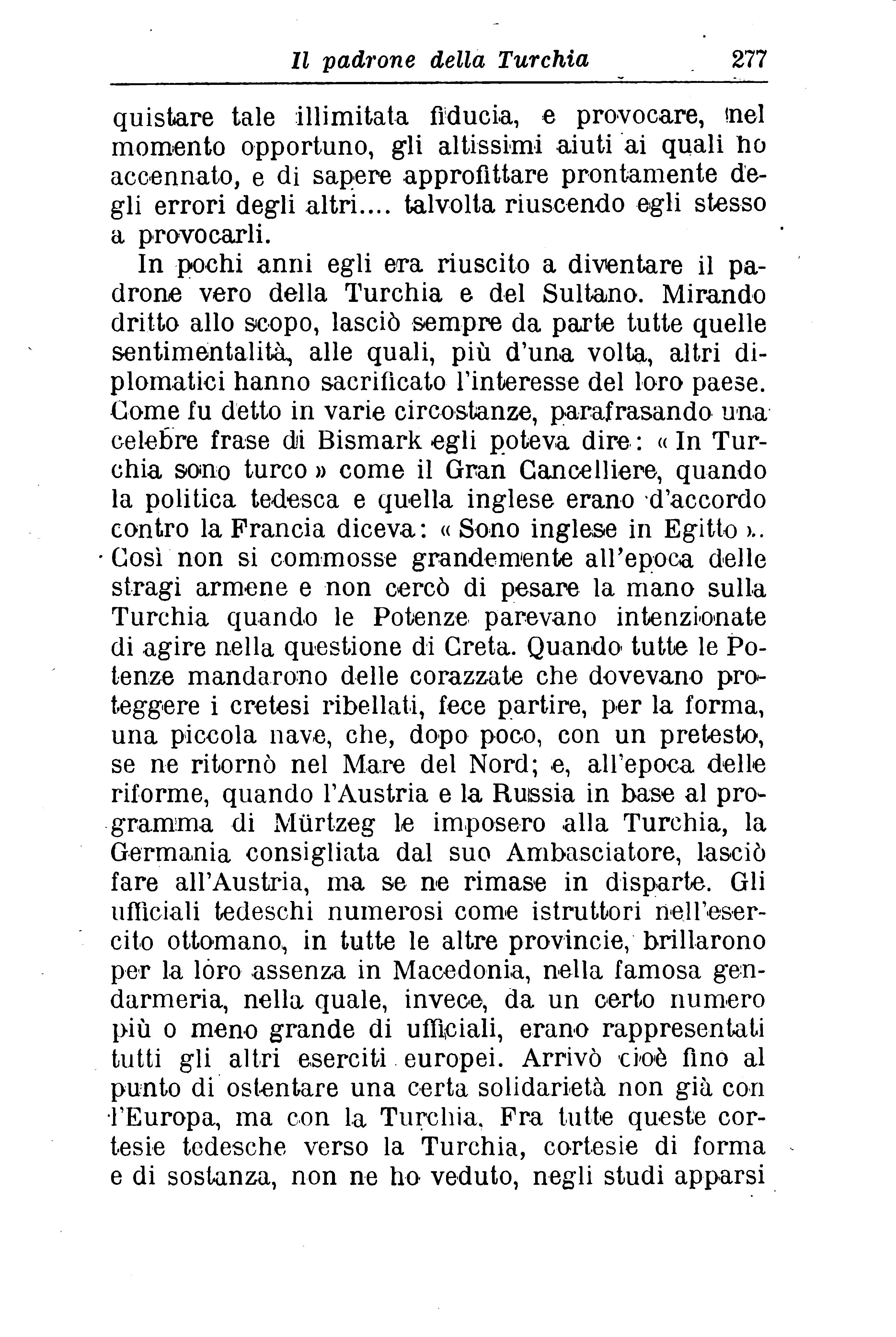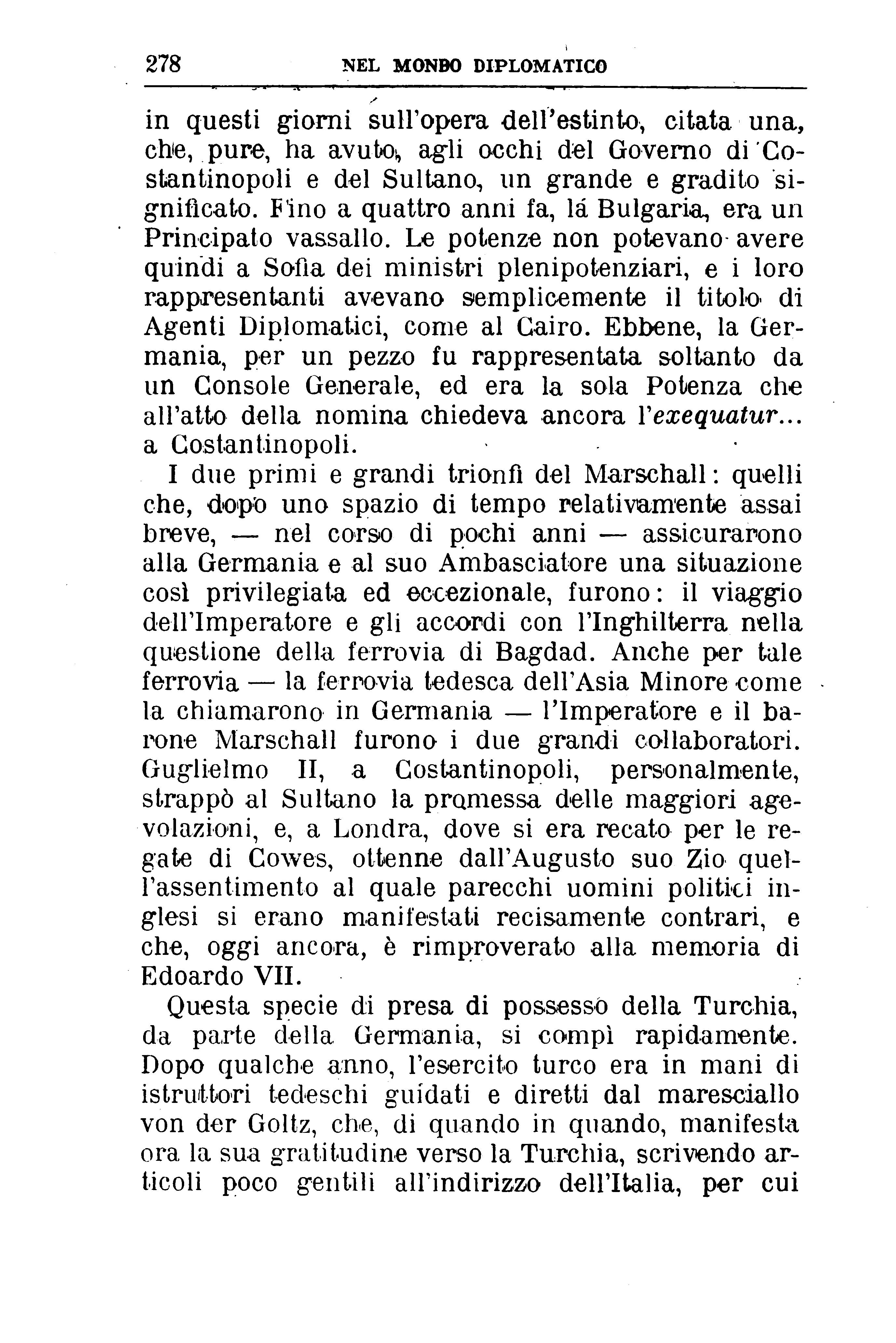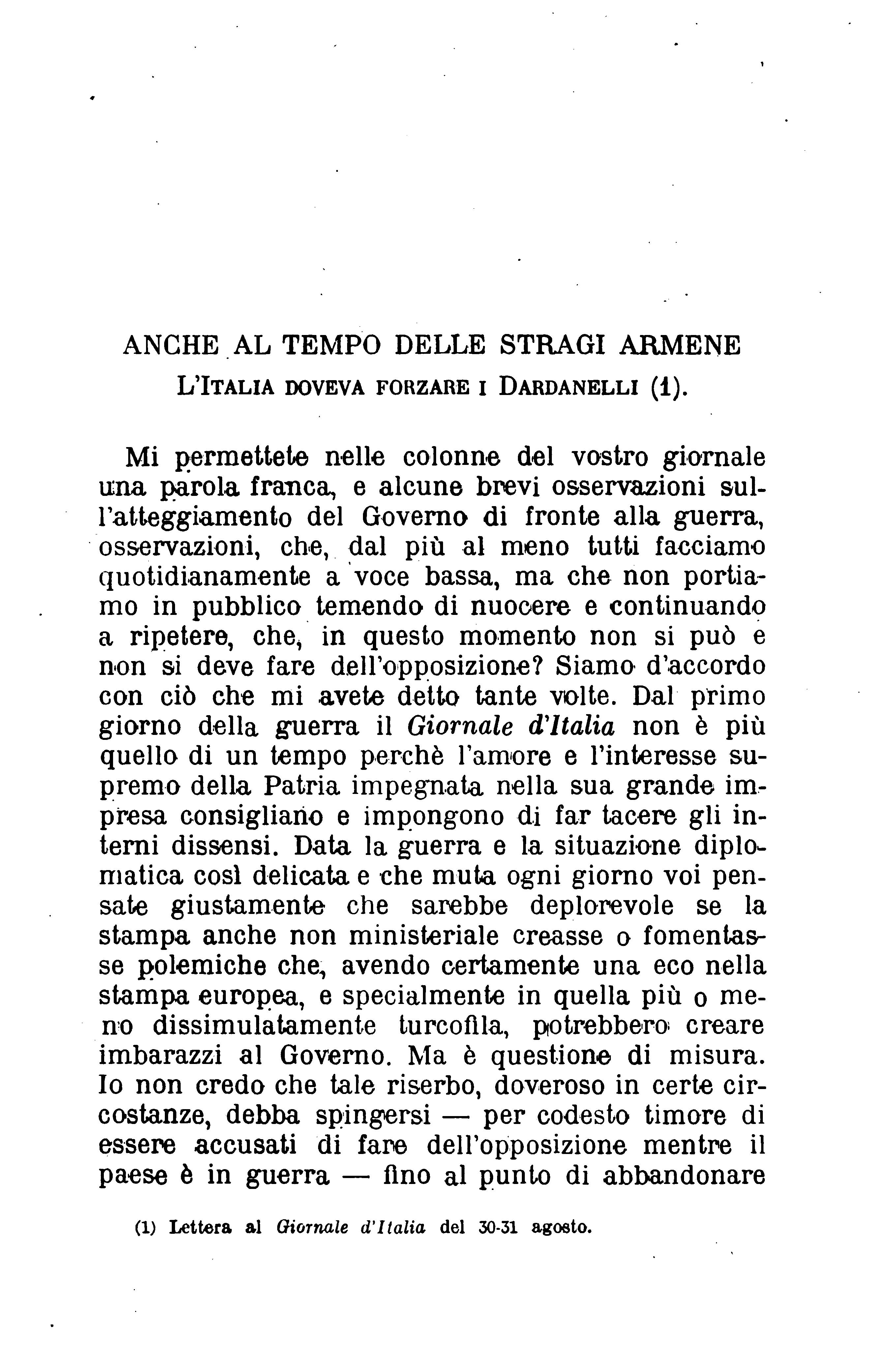 È accaduto quello che doveva necessariamente accadere che cioè l'Italia poco o nulla contava a Costantinopoli, tanto che si è verificato, dopo le grida di abbasso l'Italia sotto le finestre della nostra ambasciata, un fatto senza precedente : quello di un comizio della colonia Italiana per protestare contro la condotta dell'Ambasciatore con relativi fischi al suo indirizzo... 287