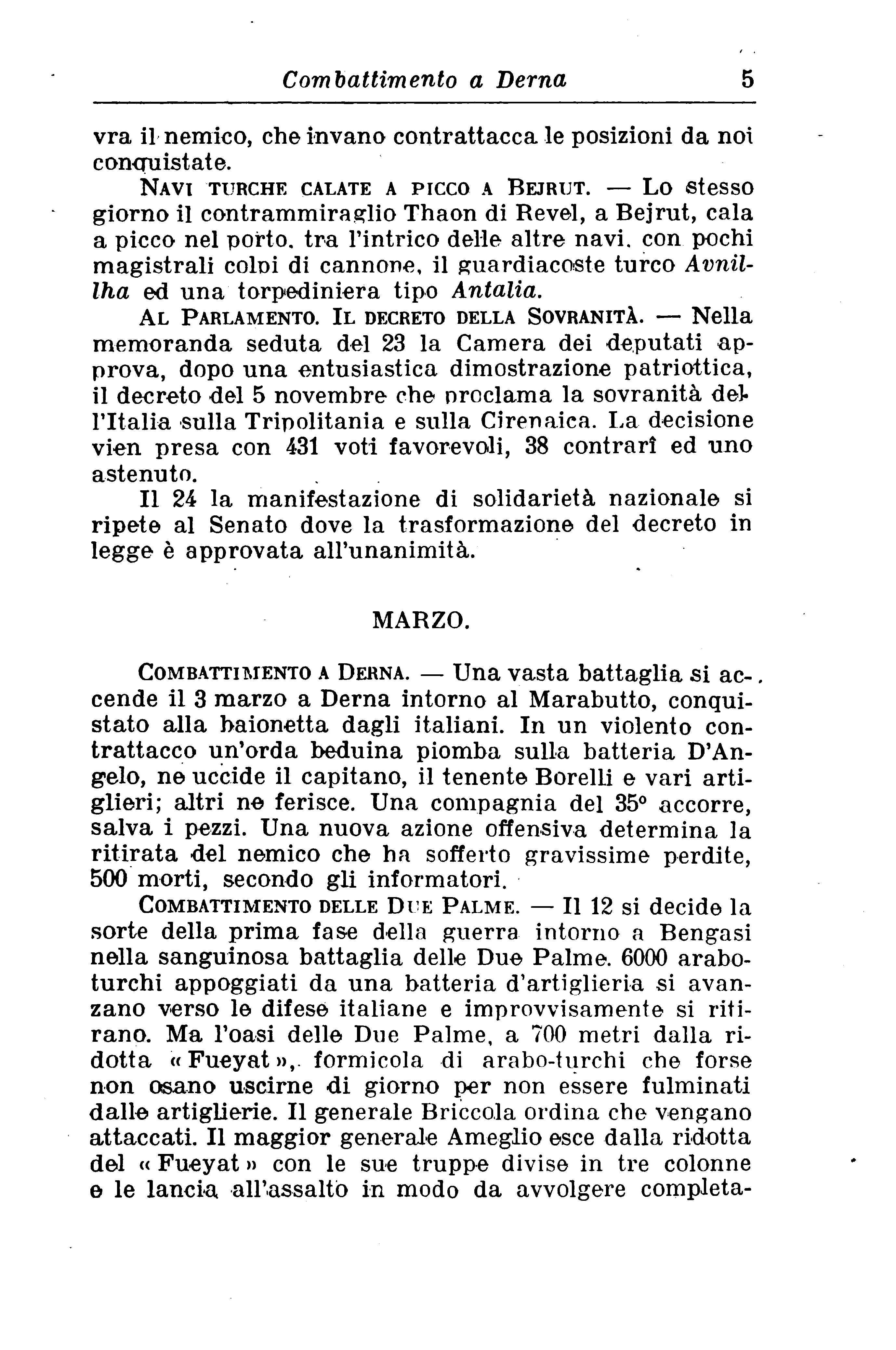 COMBATTIMENTO A DERNA. Unavasta battaglia si ac-. cende il 3 marzo a Derna intorno al Marabutto, conqui stato alla baionetta dagli italiani. In un violento con trattacco un'orda beduina piomba sulla batteria D'An gelo, ne uccide il capitano, il tenente Borelli e vari arti glieri; altri ne ferisce. Una compagnia del 35° accorre, salva i pezzi. Una nuova azione offensiva determina la ritirata del nemico che ha sofferto gravissime perdite, 500 morti, secondo gli informatori.