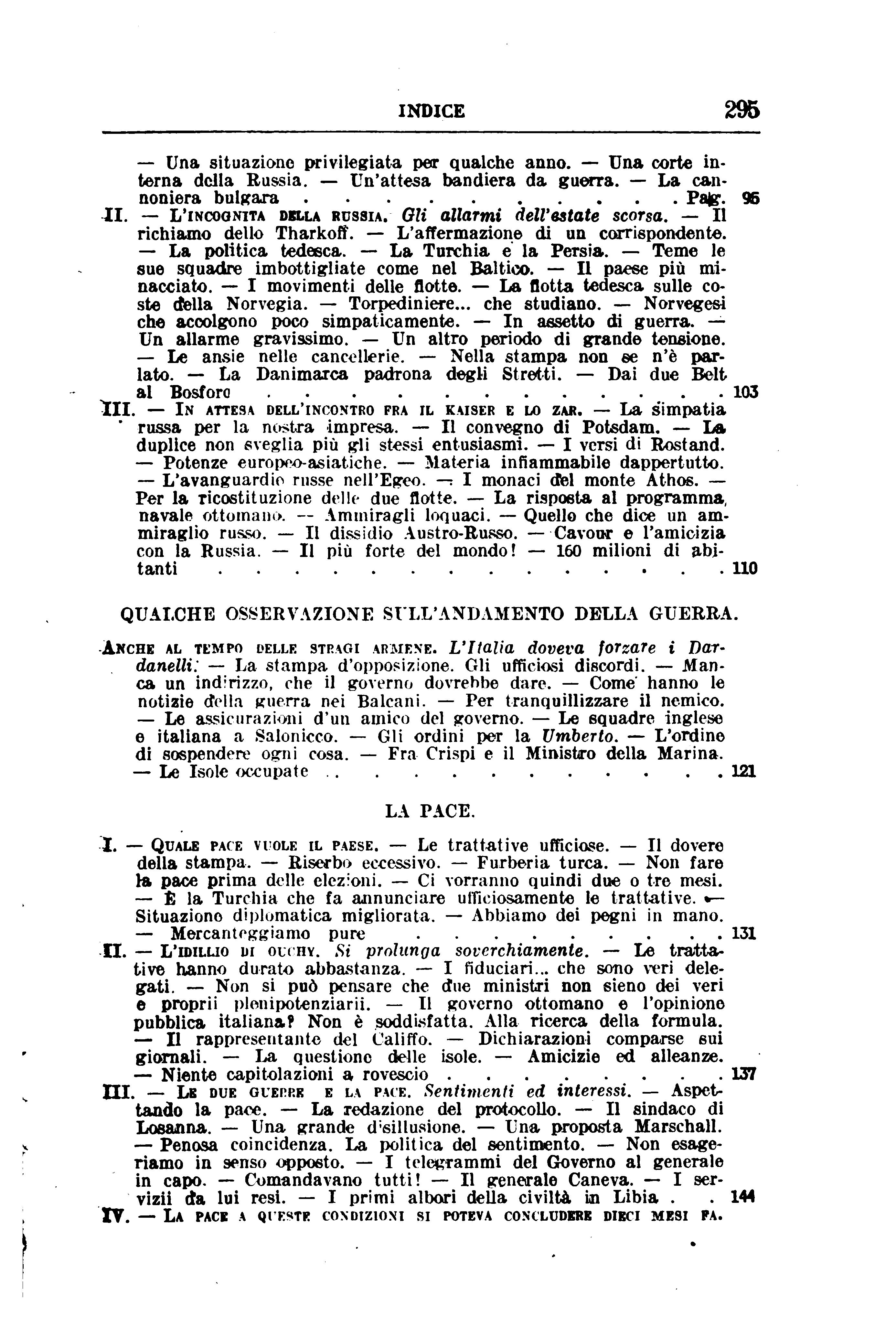 Il generale Ameglio a Milano. Interprete... di siciliano'. Il tavolo dei duelli. Gli ammiragli al Senato. Sulla piazza del Quirinale. Il conte Marescotti Sotto le armi all'età di 4 anni! La canzone di Toselli.L'offerta I thè di Enver bey. L'ultimo difensore di Rodi. II di ex-ufficiali di marina. Tre Boncompagni in servizio. Una risposta del Re . 242 principe Del Drago e Don Agostino Chigi.