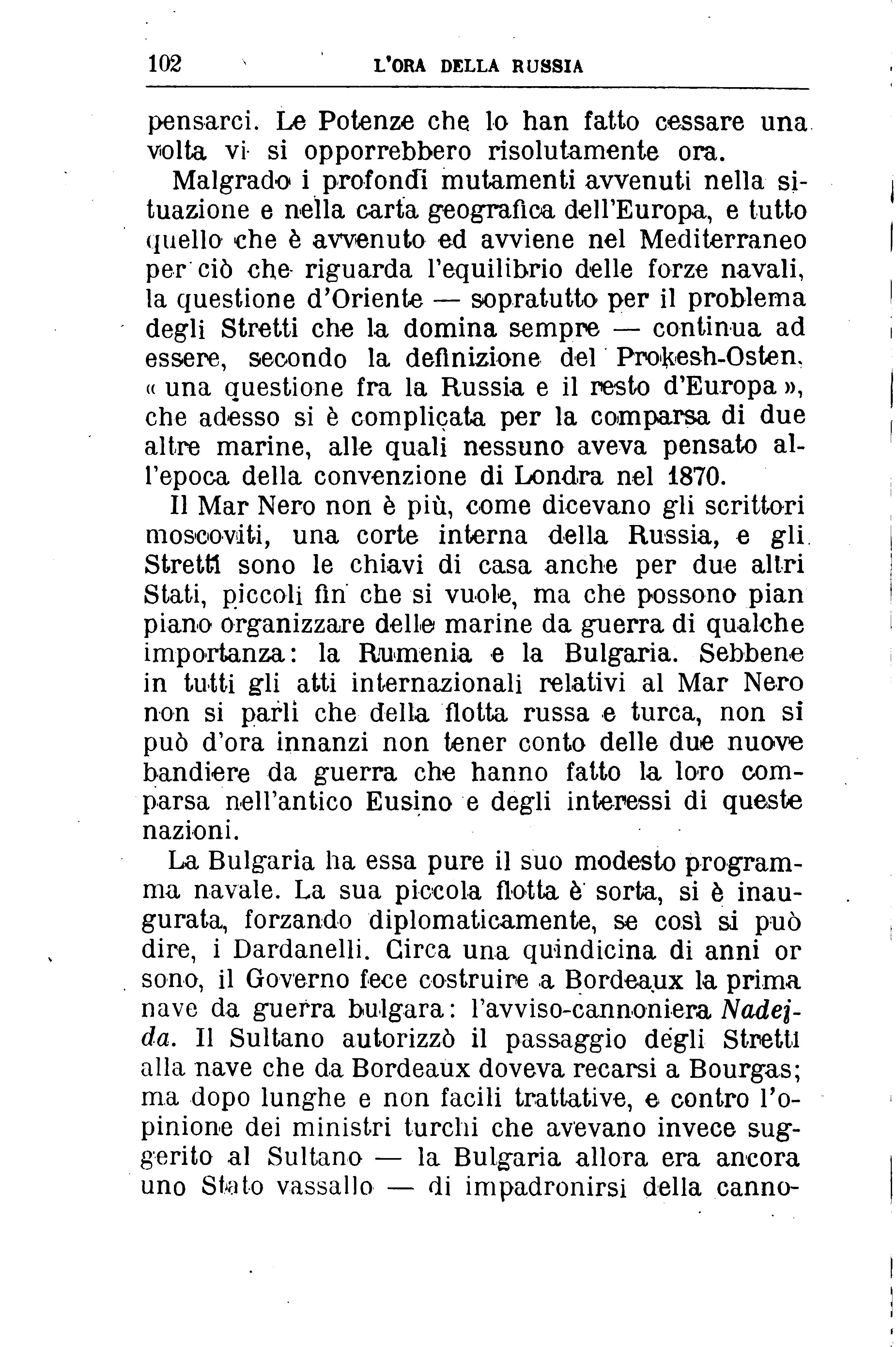 A POCHE MIGLIA DAL BOSFORO. La Russia e gli Stretti. Dimo strazioni militari. Le fortificazioni del Bosforo. Giasone e Me dea. Il ponte sul quale passò Dario. Un'altra leggenda di amore. La Pharmakia... diplomatica. O il più grande amico o il più grande nemico. Padrona del Mar Nero. Un trat tato che si lacera. II XX Settembre e gli Stretti. La po litica dei pourboires. La conferenza a Londra e il fatto com piuto. Le navi della flotta ausiliaria. A cannoni coperti. - -