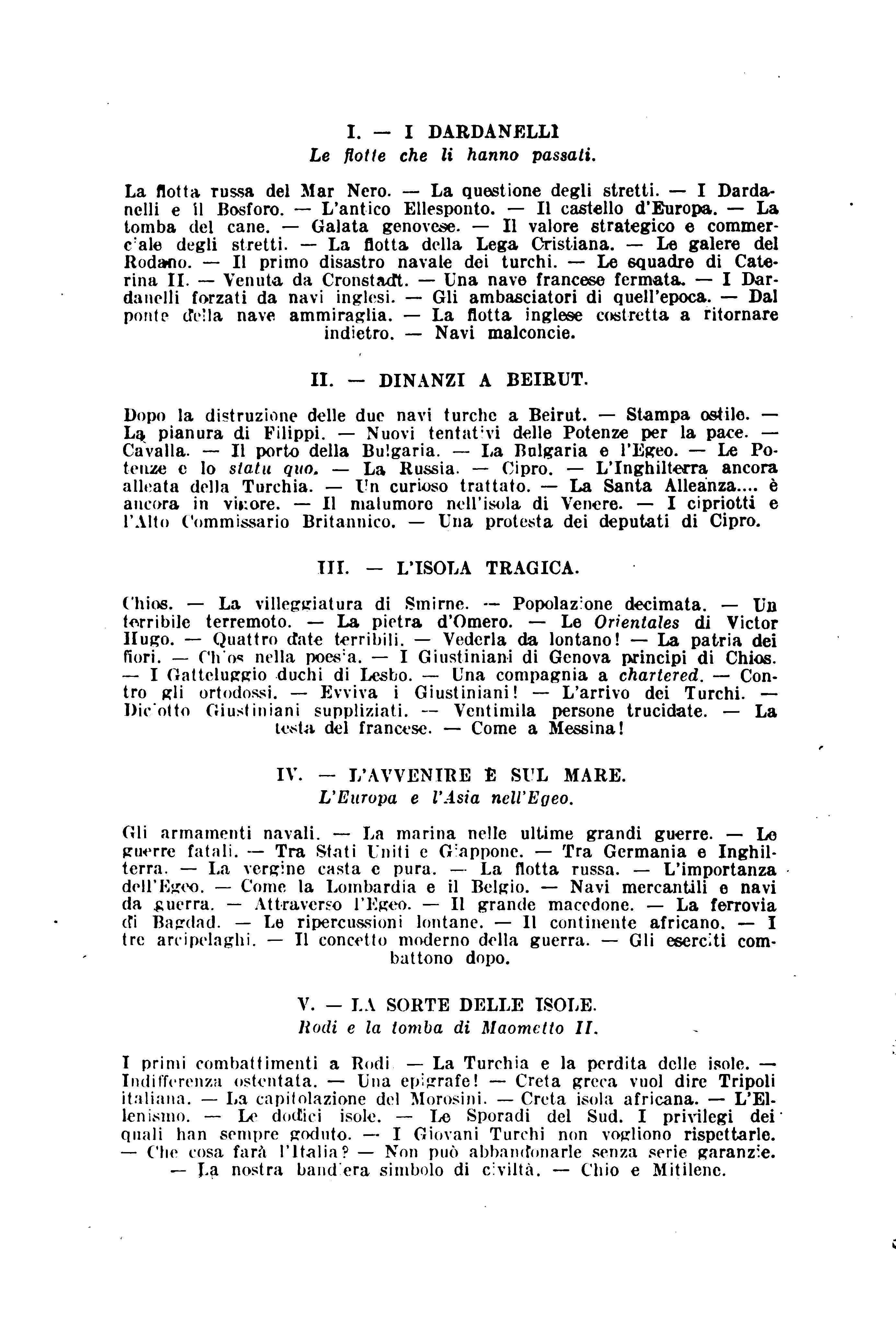 V. Rodi e la tomba di Maometto II. LA SORTE DELLE ISOLE. 1 primi combattimenti a Rodi. La Turchia e la perdita delle isole. Indifferenza ostentata. Una epigrafe! Creta greca vuol dire Tripoli Italiana. La capitolazione del Morosini. Creta isola africana. L'Ellenismo. Le dodici isole. Le Sporadi del Sud. I privilegi dei quali han sempre goduto. I Giovani Turchi non vogliono rispettarle. Che cosa farà l'Ita lia? Non può abbandonarle senza serie garanzie. La no stra bandiera simbolo di civiltà. Chio e Mitilene -