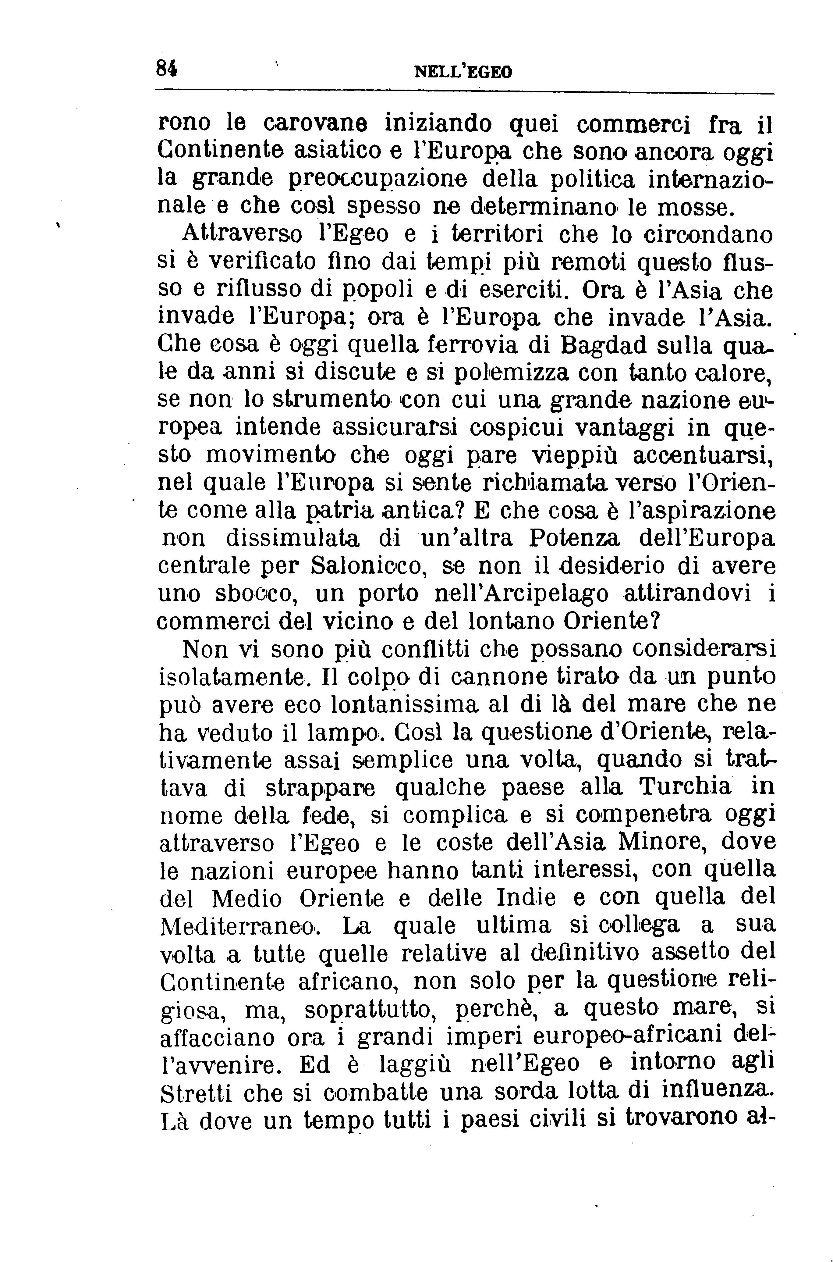 IV. L'AVVENIRE È SUL MARE. L'Europa e l'Asia nell'Egeo. Gli ar mamento navali. La marina nelle ultime grandi guerre. Le guerre fatali. Tra Stati Uniti e Giappone. Tra Germa nia e Inghilterra. La vergine casta e pura. La flotta rus L'importanza dell'Egeo. Come la Lombardia e il Belgio. Navi mercantili e navi da guerra. Attraverso l'Egeo. Il grande macedone. La ferrovia di Bagdad. Le ripercussio ni lontane. Il continente africano. I tre arcipelaghi. Il concetto moderno della guerra.