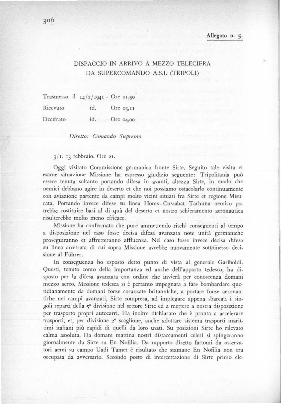 >> 5 - Dispaccio 3/ r, del 13 febbraio Supercomando A S.I. a Comando Supremo Ita li ano, circa visita Gen . Roatta alla Comm issione germanica di Sirte >> 300