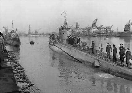 Il sommergibile Michele Bianchi entra nella base di Bordeaux con al periscopio le bandierine triangolari dei suoi successi.