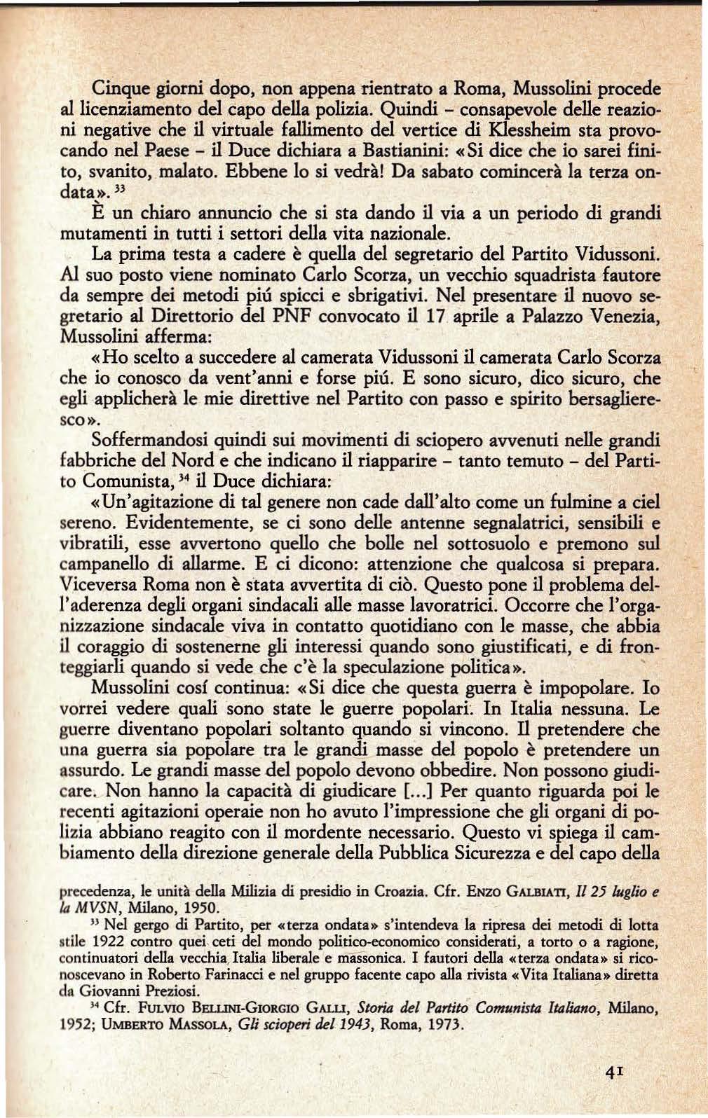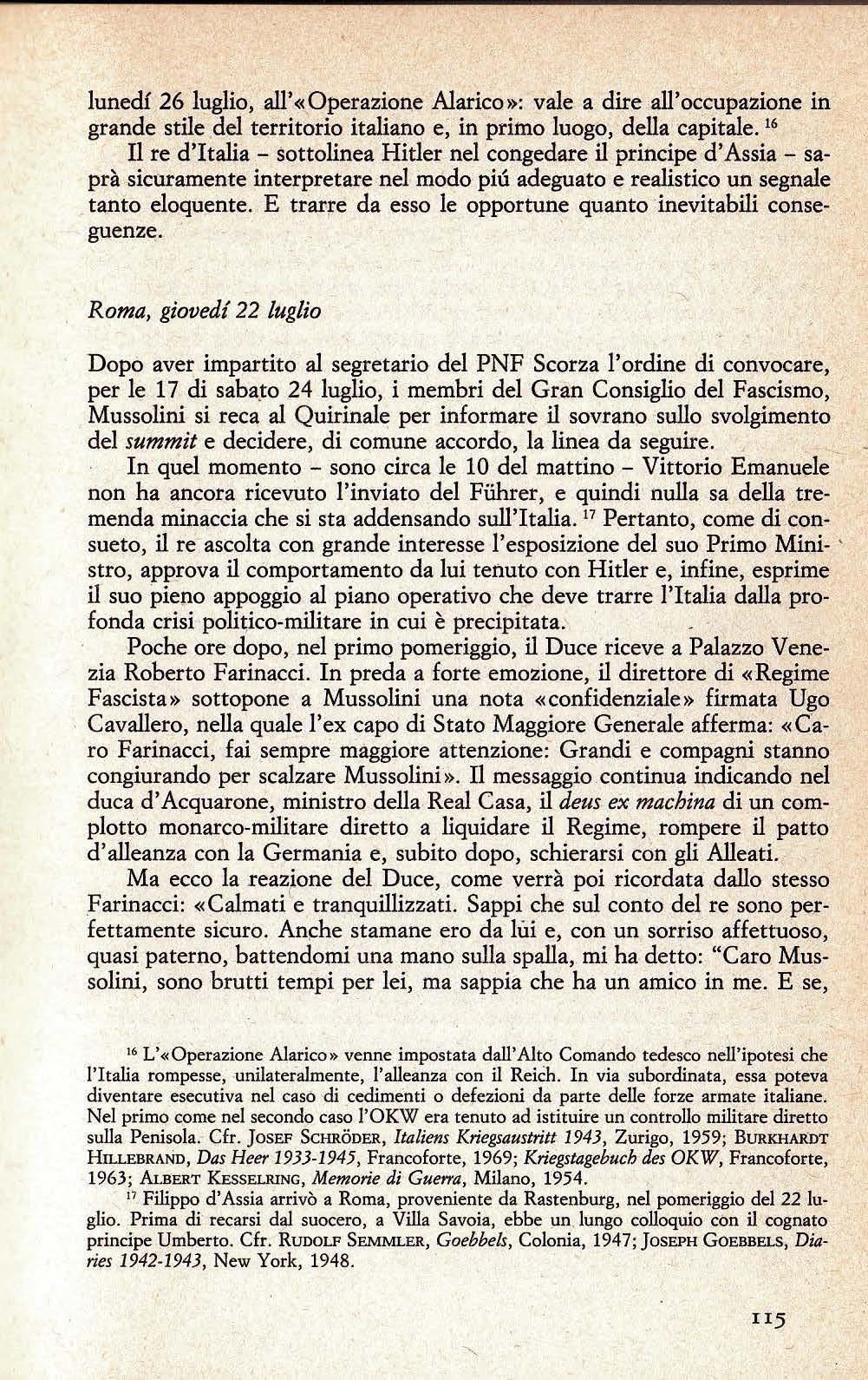Zangrandi - dal momento in cui ebbe termine la seduta del Gran Consiglio sino alle 17 del 25 luglio, ci troviamo di fronte a una serie di atti da parte di Mussolini che (se giudicati nel contesto in cui avvennero e non alla luce di quel che accadde poi) indicano il comportamento di un uomo sicuro di sé e certo, specialmente, che per raddrizzare la situazione avrebbe potuto contare non solo sull'appoggio, ma anche sulla collaborazione del re».