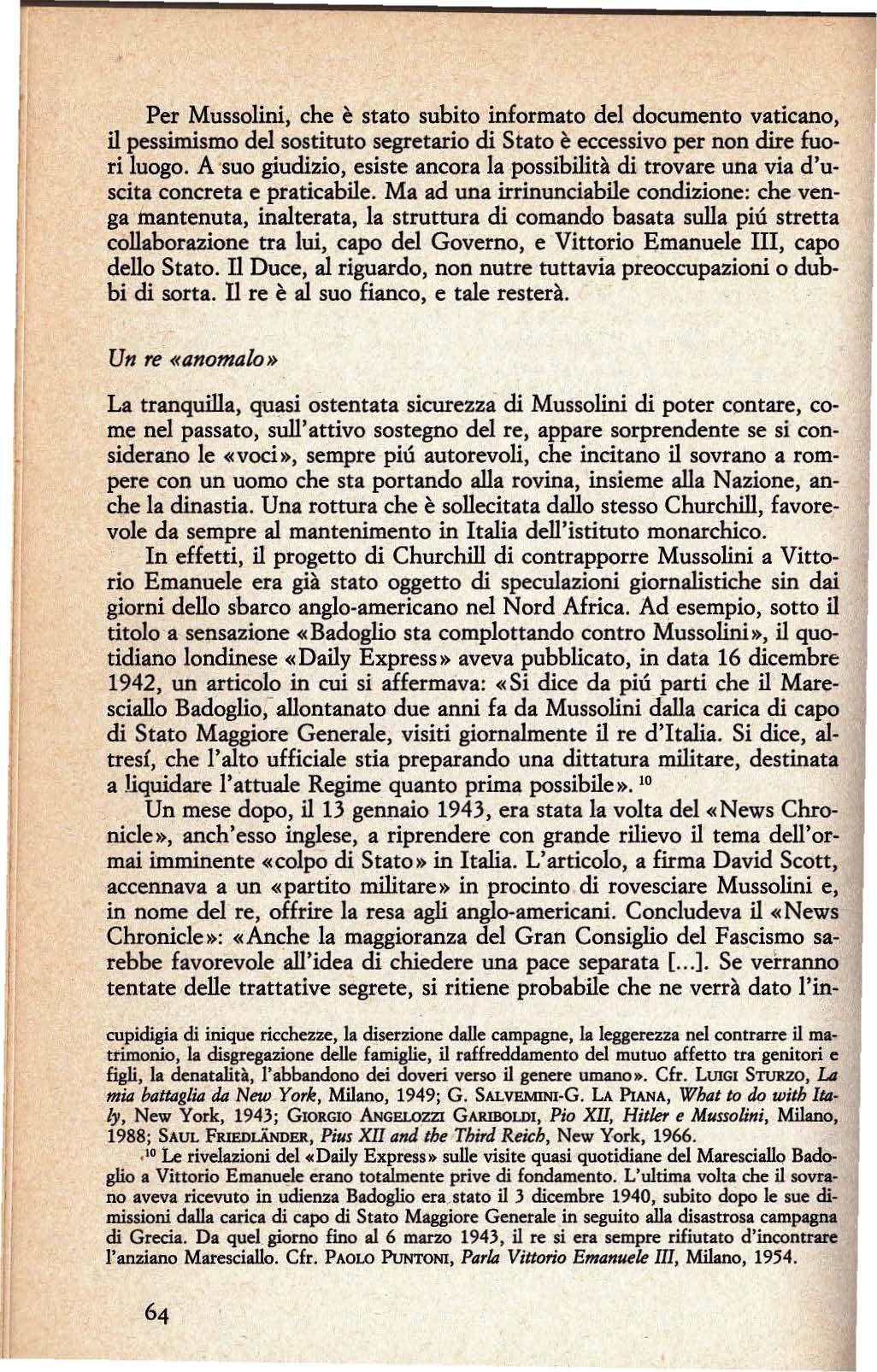 Riassumendo, a giudizio di Zangrandi i rapporti •personali e politici tra Mussolini e il sovrano si "erano mantenuti stabili e collaborativi sino all'incontro a Villa Savoia nel tardo pomeriggio del 25 luglio. Non solo: nel chiedere u,Jienza al re, Mussolini si proponeva di illustrare al capo dello Stato un piano operativo diretto a strappare, in extremis, l'Italia dal baratro in cui stava precipitando .