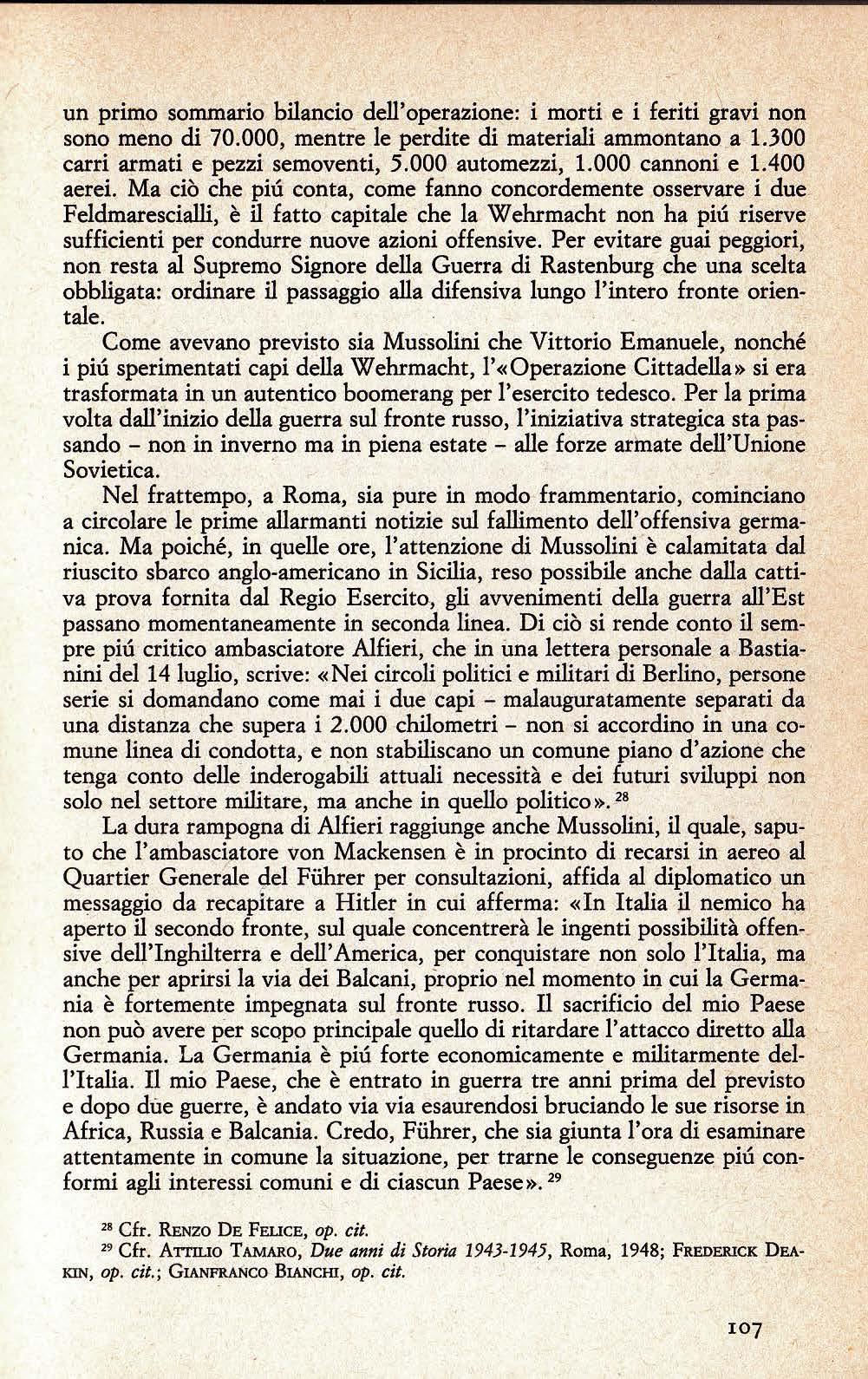Sempre a giudizio di De Felice, anche Vittorio Emanuele III appoggiava il tentativo del ·suo Primo Ministro di riportare la pace · lungo lo sterminato fronte orientale: «Per un momento - ha sottolineato il biografo di Mussolinianche il re dovette sperare in un accordo tedesco-sovietico · che permettesse di porre fine alla guerra all'Est e di concentrare tutte le forze dell'Asse contro gli anglo-americani. Rivelatrice è un'annotazione in data 9 aprile 1943 del generale De Bono, di commento a un'udienza conèessagli dal sovrano: "Anche il re fa assegnamento su un accordo Hitler-S11.flin"». E fermiamoci qui.