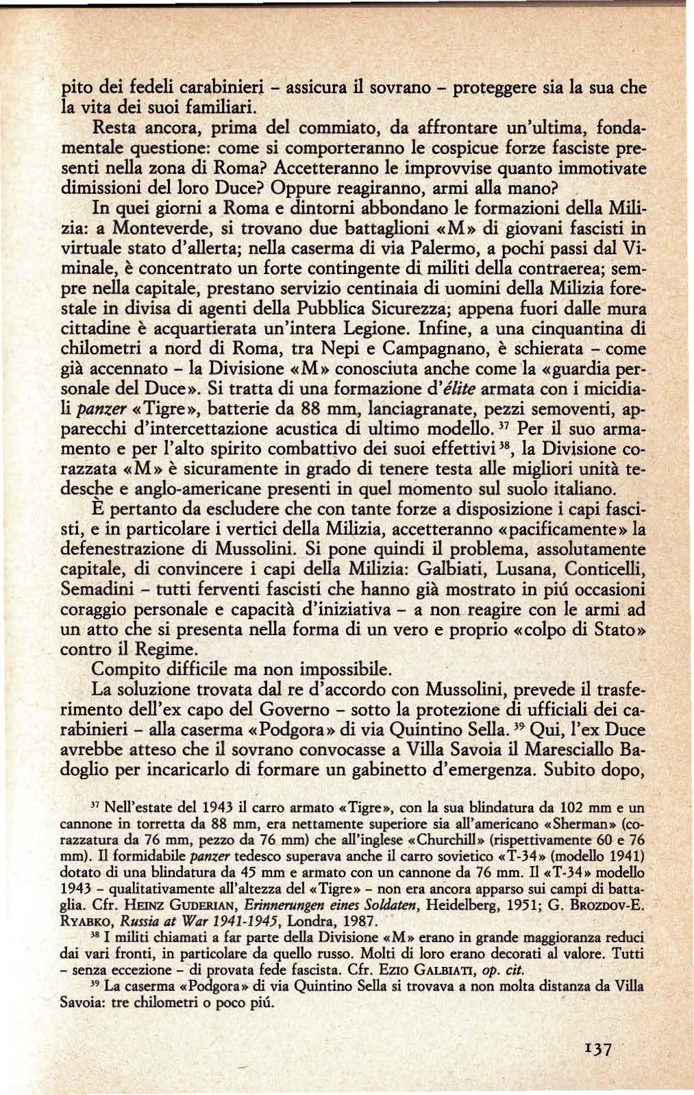 Per quanto riguarda, in particolare, le vicende italiane del luglio 1943 si sostenne subito, come verità indiscutibile, la tesi di comodo secondo la quale la caduta di Mussolini era stata provocata dall'ordine del giomo Grandi, votato a larga maggioranza dal Gran Consiglio del Fascismo. Voto che aveva offerto a Vittorio Emanuele m il pretesto «costituzionale» per affidare lo sconfessato Duce alla custodia dei Reali Carabinieri.