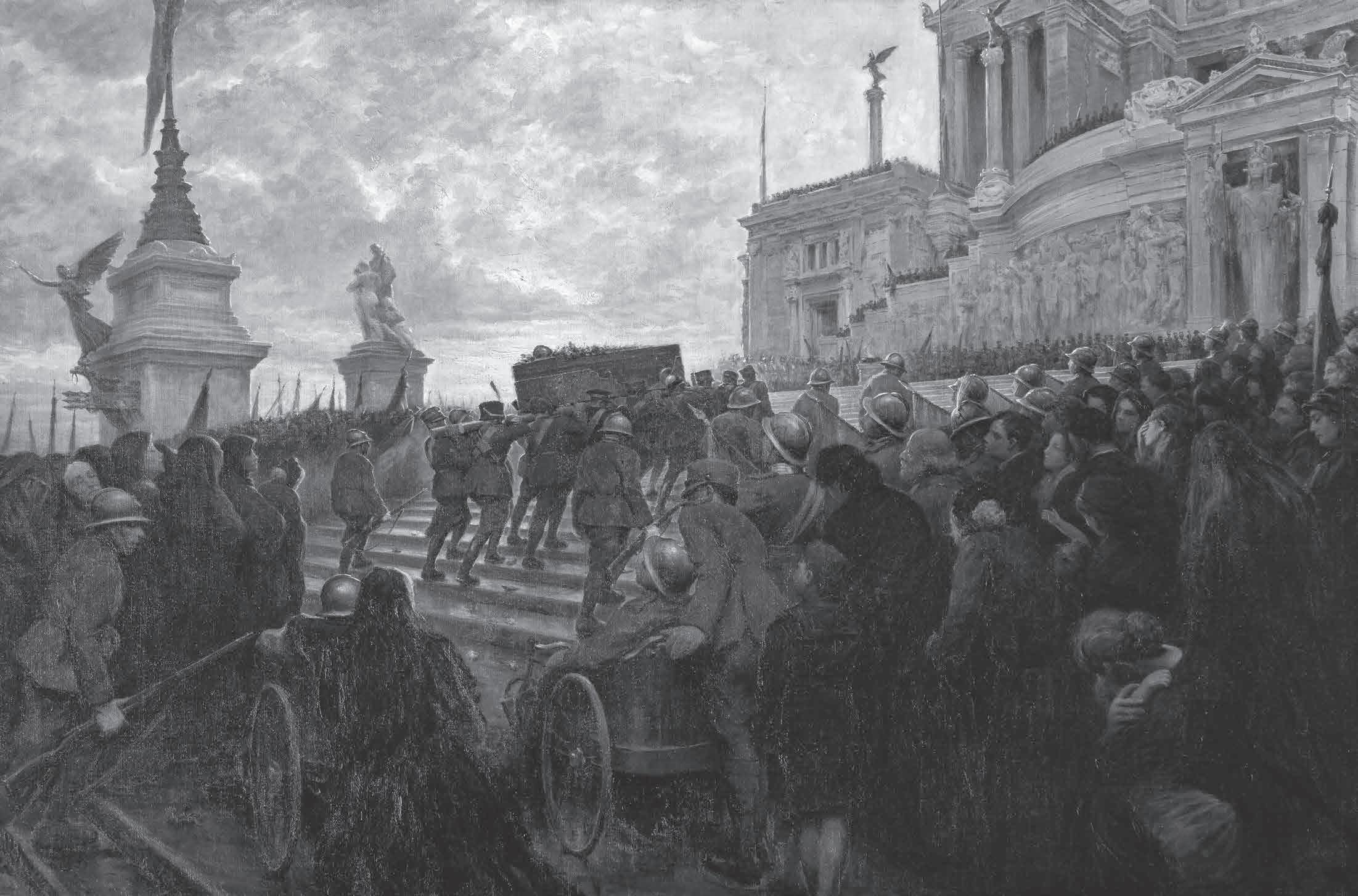 La Nazione parve così ritrovare una sua unità e poté accingersi, il 4 novembre 1921, a dare solenne sepoltura in Roma alle spoglie del Soldato ignoto. Fu un enorme rito collettivo, che ancora oggi non ha eguali, con il quale il Paese san civa, anche spiritualmente, l’uscita dalla stagione della guerra e l’ingresso in una nuova era di apparente concordia.