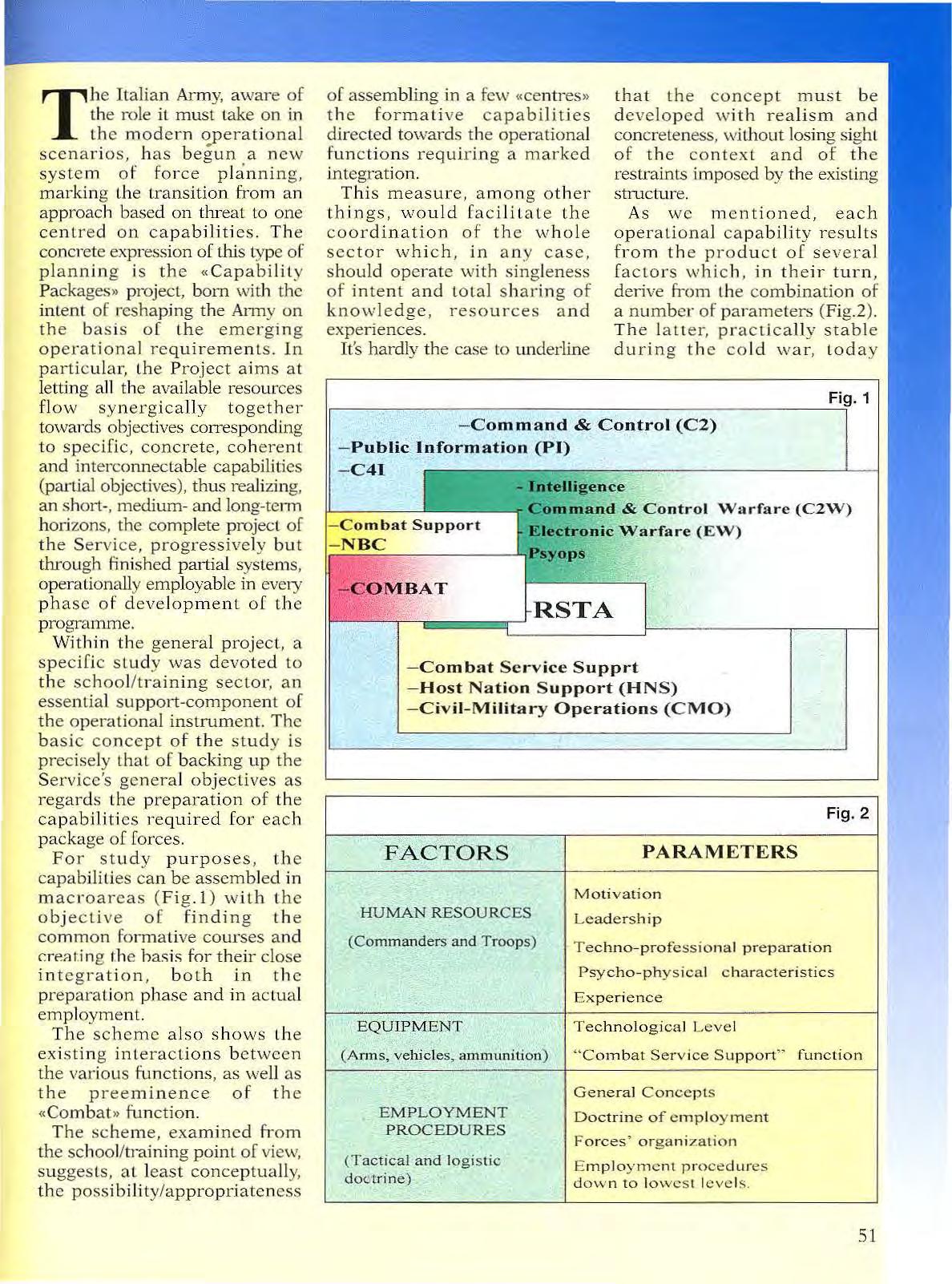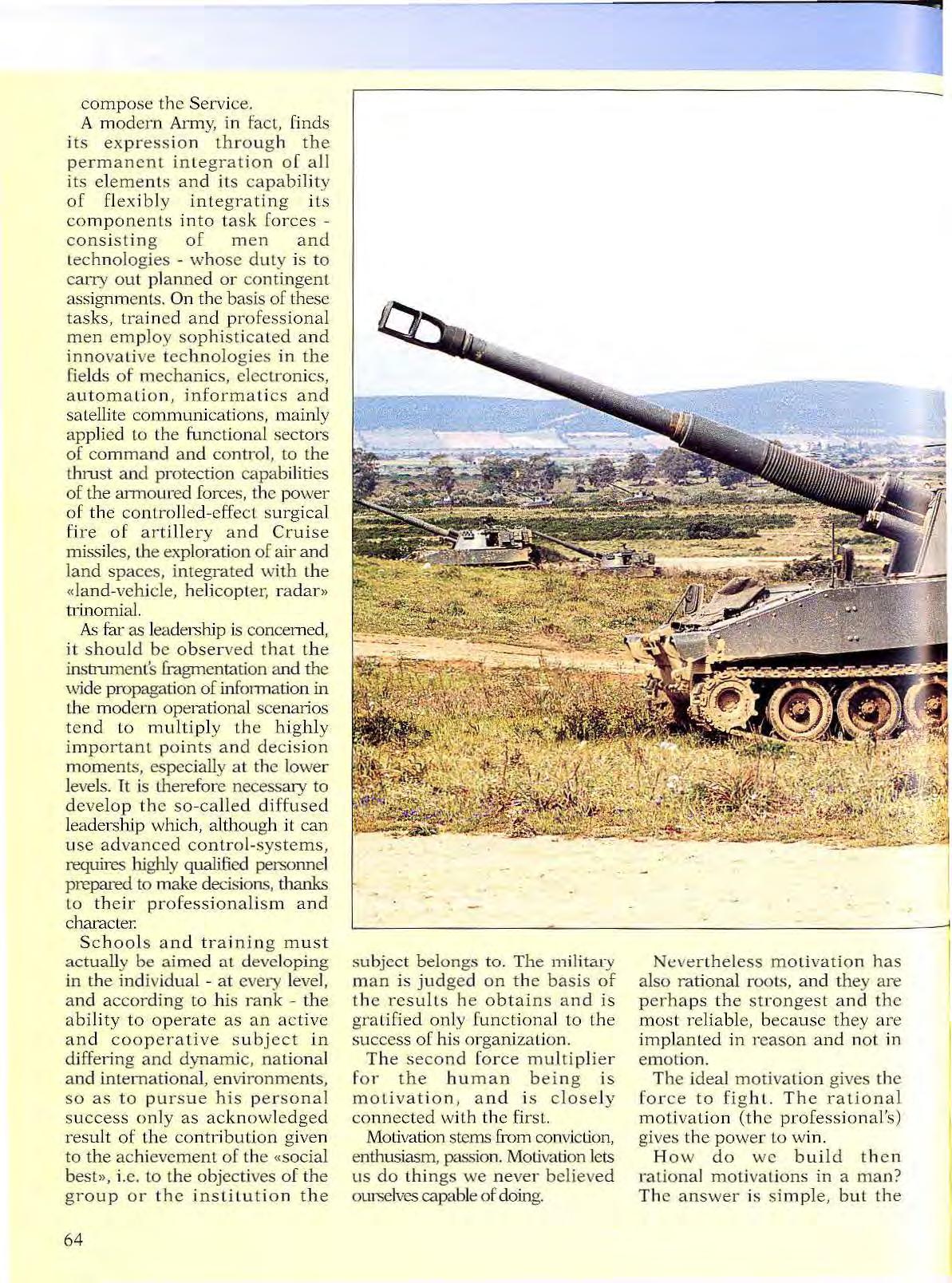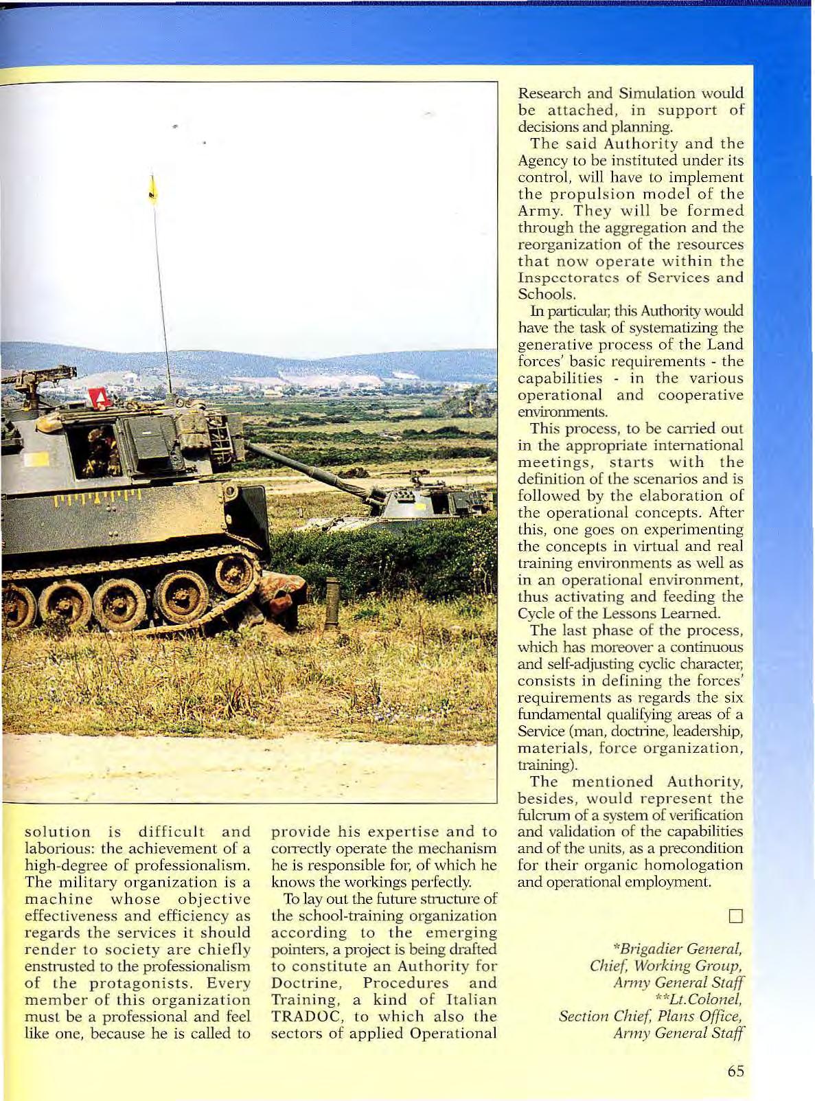 Rivlsta Militare aims at broadening and updating the technical and vocational training of Officers and NCOs. lt is thus a means of propagating the military way of thinking and a forum of study and debate. Through the publication of articles of technical and scientific interest, Rivista Militare also aims at inform ing the general public on the Army and on military issues.