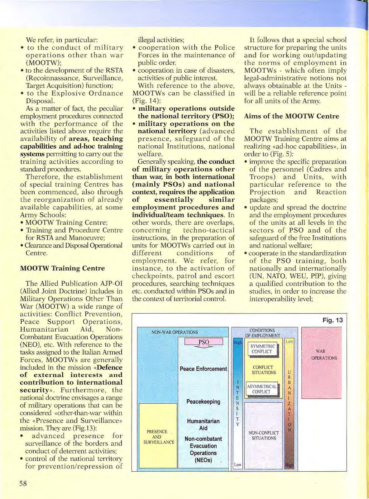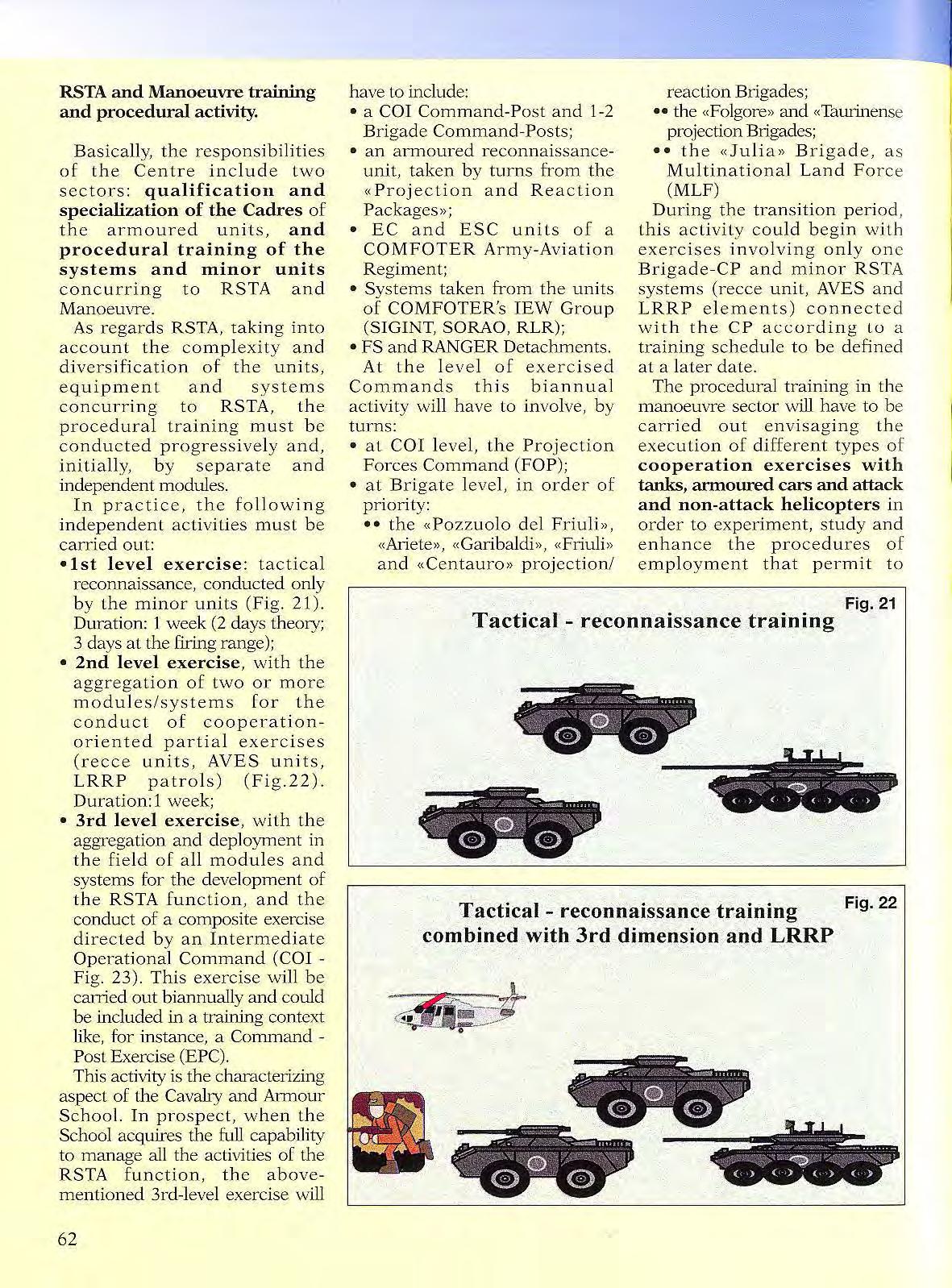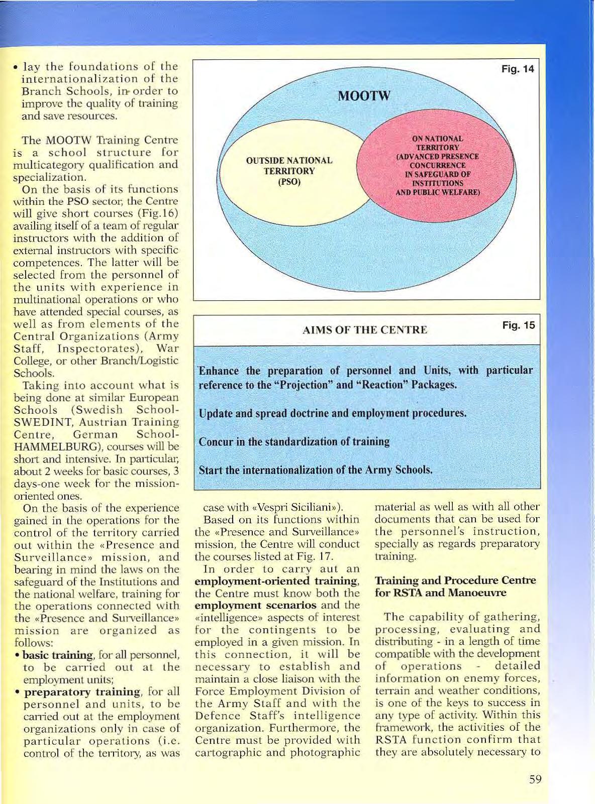 Rivlsta Militare aims at broadening and updating the technical and vocational training of Officers and NCOs. lt is thus a means of propagating the military way of thinking and a forum of study and debate. Through the publication of articles of technical and scientific interest, Rivista Militare also aims at inform ing the general public on the Army and on military issues.