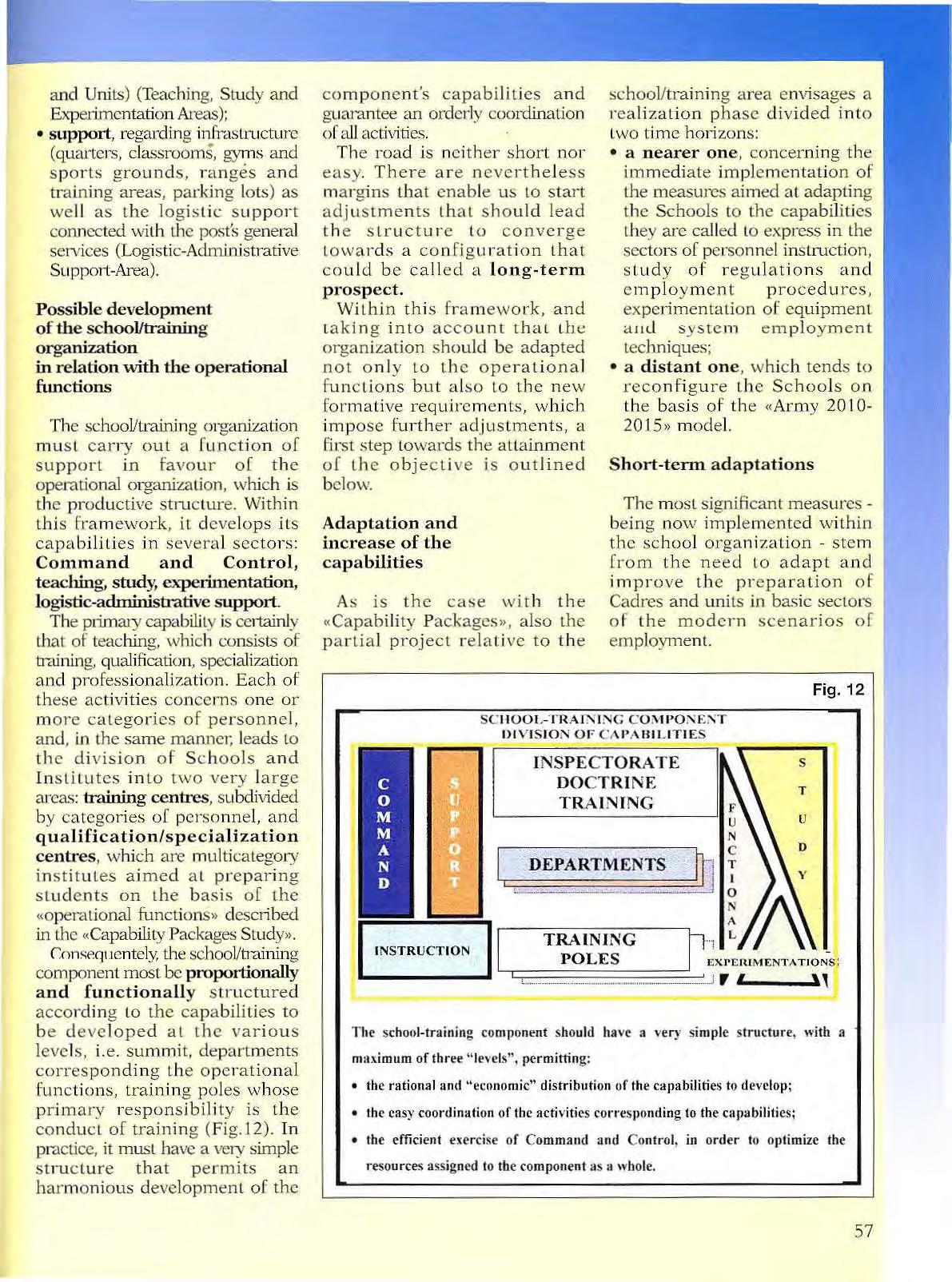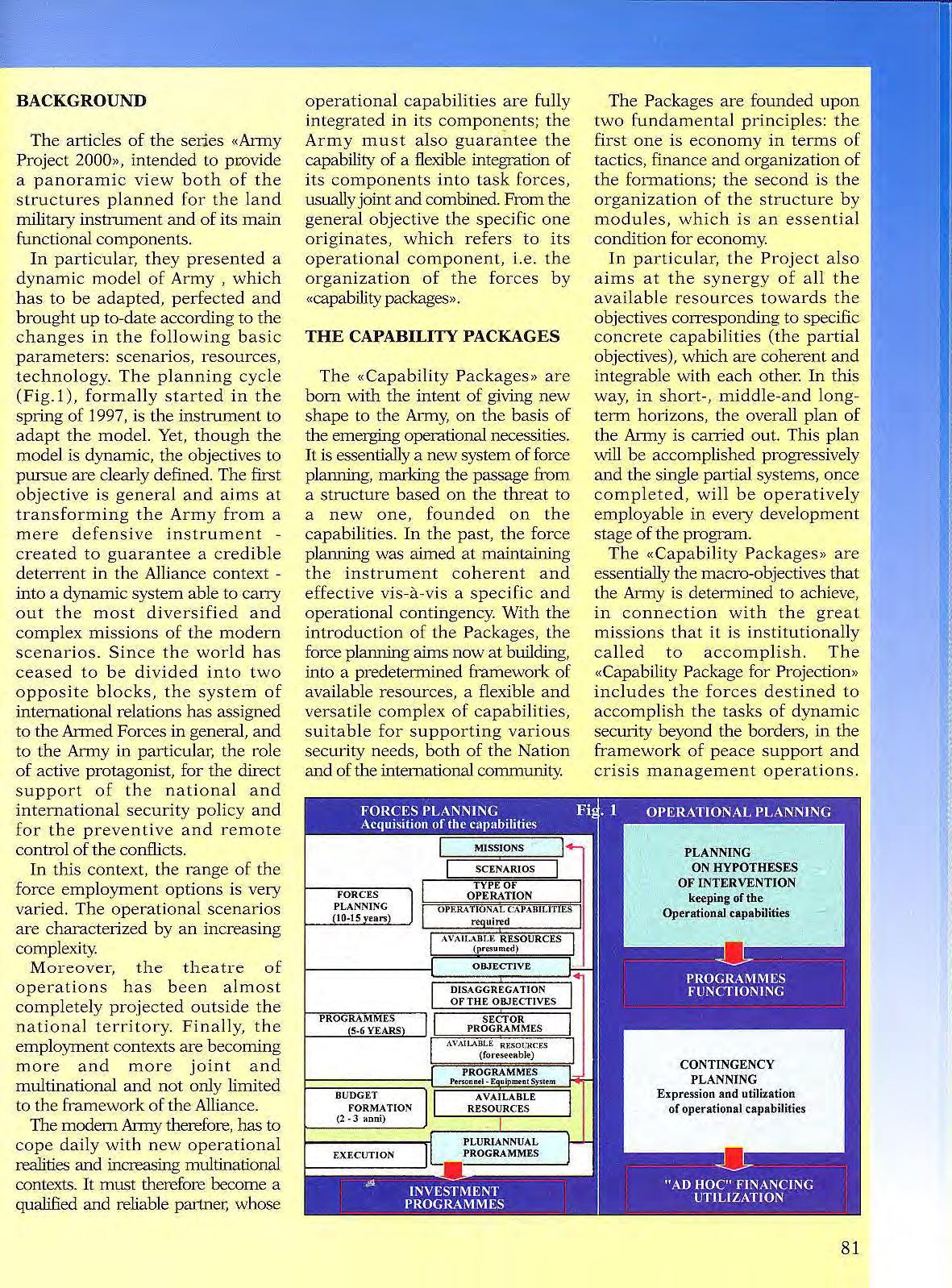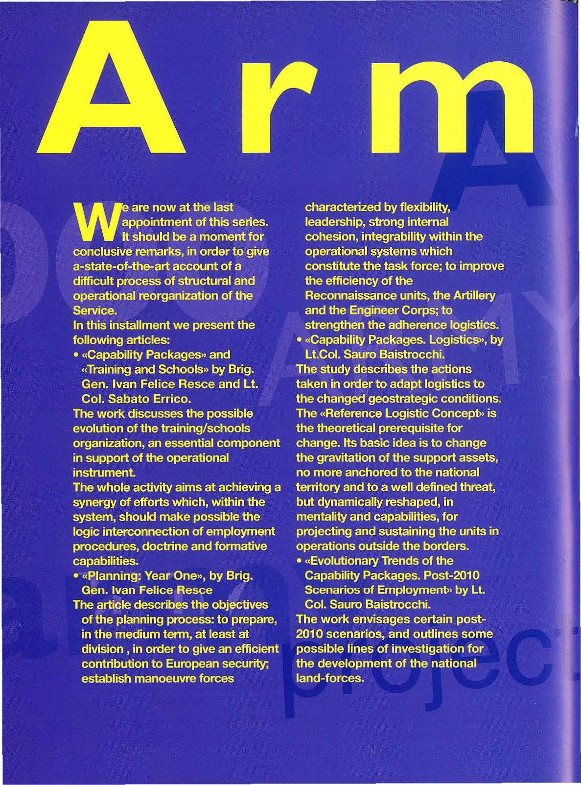 ligne d'evolution d es paquets de capacites. Les panoramas d' e mploi apres I'an 2010, par Sauro Baistrocchi (p. 92). L'article trac e u n tableau, e n donnent aussi des hypotheses d e panoramas d'apres l' an 2000, de quelq uc poss i ble directrice d'appro fondi ssement pou r le deve loppement d es forces de terre n at io nal es. Le proj et, e n consi d e rent les n ombrc u ses disponib ilites d es resso urces, est centre sur les soi-d isantes «s u per capacites», qui consistent en la possib ilite d'adapter la configu ra tion de !'instrument milita ire aux ex igences ch<mgeantes.