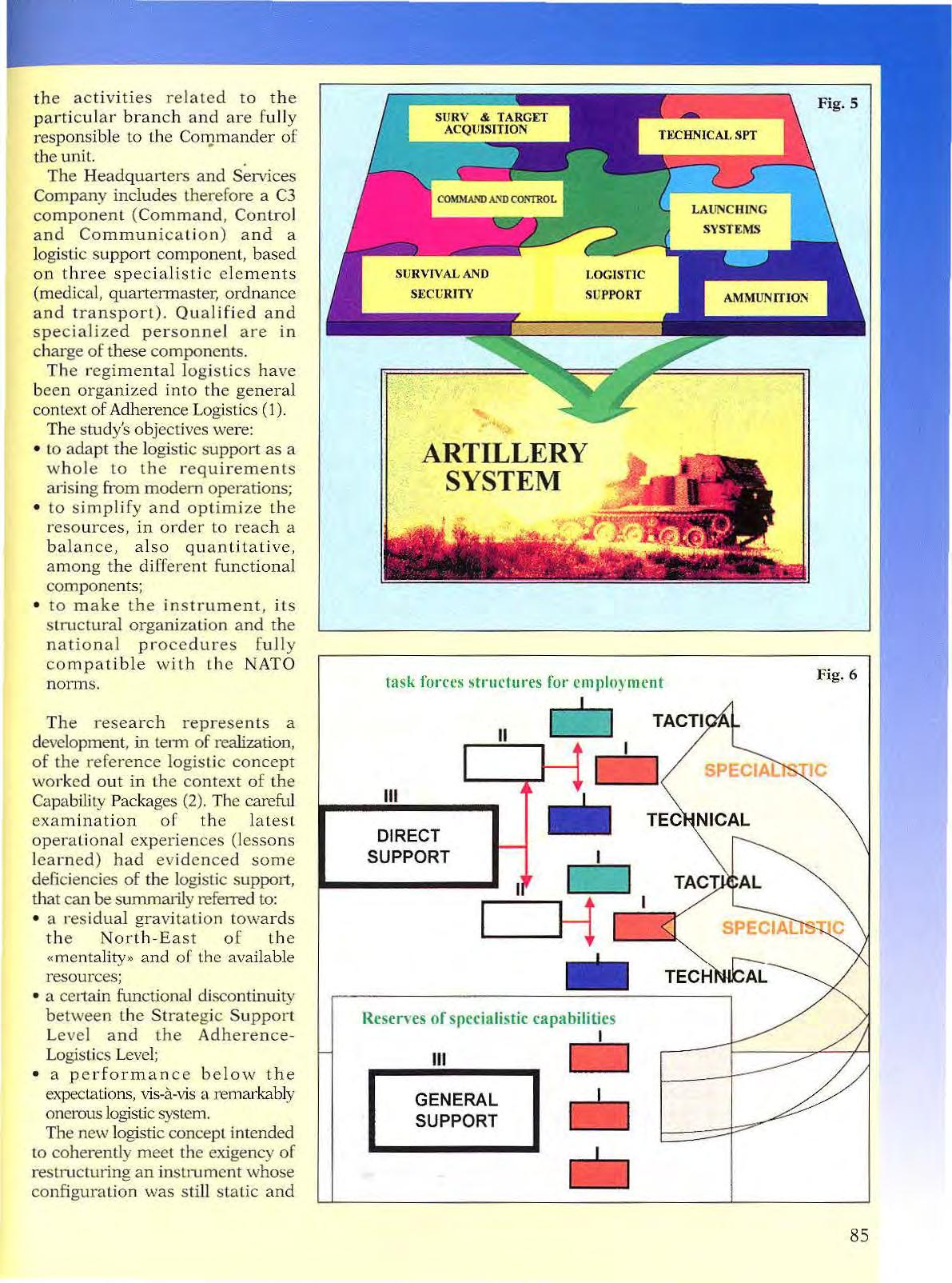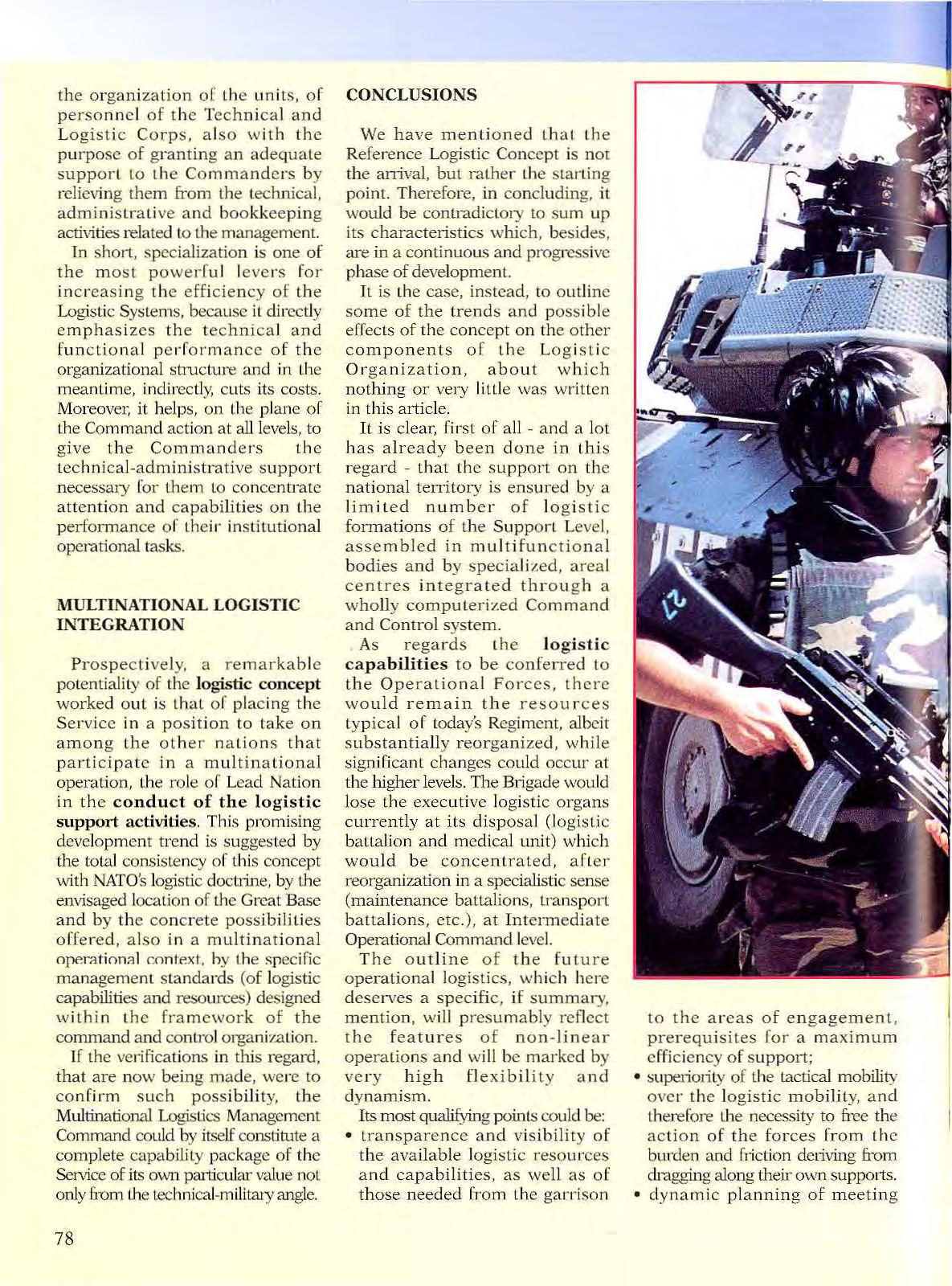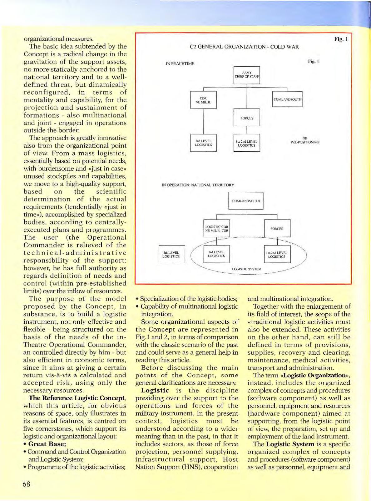 The reference logistic concept, approved at the end of 1997 , and novv on the way to a gradual implementation, marks the transition to a modular logistics, resolute ly oriented towards the projection and support of forces in operations outside the borders. It is cenb:ed or1 the preventive planning and development of activities, conducted by centralized organizations, organically subordinate to a technical command-system, but under the operational control of the Commanders of the tactical formations supported.