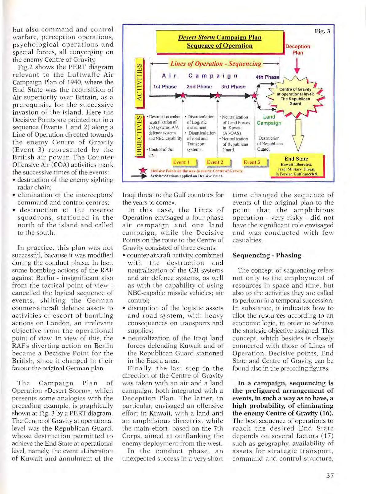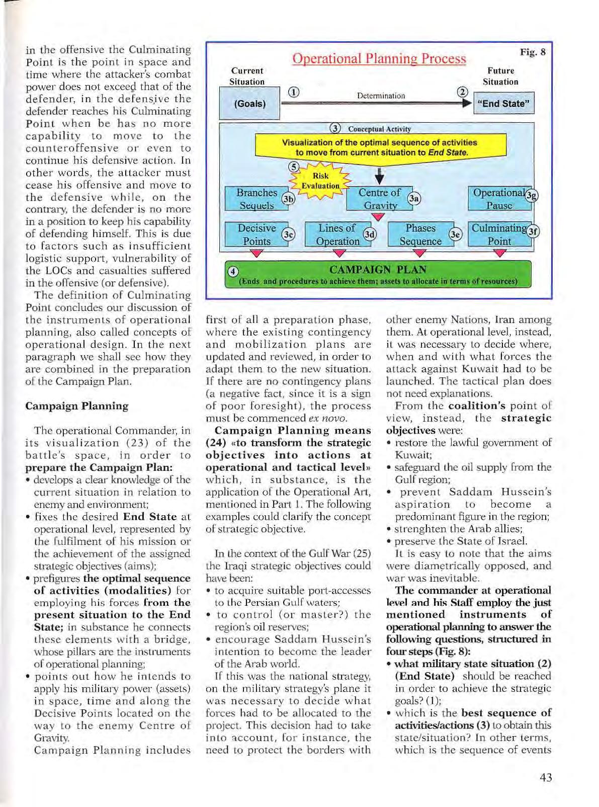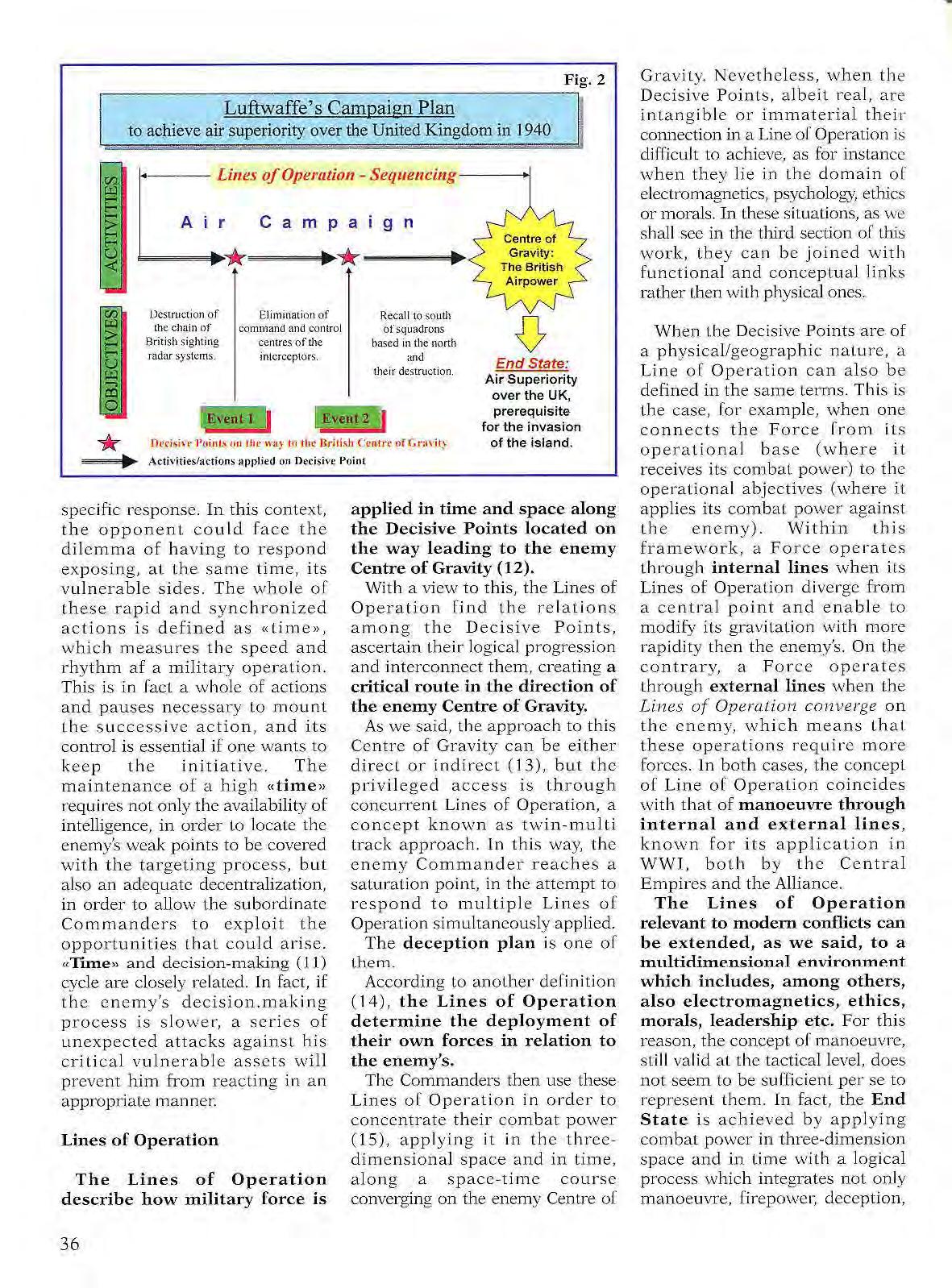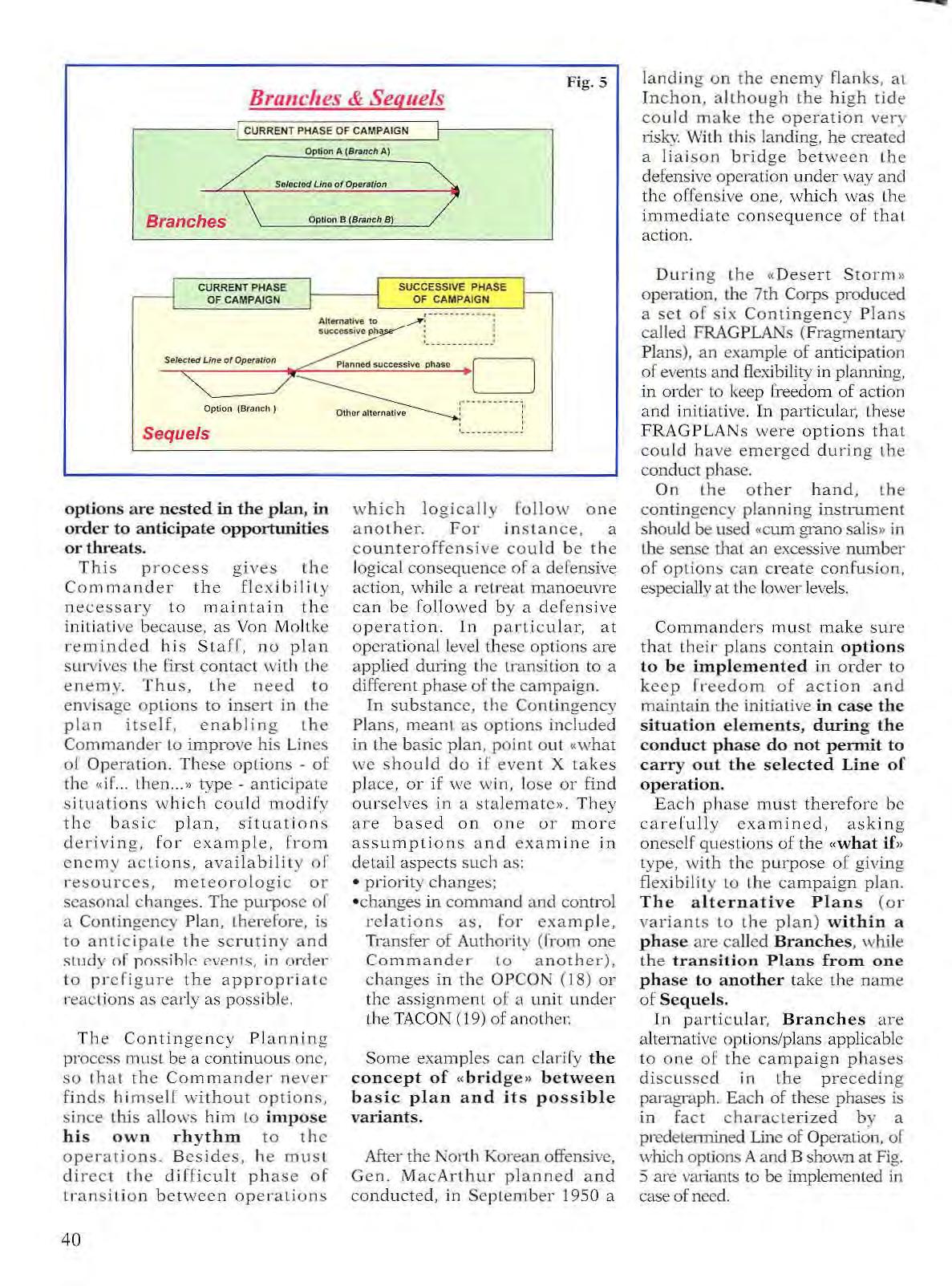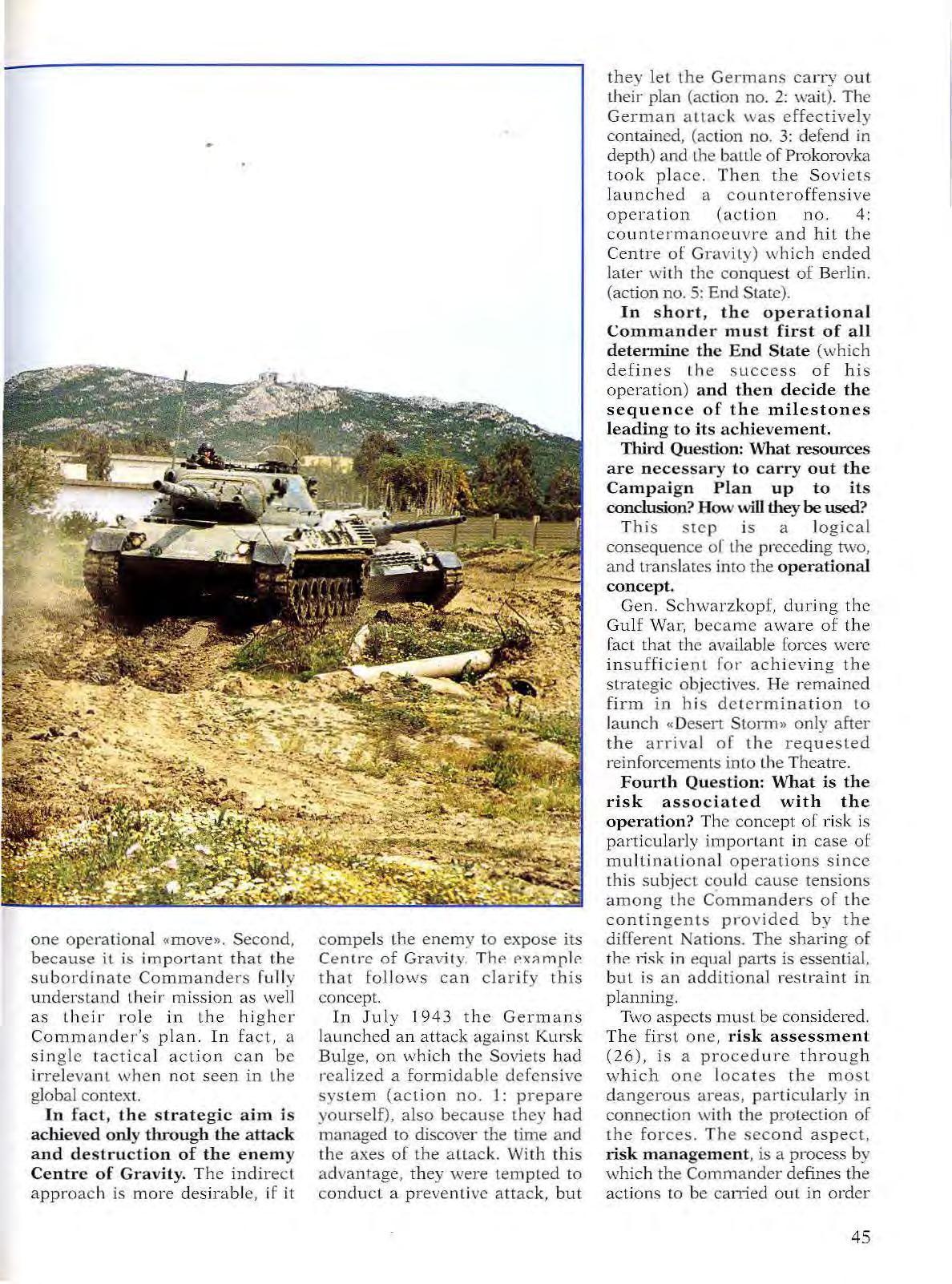 La planification operationnelle par Pier Paolo Lunelli (p. 32). Le recours a u jeu d es echecs sert pour expliquer des idees impo r ta n tes telles gue ll es le centre de gra vite, les !ignes operationnelles, les object ifs, les rorces dep]acees («assets»), les conceptions ( «ass umpLions »), la pla nification . Ce t article , le deuxieme de la serie, trace le tableau des i nterconnexions doctlinales existantes p am1i les points d ec is i fs, les phases et les suites operationnclles, la pla n.ifi.ca tion de contingence et le poi nt culminant. Des exemples