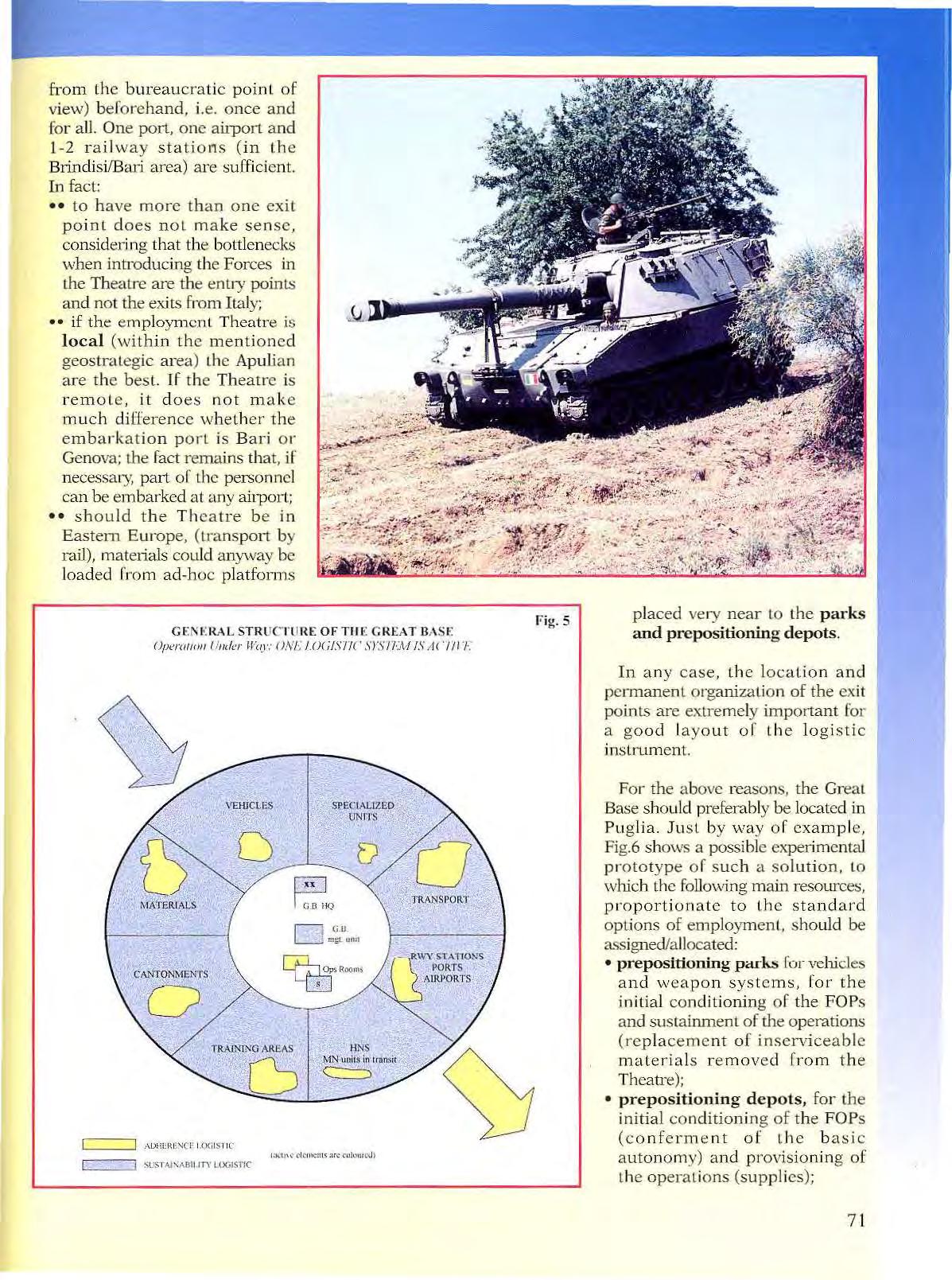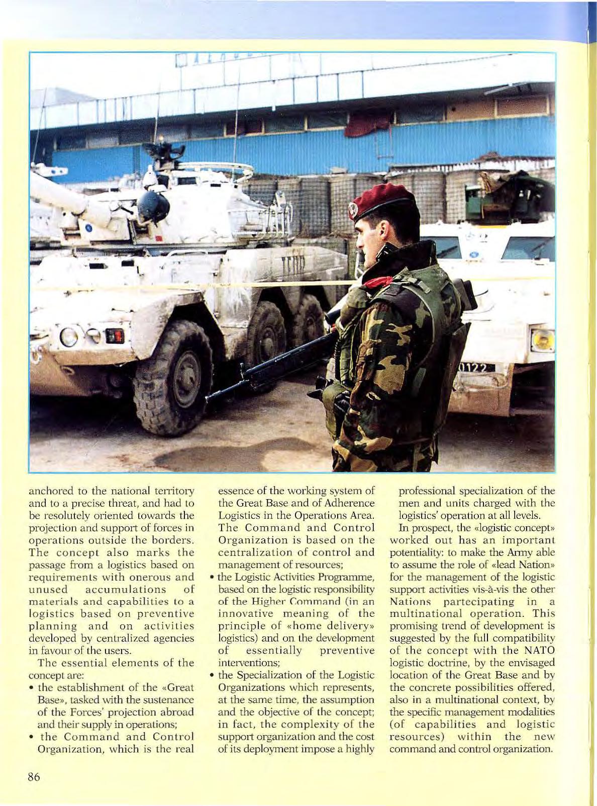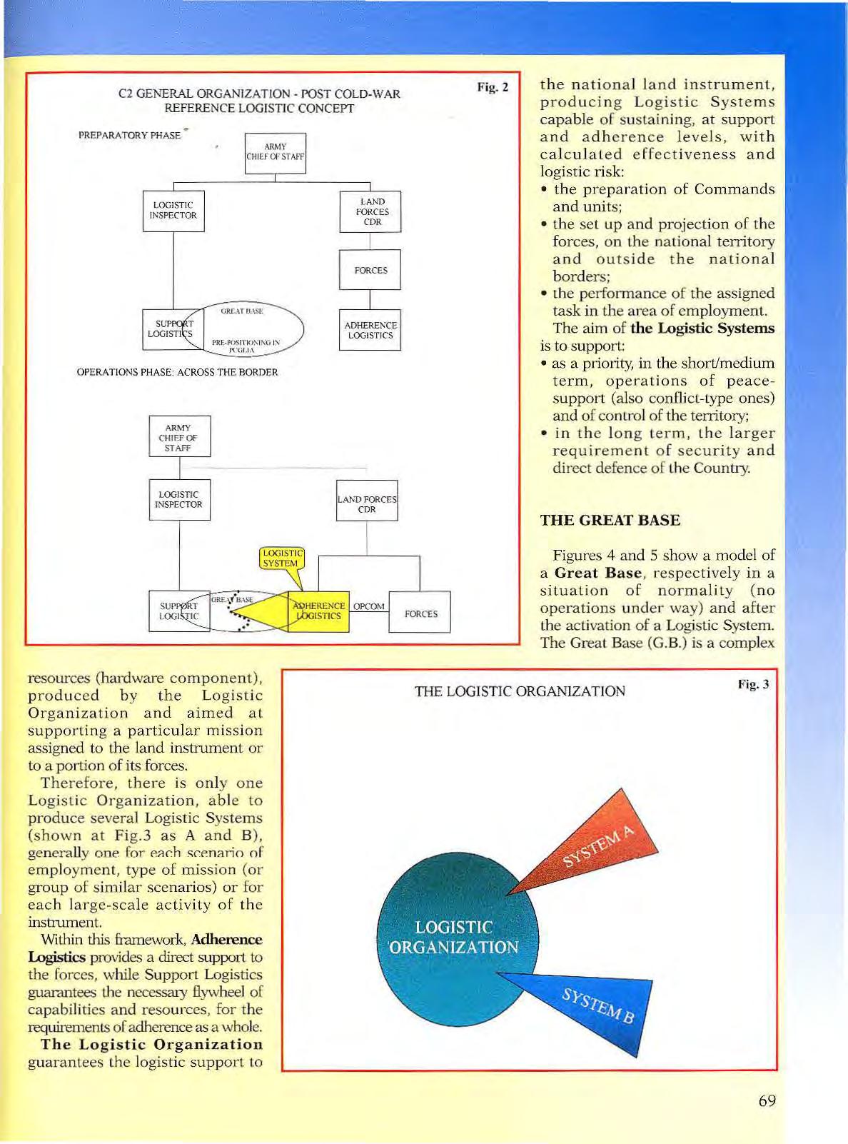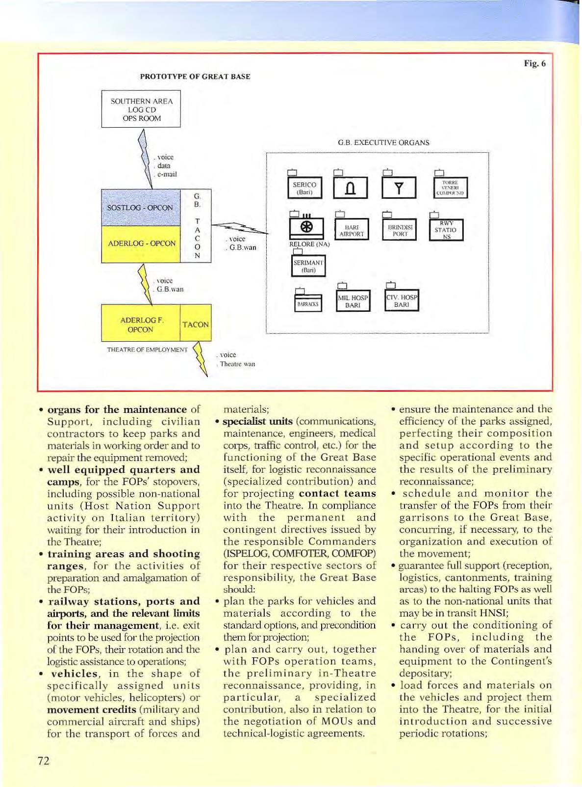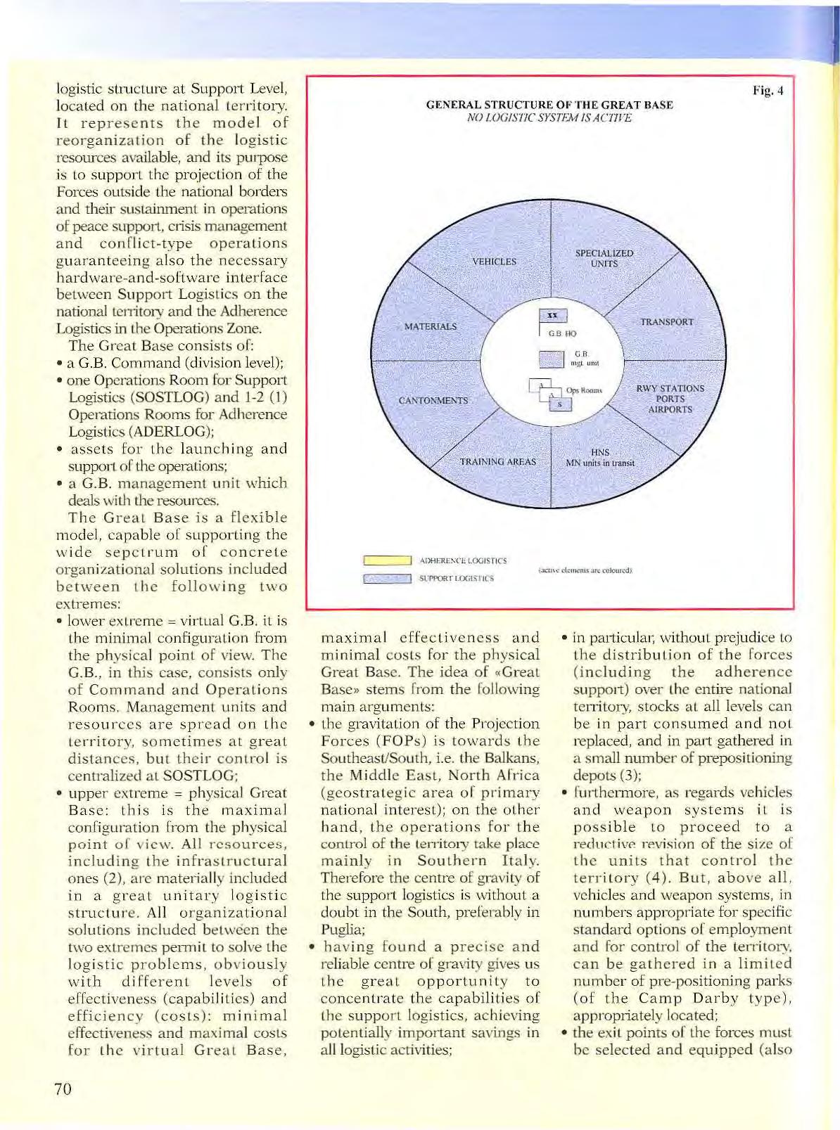 In particular, the concept envisages the reorganization of the resources available according to the Great Base model, destined to support the projection of the Forces outside the borders, and their sustenance in peace -support and crisis-management operations, as well as to establish the interface structm e between Support Logistics - which operates on the national territory m1der the responsibility of the Logistic Inspector - and the inTheatre Acll1erence Lof,ristics, which is in the sphere of the Force Com1nande1: