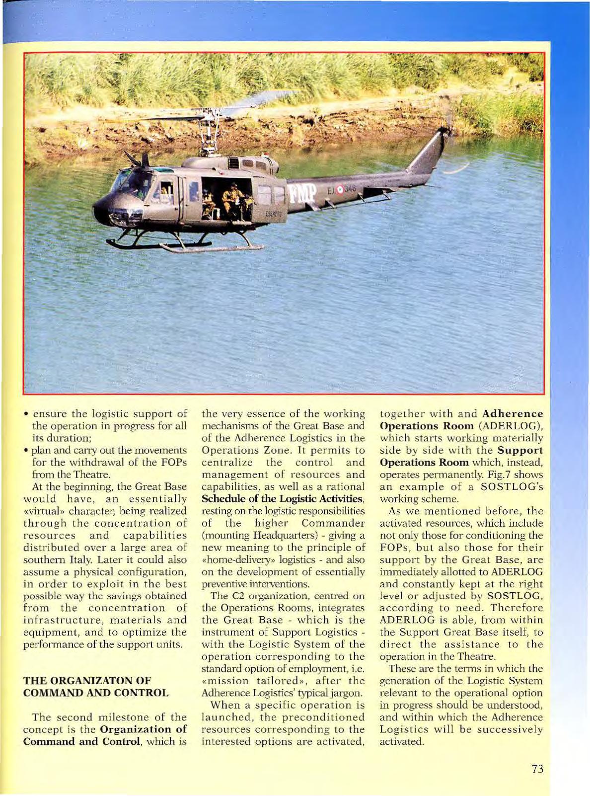 could also assume a physical form, in order to exploit to the utmost the savings deriving from the cenLrali7.ation of materials and assets and to optimize the performance of the support units. Another cornerstone of the concept is the peculiar Command and Control Organization, which is the real essence of the working mechanisms of the Great Base and of the Adherence Logistics in the Operations Zone. This organization permits to centralize control and to manage resources and capabilities, as well as prepare a rational Programme of Logistic Activities, centred on the logistic responsibility