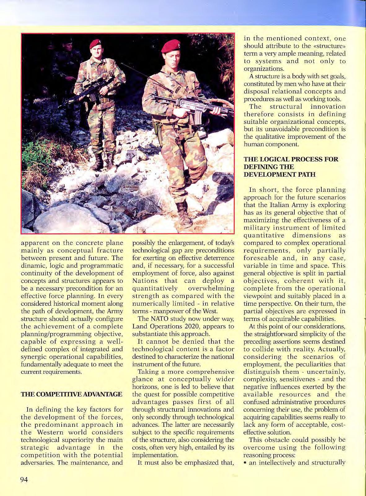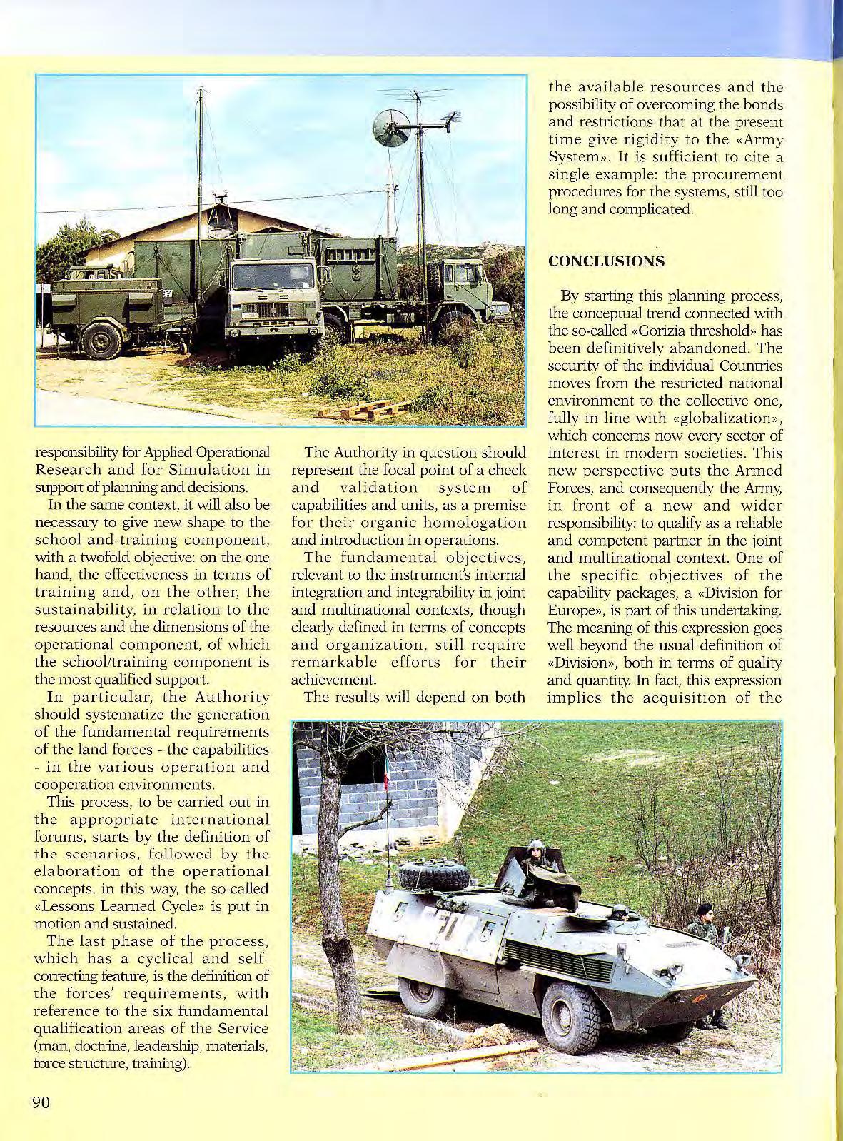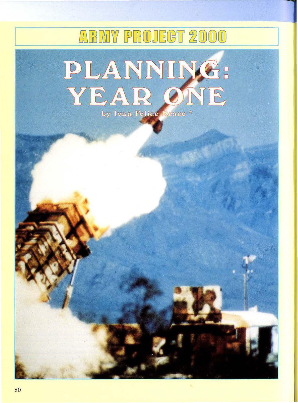 E jercito. Proyecto 2000. Planificaci6 n a:fi.o primero, de l van F e llcc Resce (p. 8 0 ) . E l arti c u lo descr ibe los objct ivos del p ro ceso de p lan i ficaci o n : apro ntar e n e l medi a tcrmin o un compl cjo de fue rzas por lo menos d e n ive l divisio n al p ara contrib ui r con eficacia a la seguredad e uropea; constituir fuerzas de man iabra carac teriza da s de flexih ledad d e e mpleo, «leadershi p», difundido a c u cr do int erno , integ rabil iclad en Ios ambi tos de Ios s istemas o p erativos constituen tes la «task force» para el em p lea; hacer mas eficaces las unida d es explorantes, la Artillerfa y c l G e ni o, p otencia r la logist ica de a dherencia. U n prayec to a m bicioso qu e pu e d e se r reali zad o dentro de l 2000.