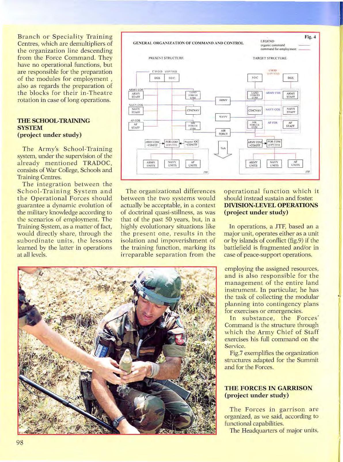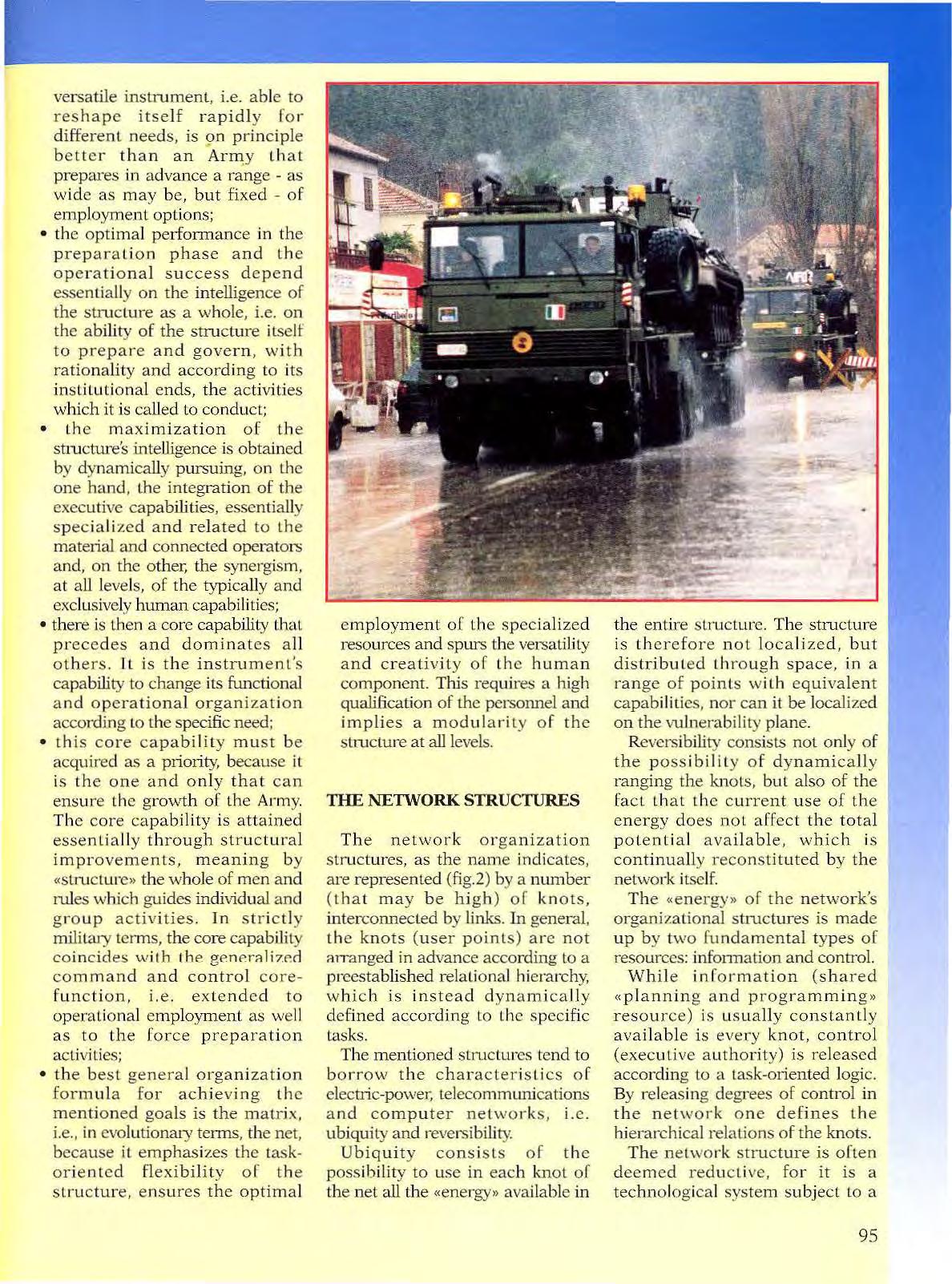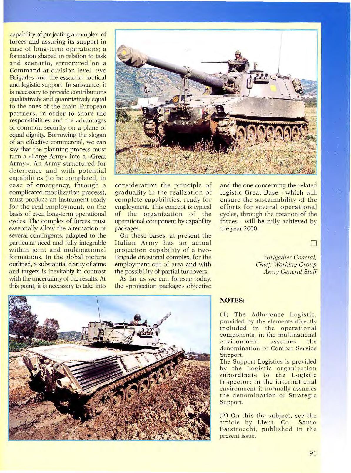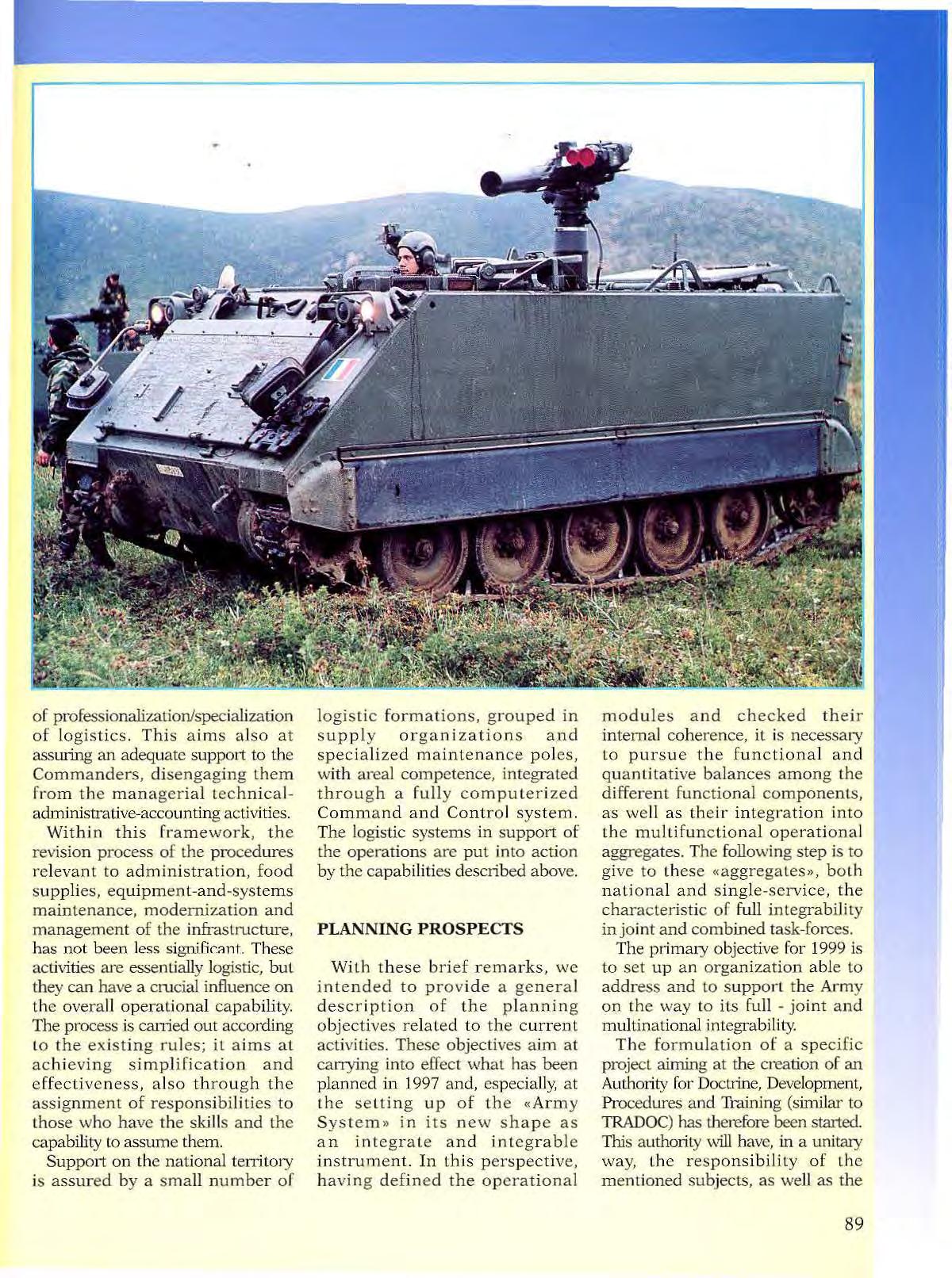 E jercito. Proyecto 2000. Planificaci6 n a:fi.o primero, de l van F e llcc Resce (p. 8 0 ) . E l arti c u lo descr ibe los objct ivos del p ro ceso de p lan i ficaci o n : apro ntar e n e l medi a tcrmin o un compl cjo de fue rzas por lo menos d e n ive l divisio n al p ara contrib ui r con eficacia a la seguredad e uropea; constituir fuerzas de man iabra carac teriza da s de flexih ledad d e e mpleo, «leadershi p», difundido a c u cr do int erno , integ rabil iclad en Ios ambi tos de Ios s istemas o p erativos constituen tes la «task force» para el em p lea; hacer mas eficaces las unida d es explorantes, la Artillerfa y c l G e ni o, p otencia r la logist ica de a dherencia. U n prayec to a m bicioso qu e pu e d e se r reali zad o dentro de l 2000.