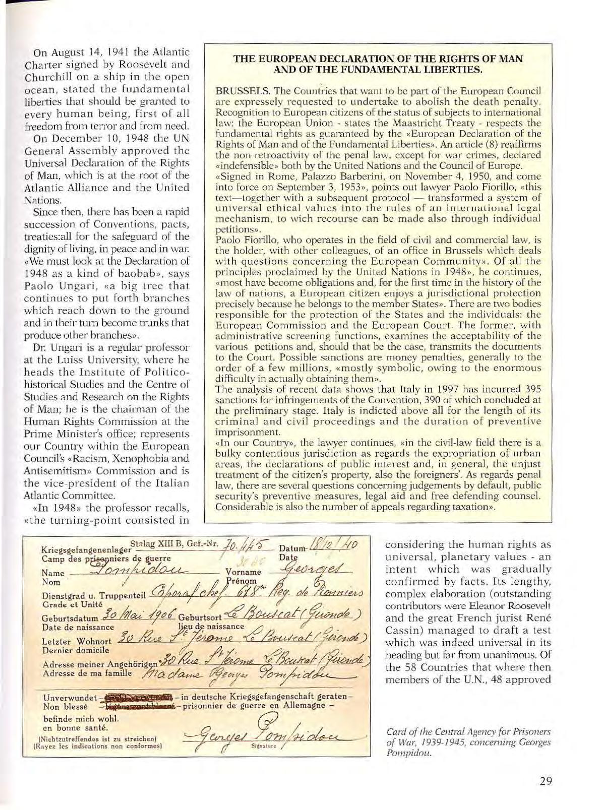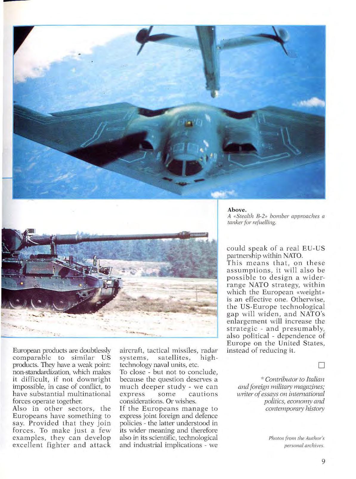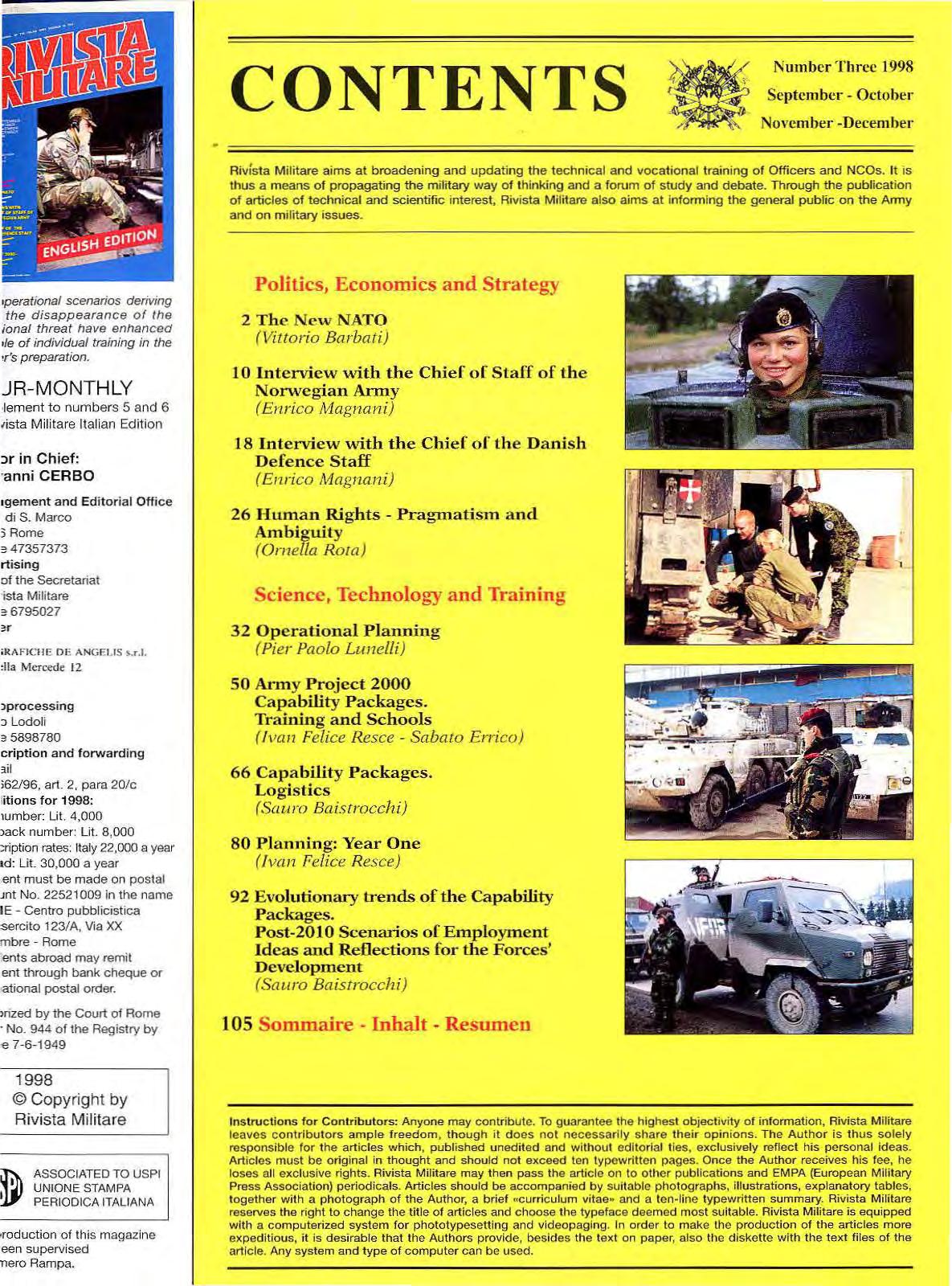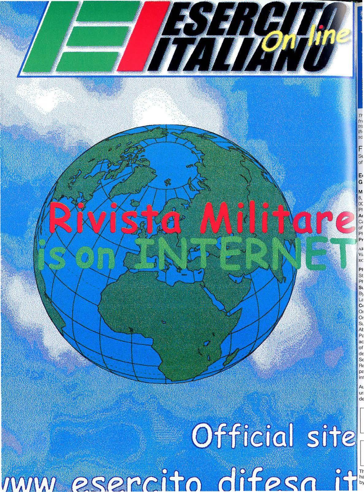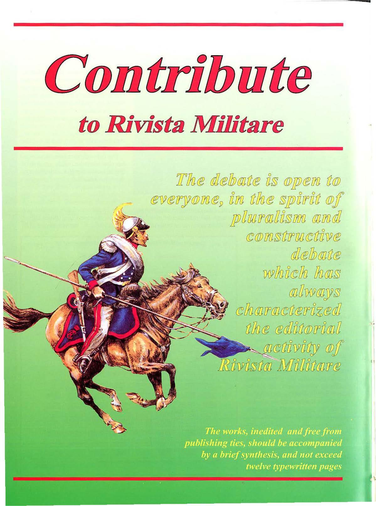 Instructions for Contributors: Anyone may contribute. To guarantee the highest objectivity of information, Rivista Militare leaves contributors ample freedom , though it does not necessarily share their opinions. The Author is thus solely responsible for the articles which, published unedited and without editorial ties, exclusively reflect his personal ideas. Articles must be original in thought and should not exceed ten typewritten pages. Once the Author receives his fee, he loses all exclusive rights. Rivista Militare may then pass the article on to other publications and EMPA (European Military Press Association) periodicals. Articles should be accompanied by suitable photographs. illustrations, explanatory tables, together with a photograph of the Author, a brief «curriculum vitae and a ten-line typewritten summary Rivista Militare reserves the right to change the title of articles and choose the typeface deemed most suitable Rivista Militare is equipped with a computerized system for phototypesetting and videopaging In order to make the production of the articles more expeditious, it is desirable that the Authors provide, besides the text on paper, also the diskette with the text files of the article Any system and type of computer can be used.