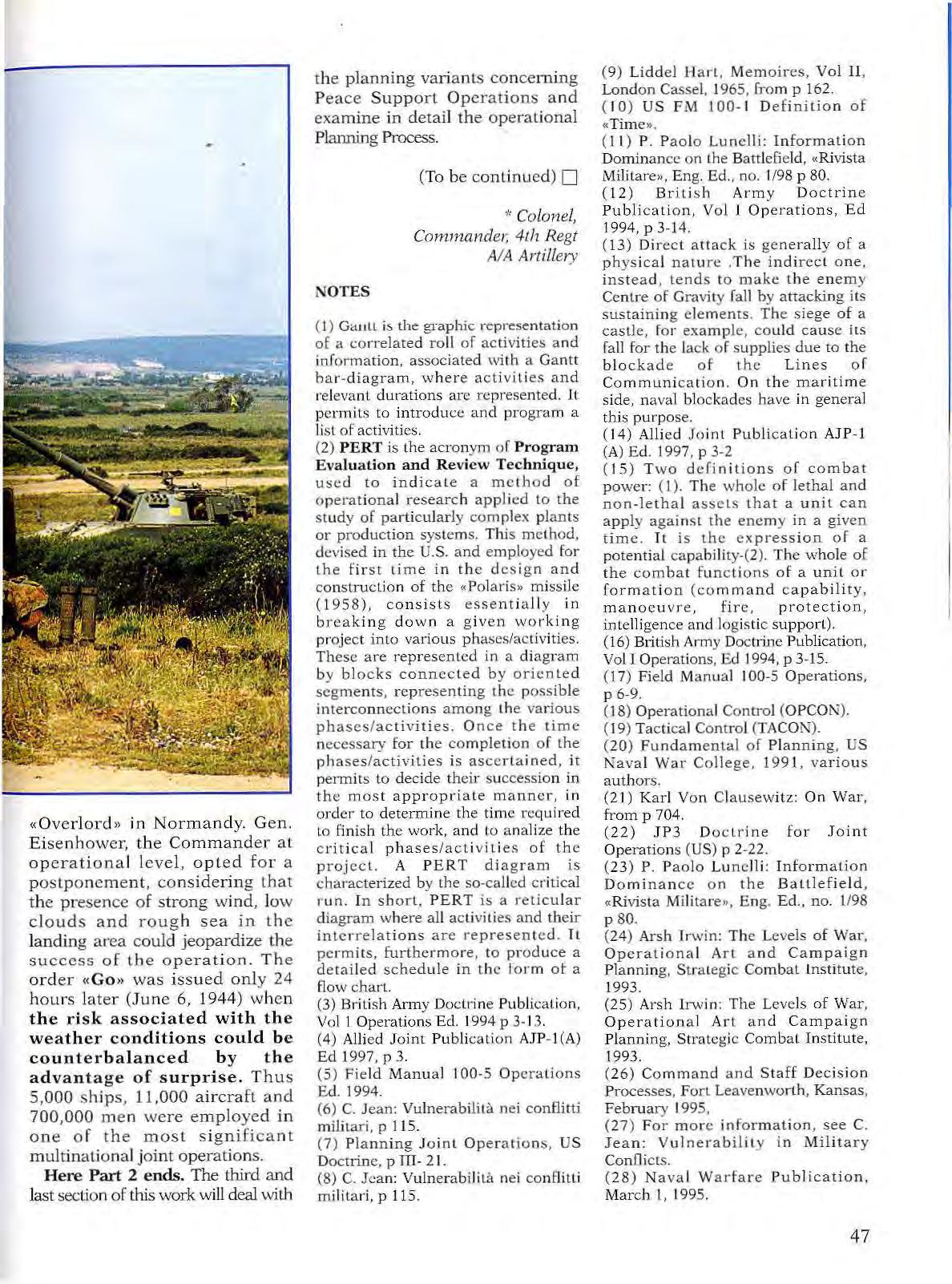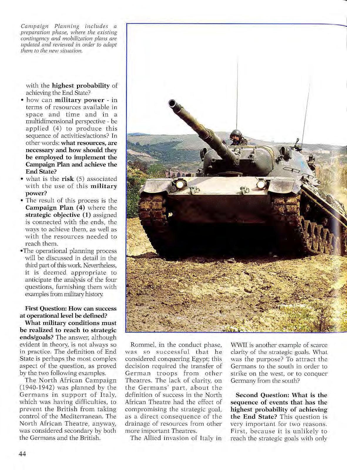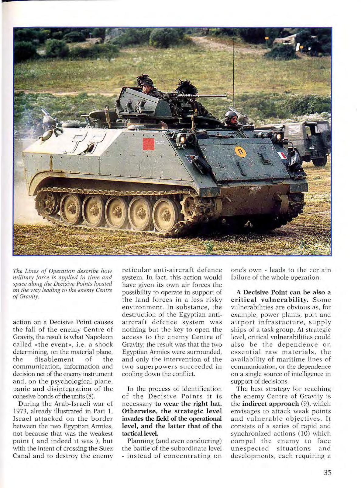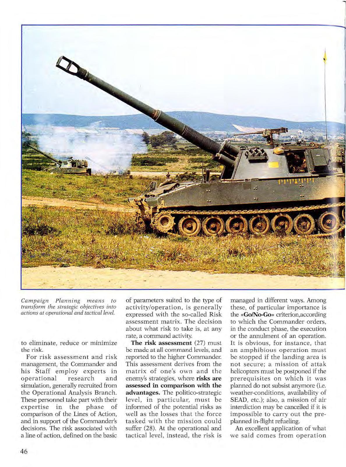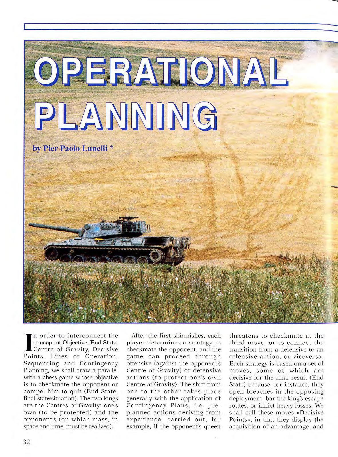La planificaci6n operativa de Pier Paolo Lunelli (p. 32). El recu rso al j uego de ajeclr-ez es necesari o pa r a ex plica r can ceptos impo rtantes como e l c e ntra de gravi d ae!. las lineas operativas, Ios abjet ivos las fuerz a s dispuestas («ass e ts»), I as conce pc iones (« assum p t ions»), la p lani ficaci6n. El articul o, seg undo de la ser ic, traza las in te r ca ne z iones doc t rinal es existe ntes en t r e Ios puntos clefinitivos, las fases y las secu enc i as operativas, la planificaci6n de continge n cia y e l p un t o c u mbre . Algunos ejemplos c oncret o s sirven para acl arar la exp osi c i6n.