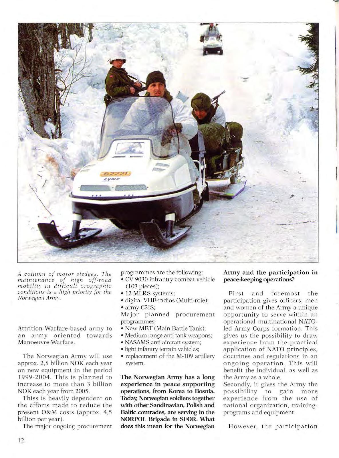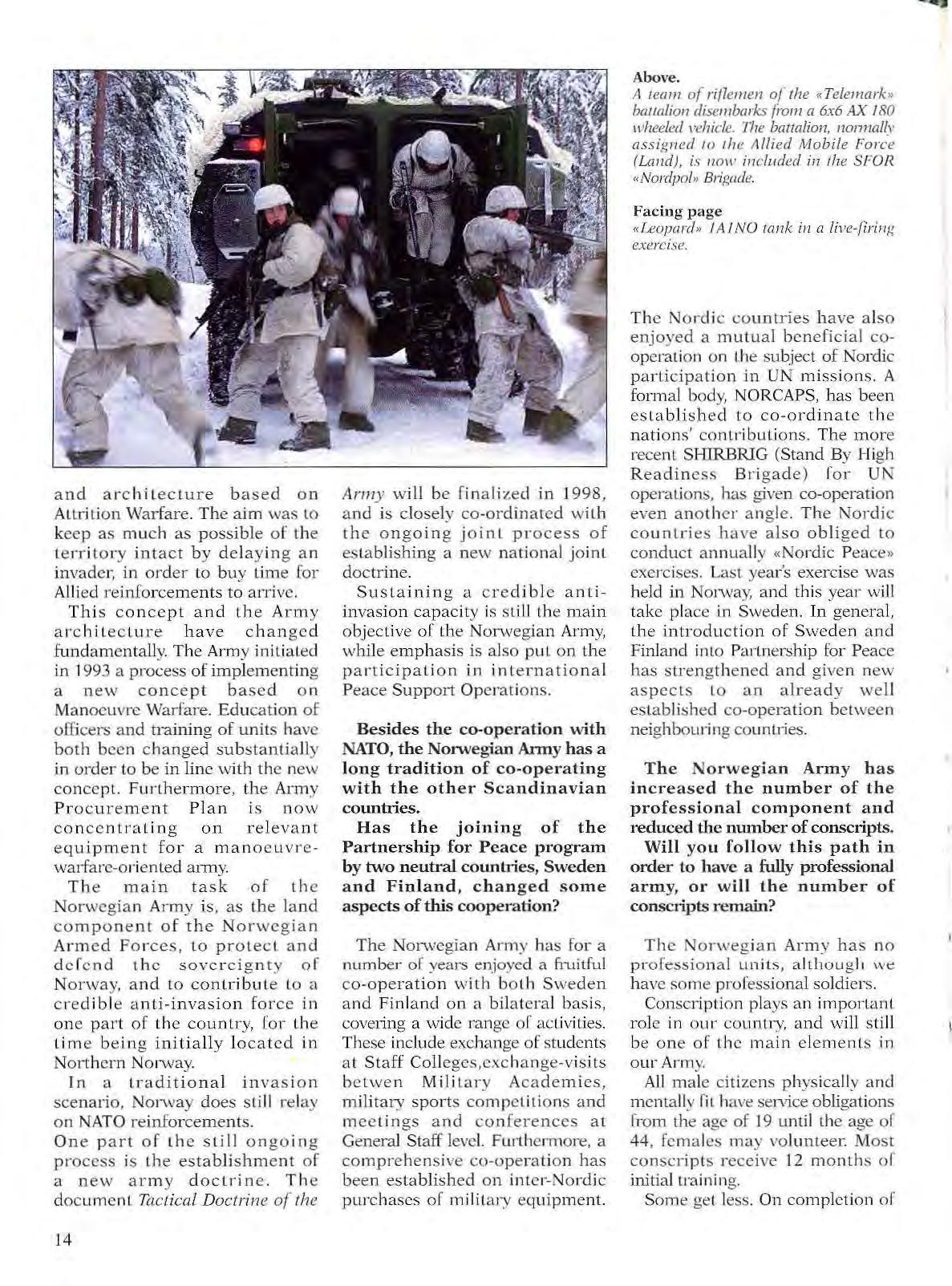 De 1993l'Arrn ee de T erre nm-ve gienne a subi un e reduction du 50% en termes de force e t d'unit es . On compte de r6du ire aussi les rrai s ord in a ires d' enlrel.ien en l"a veur d e n o uv ea ux p rogrammes d'inves tisseme nts. Les experiences dans le domaine de l'OTAN ont produit de determinant es innov at ions p o ur ce qui concerne !'orga ni sa tion , !'in s tru c ti on, les moyens et la doctr ine m ilita ir e. La Norvege ne renoncera pas a u se1-vic e ob ligato ire pour ses ciroyc n s masculins ayants entre 19 Cl 44 an s (et le service vol ontaire pour l es femmes). Les li e ns avec !'Alliance Allantique et la stricte collaboration avec les Etats-Unis, le Ro ya u me-Un i , l'Hollande, l'Allema gne et les Pays scandinaves reslanls inc h anges .