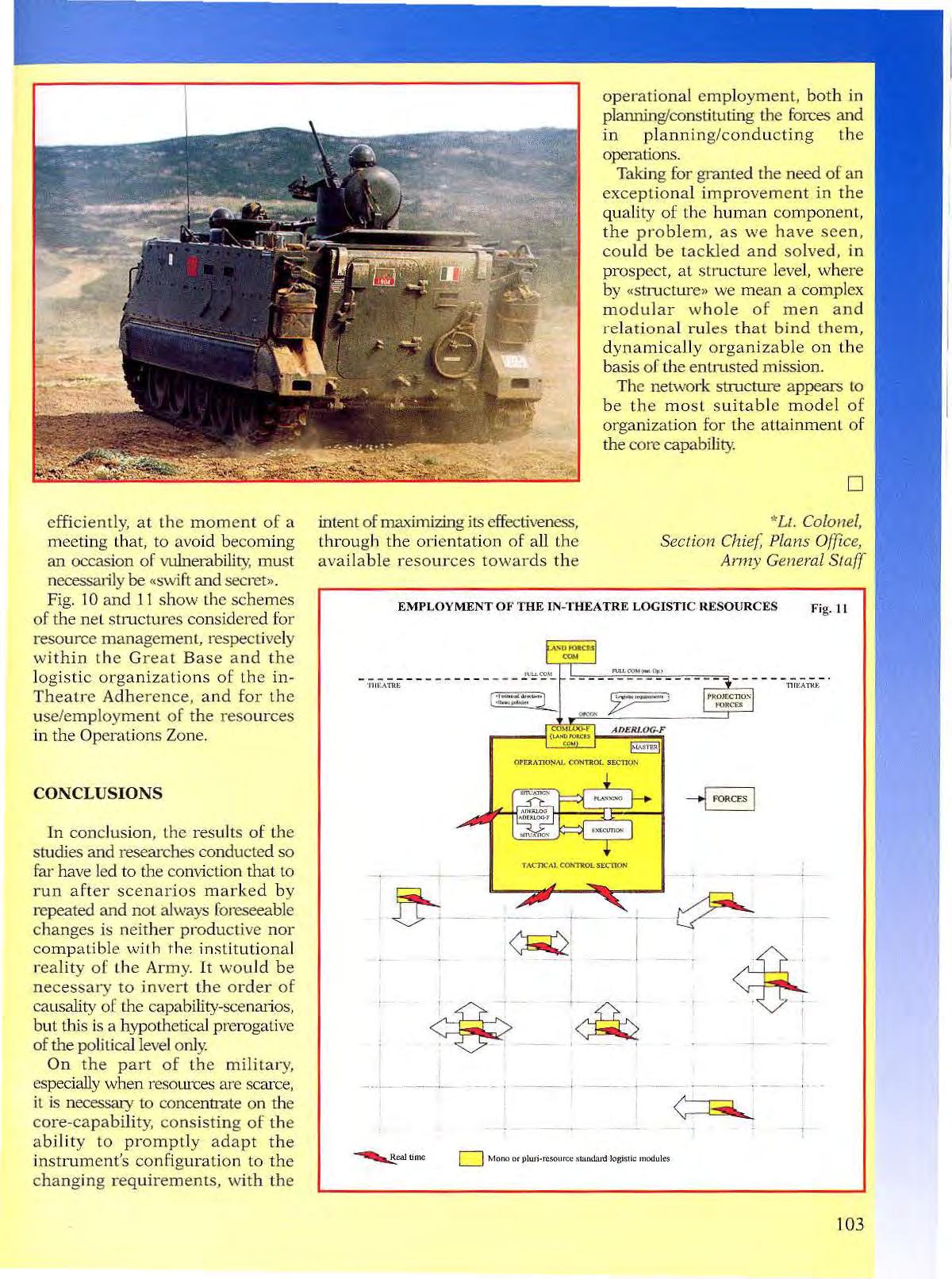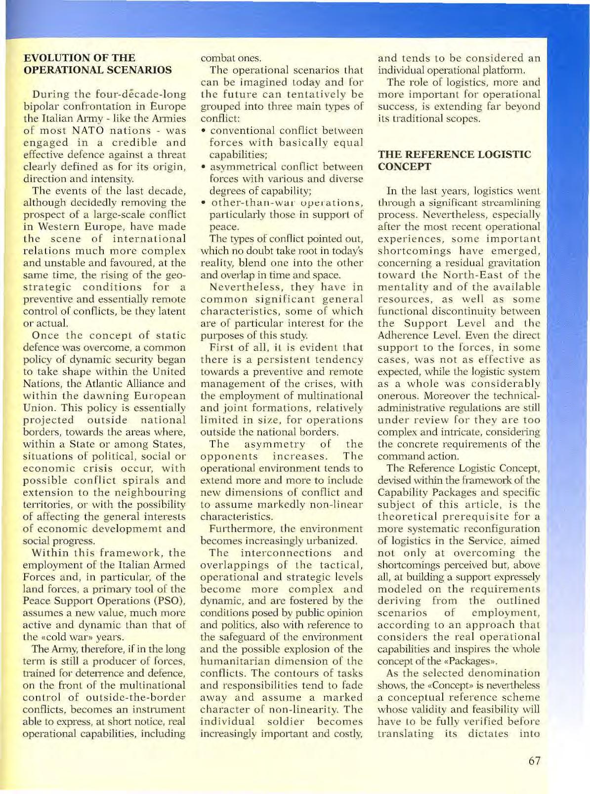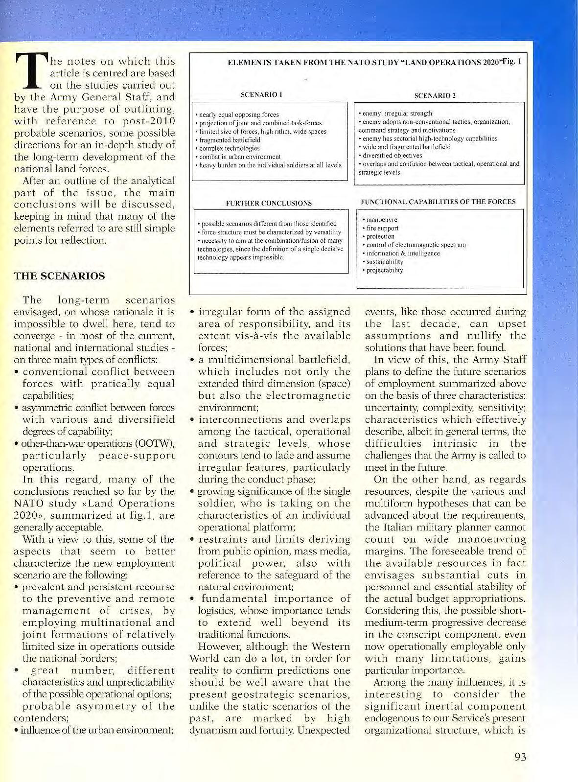 In conclusion, the result s of th e studies and researches conducted so far have led t o the co nviction that to run aft er scen ario s marke d by repeated and not always foreseeable cha nges is neith er productive nor co mp atib le wi t h t h e in stitu tio na l rea lit y of the Army I t wou ld b e nec essary to invert the o rder of causality of the capability-scenarios, but this is a hyp othetical prerogat ive of the political leve l o nly.