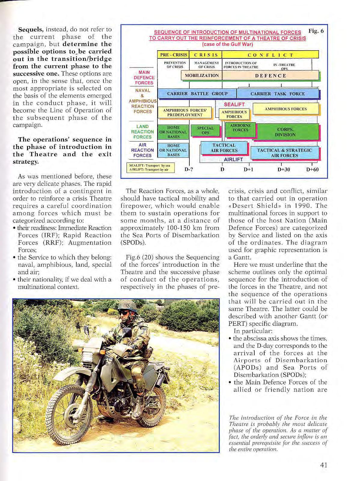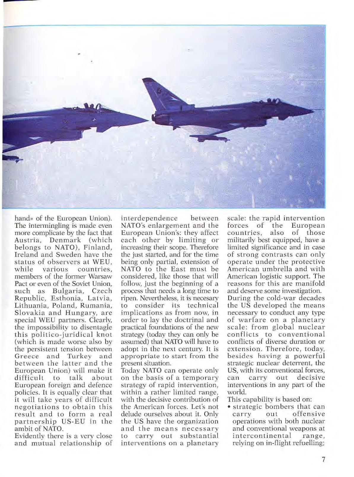 int erdepe nd ence bet ween NATO's enlargeme nt and the Europea n Union's: t he y affect each other by limitin g or increasing their scope. Th erefore the just started, and for the lime being only partial, ex tension of NATO to the Eas t must be considered, like those that will fo ll ow, just the beginning of a process that needs a long time to 1ipen. Nevertheless, it is necesary to co nsid er its techni ca l impli cati on s as from now, in order to lay the doctrinal and practical foundat ions of the new strategy (today they can only be assumed) that NATO h ave to adopt in the next century. 1t is appropriate to start from the present situation. Today NATO can operate only on the basis or a tempor ary strategy or rapid intervention, within a rather limited range, with the decisive contribution of the American forces. Let's not delud e ourselves abo ut it. Only t h e US have th e organization and the means necessary to c arry out substantial interventions on a planetary