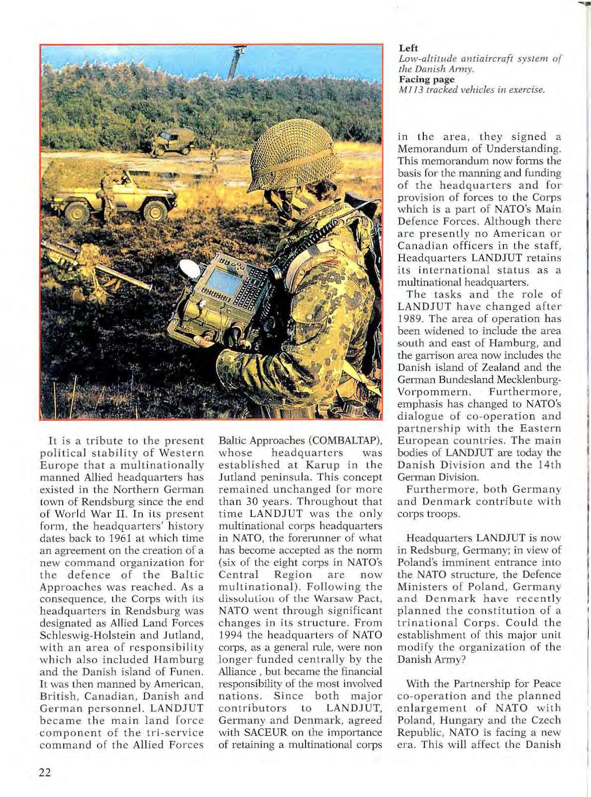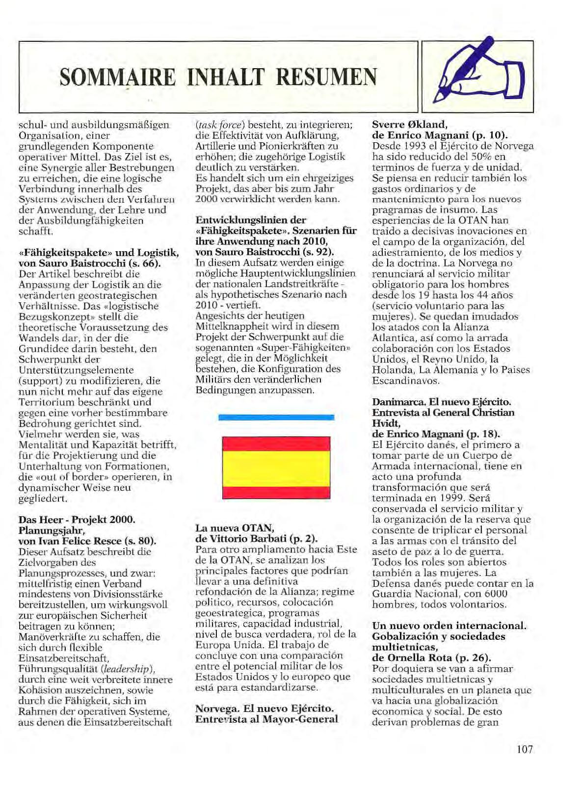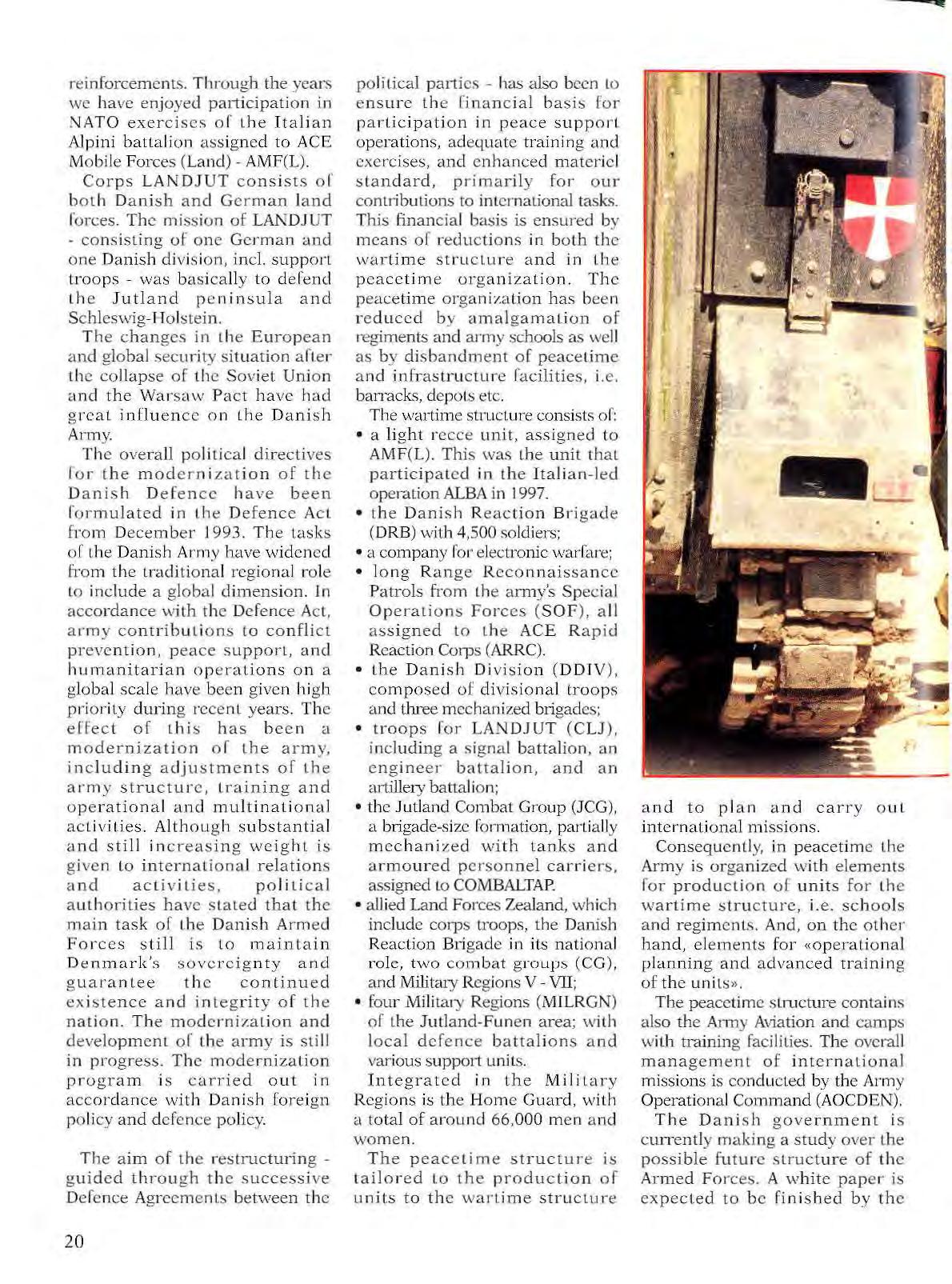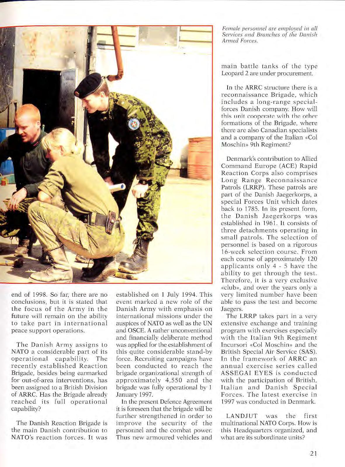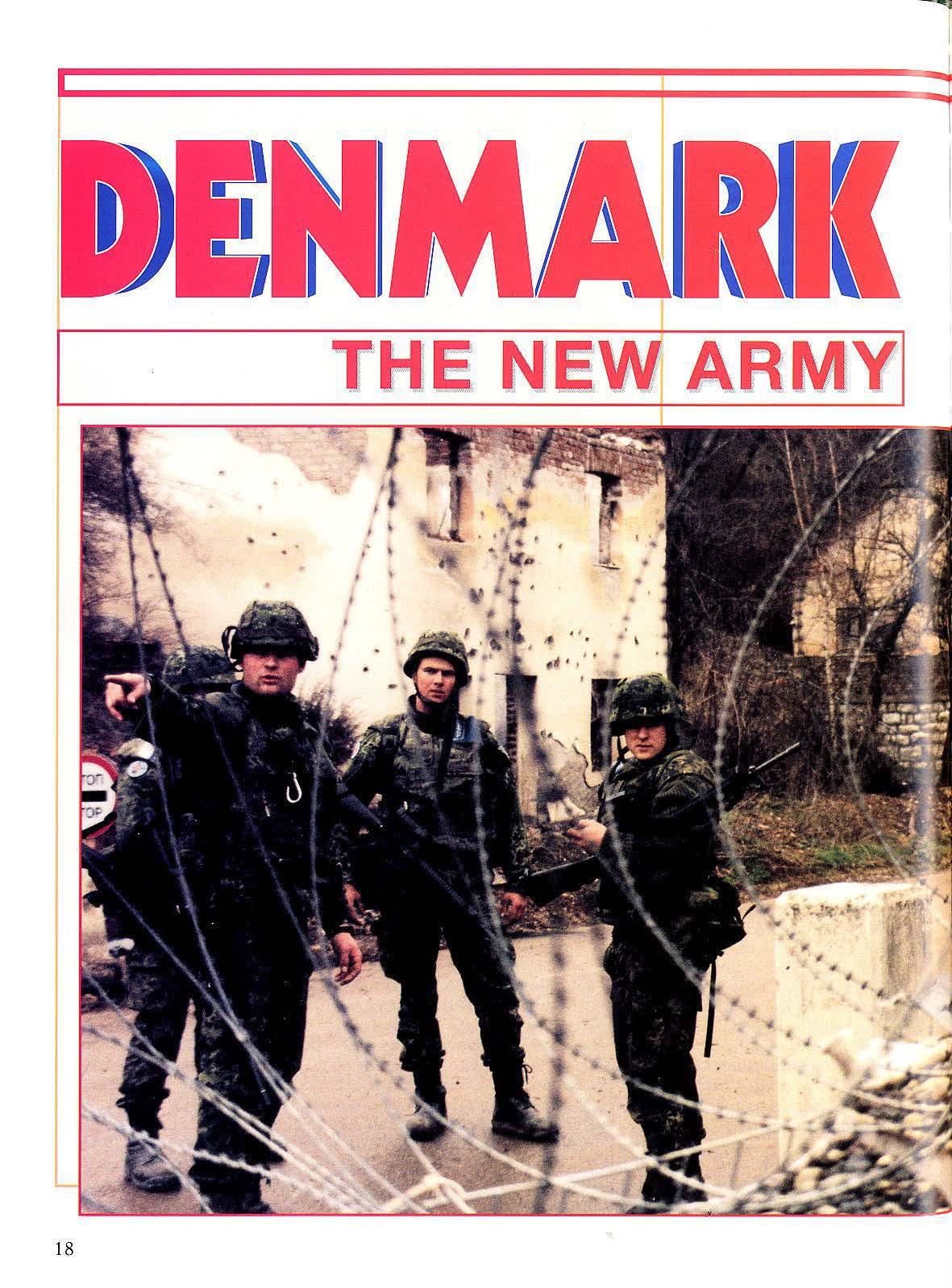 Danimarca. E l nuevo Ejercito. Entrevista al General Christian Hvidt, de Enrico Magnani (p 18). El E jer cito el primero a tomar parte de un Cuerpo de Armada internacional, tiene en acto una profu n da transformaci6n que se ra terminada e n 1999. Sera conservada cl servicio military la organizaci6n de la rese1·va que consente d e triplicar e l personal alas armas con e l tninsito del aseto de paz a lo de guerra. Todos Ios rol es son ab.iertos tambien a las muj eres La Defensa danes p u ede contar en la Guardi a Nacional, con 6000 hombres, todos volontarios