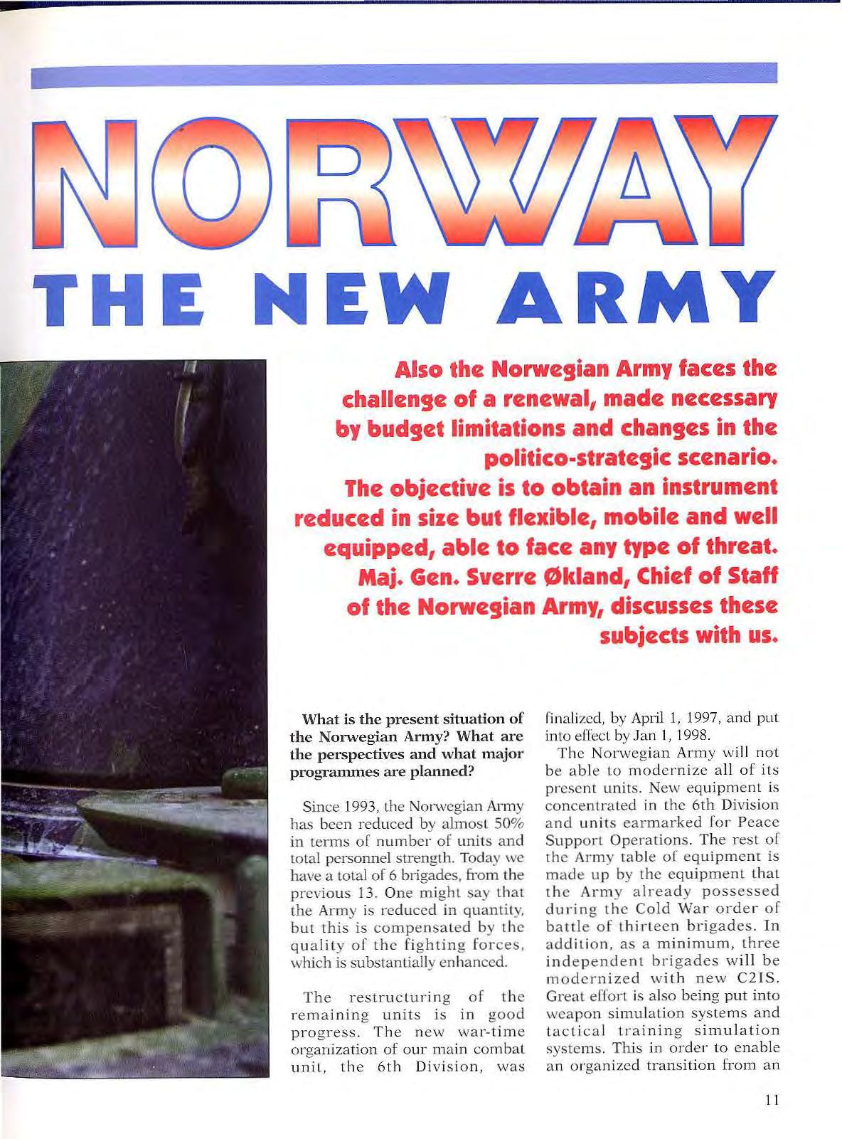 Norwegen. Die Ne u e n Streitkrafte. Intervie w mit Generahnajor Sverre 0kland, von Enrico Magnani. (s. 10). Seit 199 3 s ind die norweg isc hen Strcitkrafte u rn 50% reduzi ert warden, und zwar sowohl die Mannstarke als auch die Einheiten. E s ist beabsic hti gt, auch d ie or d entlichen u nd di e In s ta ndset z ungsausgaben z u g unst e n n e u er Investit ions programme zu reduzieren. Die Erfahrungen im Bereich der NATO habe n zu en tsche iclenden In novati onen im Bereich d e r Organisat io n , der Aus bildung, d er M itt cl und der Do kt r in gefuhrt. Norweg en w ird nicht a uf di e Wc h rpfl ich t fiir seine mannl ichen Staatsbilrger zwischen 19 und 44 Jahren verzichten; Frauen ist ein freiwillig e r Dienst anhcimgestellt. Unverandert b l eiben schlieEli c h d ie Yerbindun gen z.ur at la ntischen All ia n z. so wie die enge Zusammenarbe i t mi t d en USA, d em Vereinigtcn Konigreich, den Niede rl anden, De u tschland und den ska nd inav ischen Landern.