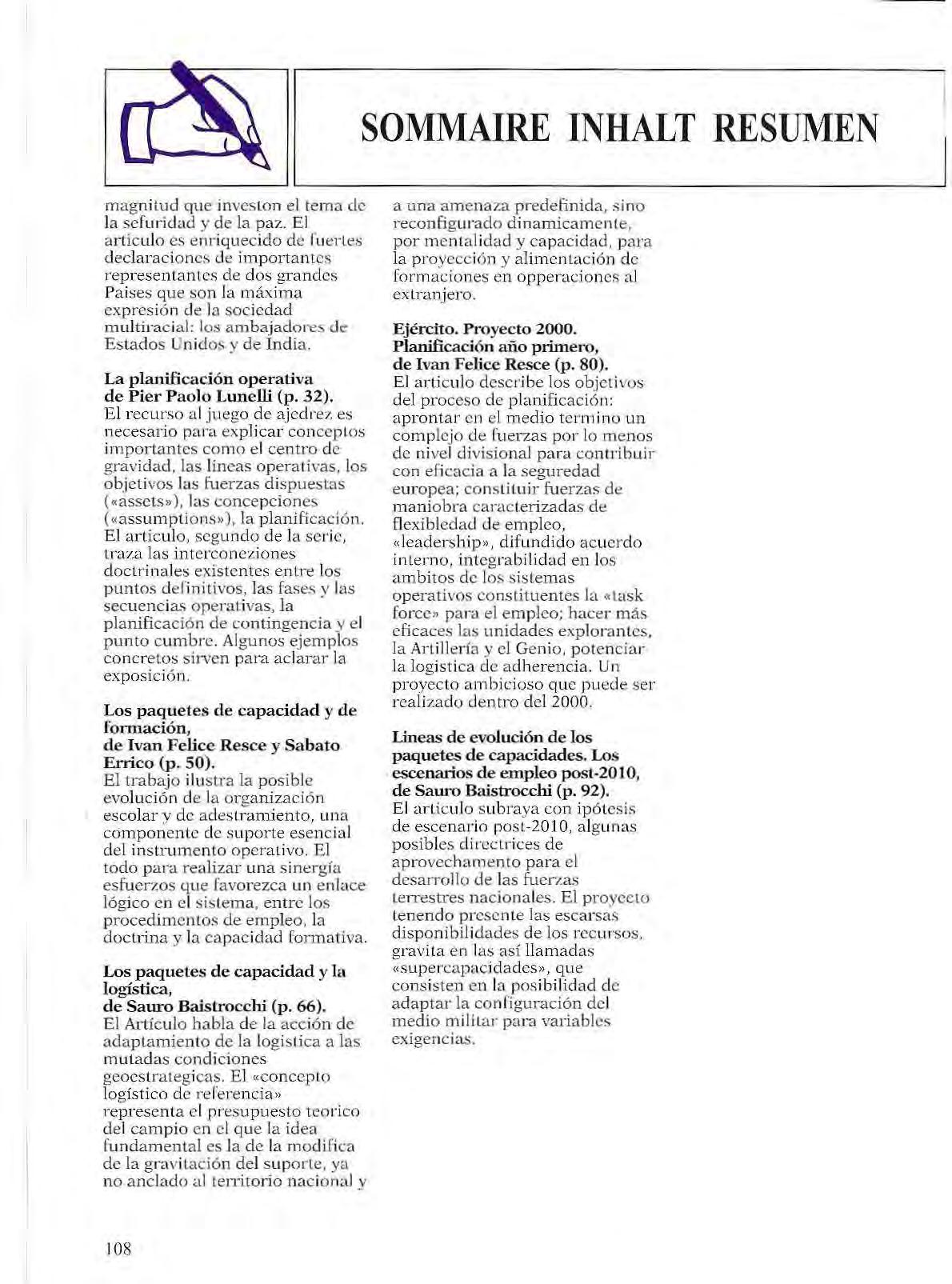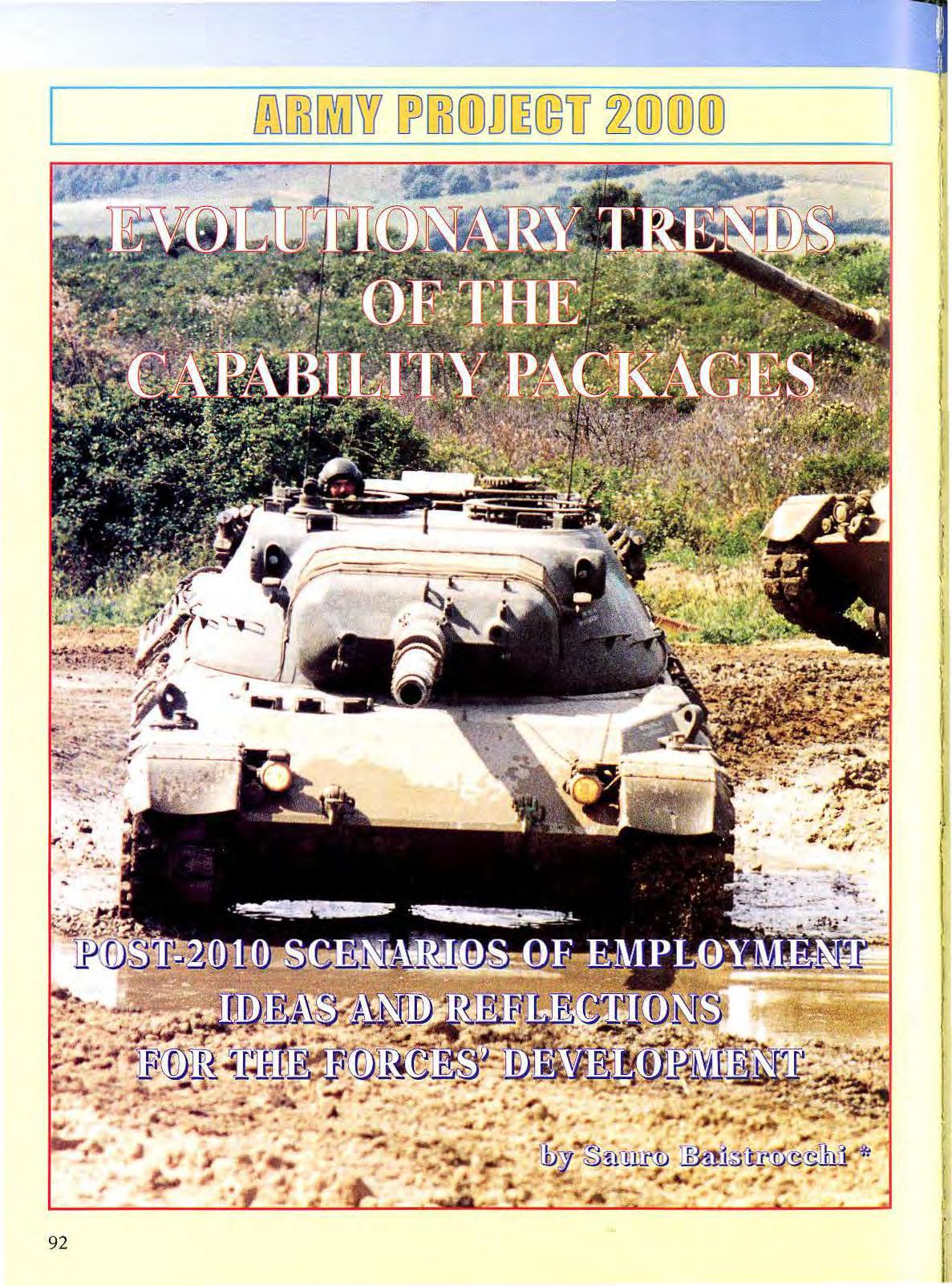 Lineas d e evo luci6n de los paque t es d e capacidades. Los ·escenarios d e empleo post-2010, de Sauro Baistrocchi (p. 92). El articul o s ubraya con ip 6 tes is de escenario post -2010, a lg un as posibles cli r·ectrices de a p ro vec hamento para e l desatTollo de !as fuerzas ten·estres naciona les. El proyccto tene nd o prescn te la s esca r sas dispani h ili dades de los recu r sos, grav i ta e n las asf llam ada s qu e consis ten en l a pos ibilid ad d e a d a p tar la con f iguraci6n de l media mililat· para variables cxigencias.