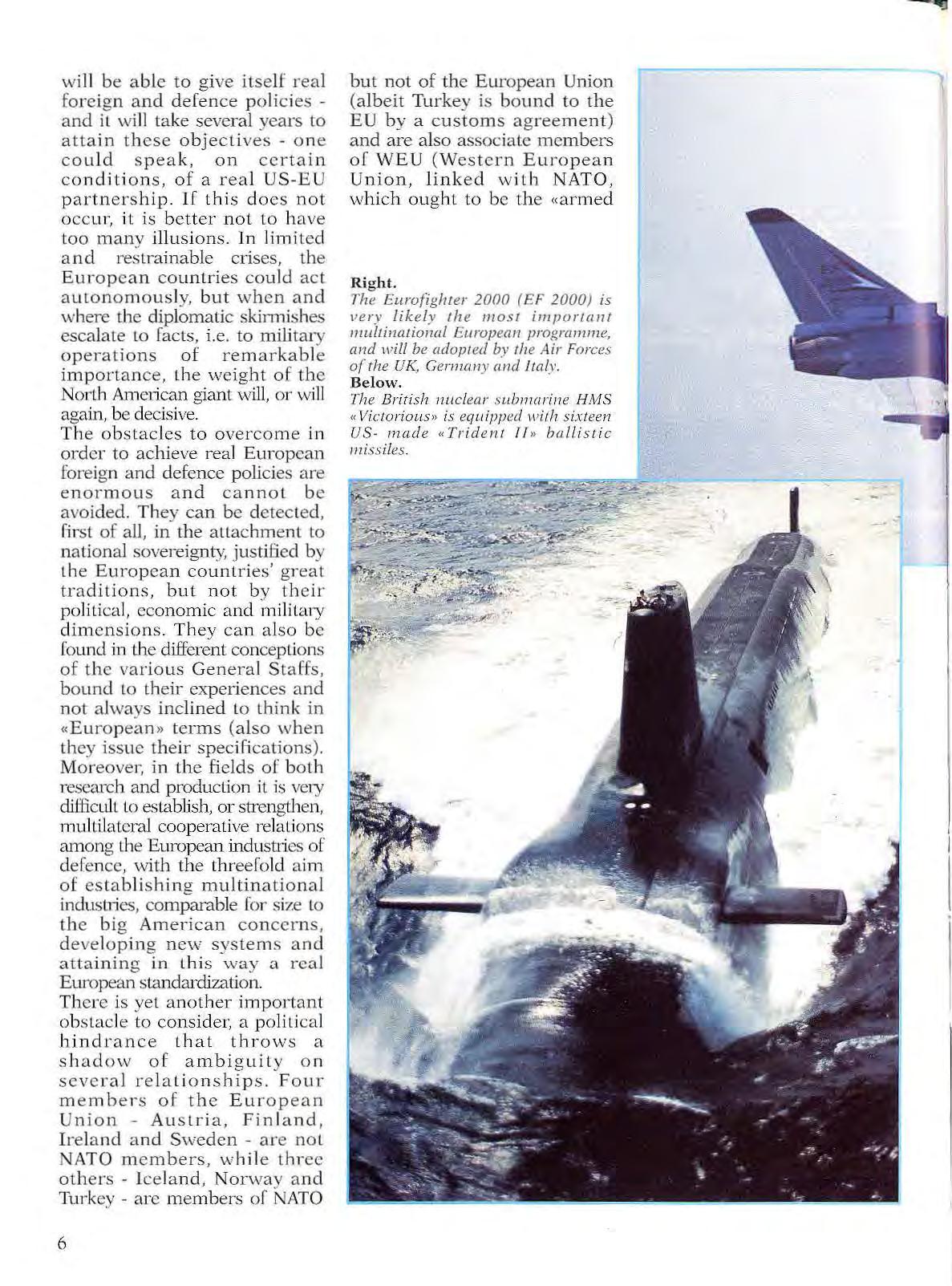 Th e obstacles to o vercom e in order to ac hieve real Eu ropean foreig n and defence policies are enormous and ca n not be avoided. T hey can be d etec ted, first of all, in the attachm e nt to nati onal sovereignty, justified by the Europea n countri es' great traditions, bu t not b y their political, economic and military d imens ions . They can a l so be found in the different conceptions of the va rious Gene ral Staffs, bound to their experiences and no t always incl ined to thin k in «European » terms (also when they issue the i r s pec ifi cations). M oreove1·, in the fields of b oth researc h and production it is very difficult to es tablish, or strengthen, mu ltilateral coopera tive relati ons among the E urope<.m indus tries of d efence, ·wi th the threefold aim of estab li s hing multinational indus lli.es, comparable for s ize to the big American concerns, develop in g new s yste m s and attaining in thi s \.vay a reo ! European standardization. Th ere is ye t another impo rtant obs tacle to a politi cal hi ndrance that thro w s a shadow of ambiguit y o n several re l a ti onships. Four members of the Eu ropean Union - Austria , F in l a nd , I reland a nd S\ veden - are not NATO members, while three others - I celand, No rway an d Turk ey - are members of NATO