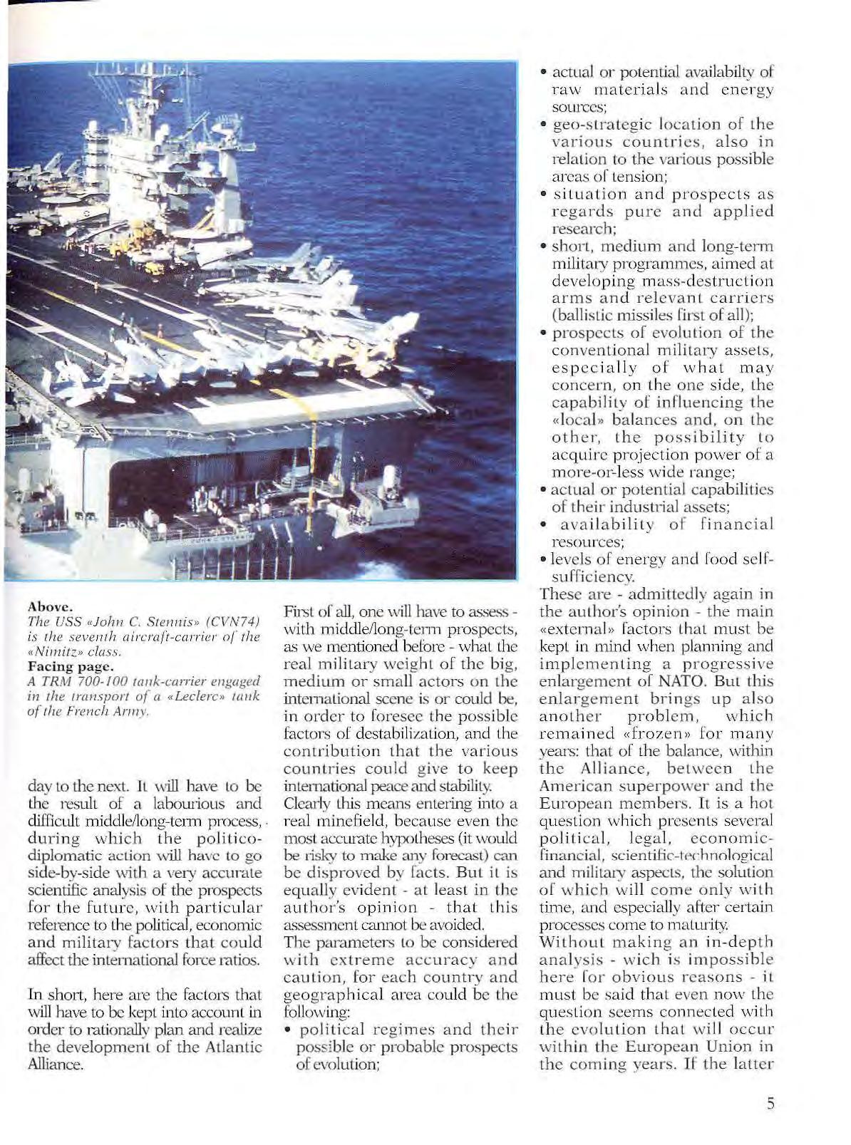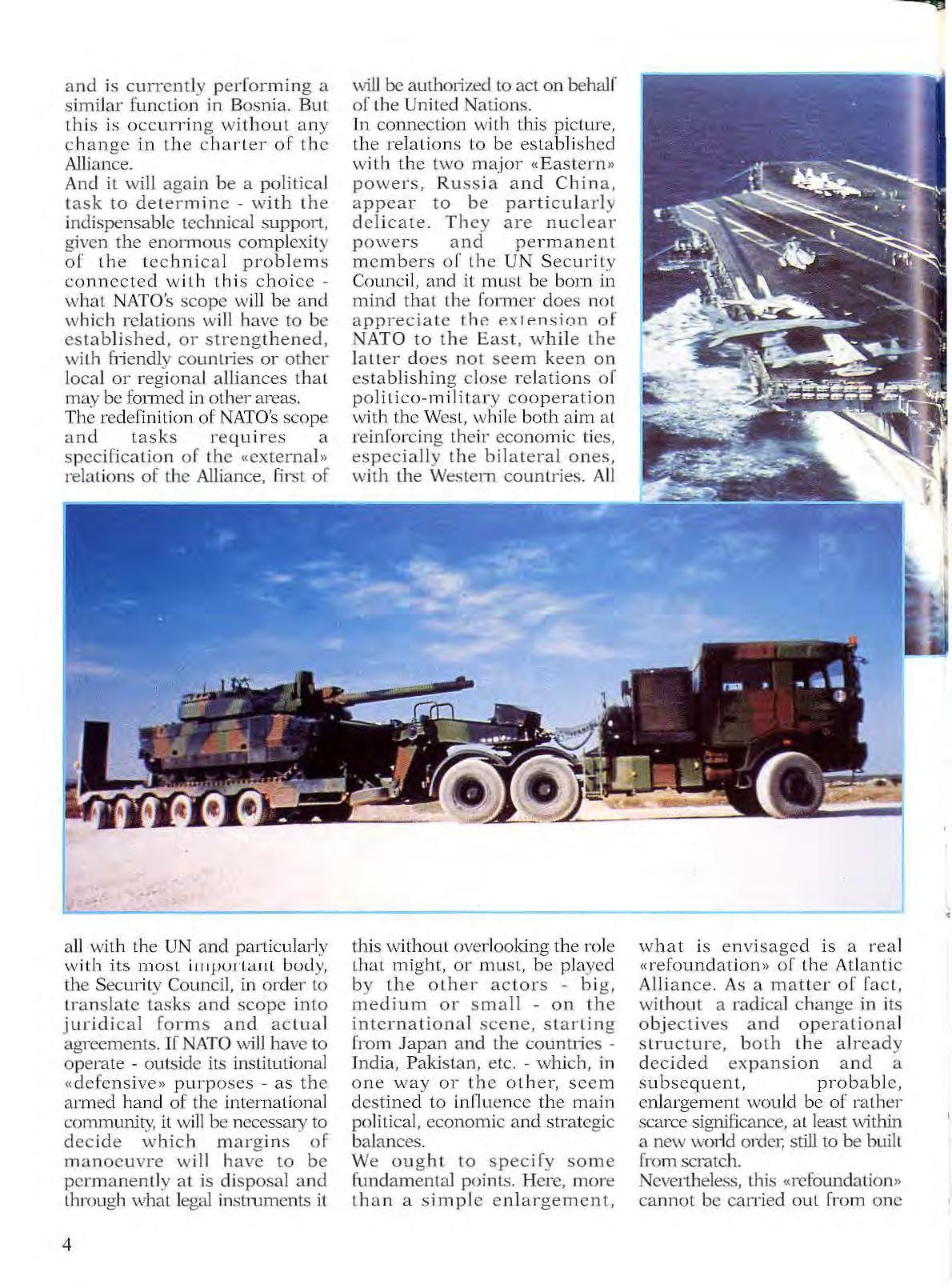 Tn c onne c tio n with this p ic tu re, th e relation s to b e established w i th t h e two major «E as t ern» powers, R ussia and C hina, appear to be pa r ticu l arly delicate. T hey are nuclear powers and p er manent mem be rs of t he UN Secur ity Council, and it. m us t be born in min d th at the fo rm er d oes not apprec i ate thP- extension of NAT O to the East , wh il e the l atter d oes not seem k een on esta b lis hing close relati o ns of po litico-mili tary c oopera tion w ith the West, w hil e both ai m at rei n forc i ng the i r econo m ic t ies, especially the bilateral ones, with the Western countries. All this w ithout overlooking th e role that might, or must, be played by t he o t he1· ac to r s - b ig, medium or small - on the international scene, startin g from J apan and the countliesI ndia, Pa kistan, etc. - whi ch, in one wav or the other, seem des tined" to inll ue n c e the m a in po li tical , economic a nd str a tegic balances