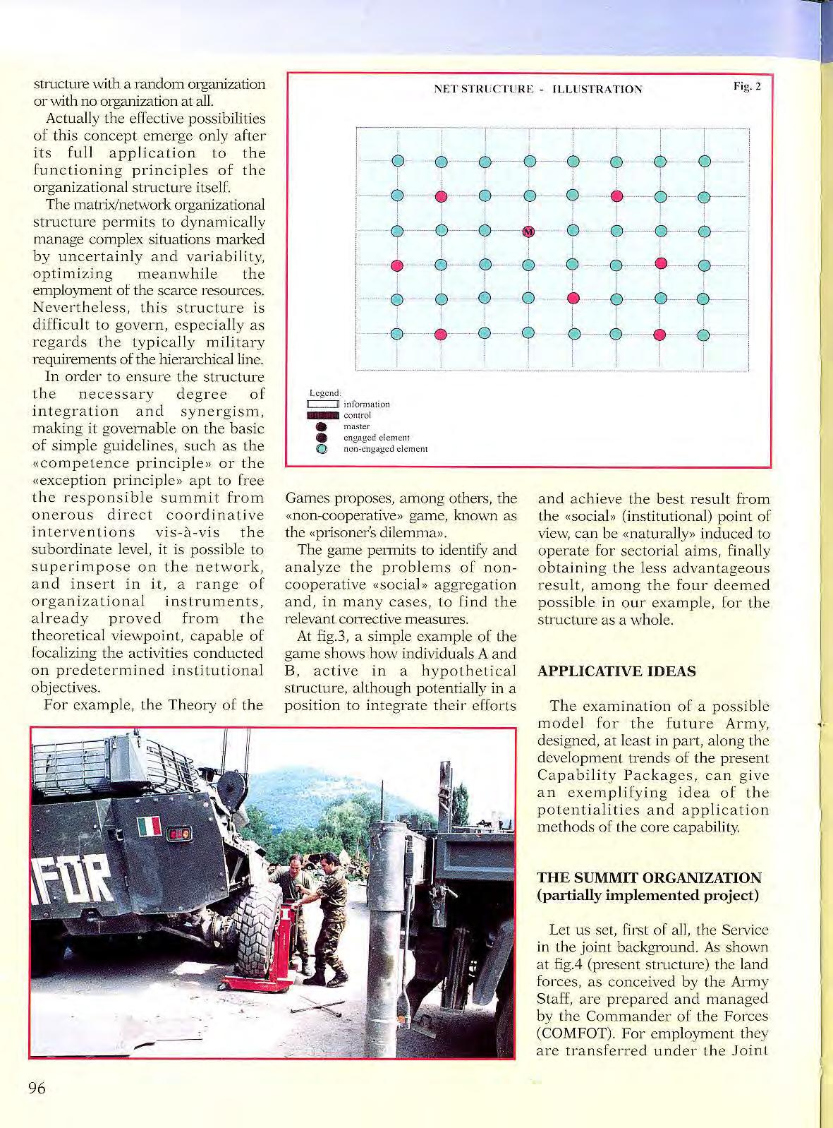 Taki ng fo r granted the need o£ an exceptional improvement in the qu ality of t he h u m an co m pon e nt, the prob lem , as we hav e seen, could be ta ckled and s.9lved, i p rosp ect, a t s t r ucture le vel. where by «Structure >> we mean a comp lex m odular w hole of men an d rela tio nal rul es that bind them, d ynamic a l ly organ i za ble on the basis o f the entrusted mission.