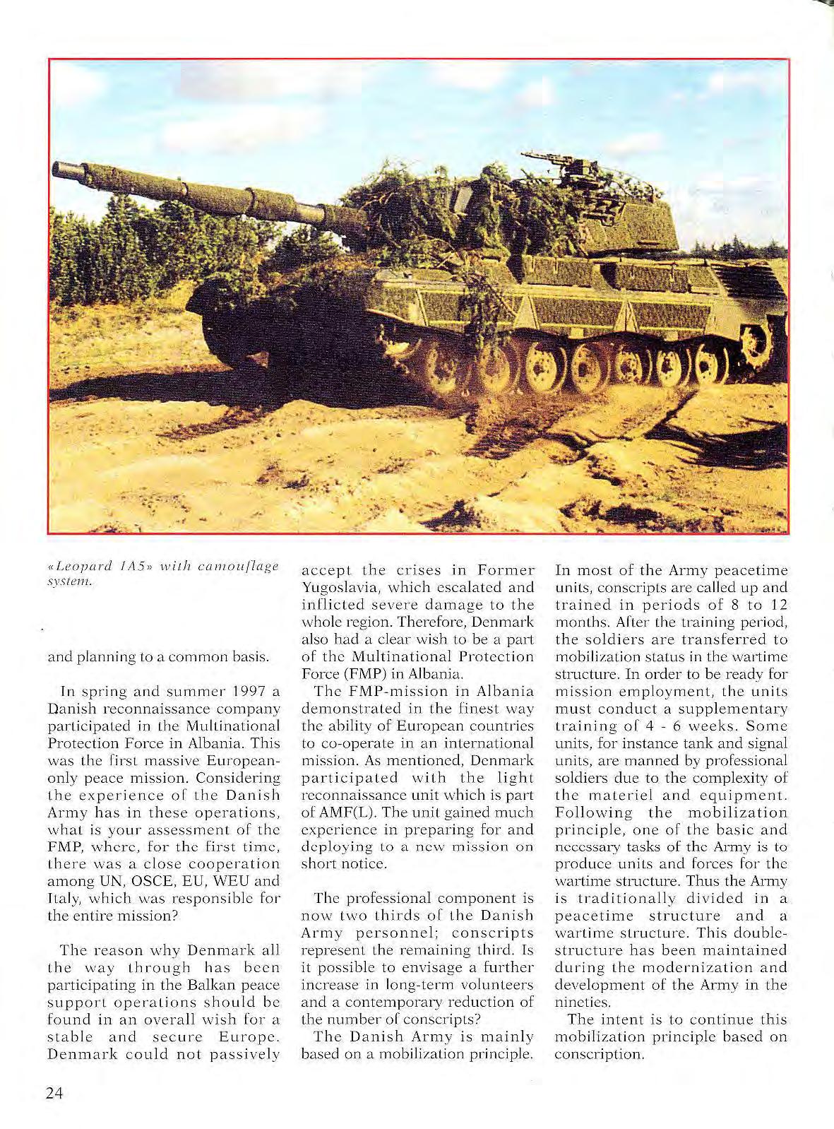 Danemark. Das neue Heer. b1terview mit General Christian Hvidt, von Enrico Magnani. (s. 18). Die danisc h en S t reitkrafte, die als ers te Teil eines intcrnationalen Verband es waren, befinden sich in einem tiefen Tra n s fonnatio nsprozeg, der 1999 sci n c n vorlaufi gen Abschlu() find en soU. W e hrpfl icht unci R eserve, die die Ver dreif achung der Zahl an Personen unter Waffen beim Obergang vom Ft;edens- zu m