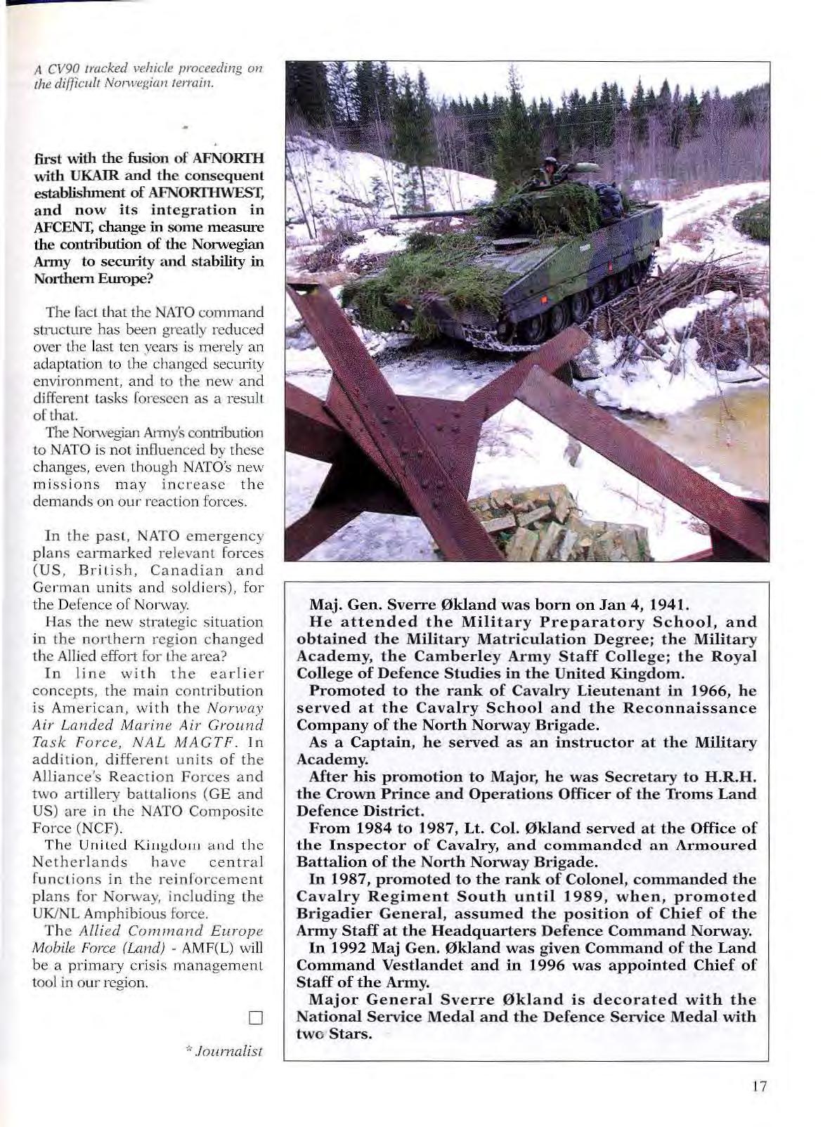 Norvege. La n o uvelle Arm ee de Terre. Interview avec l e Majeur-General Sverre 0kland, par Emico Mag n a ni (p. 10).