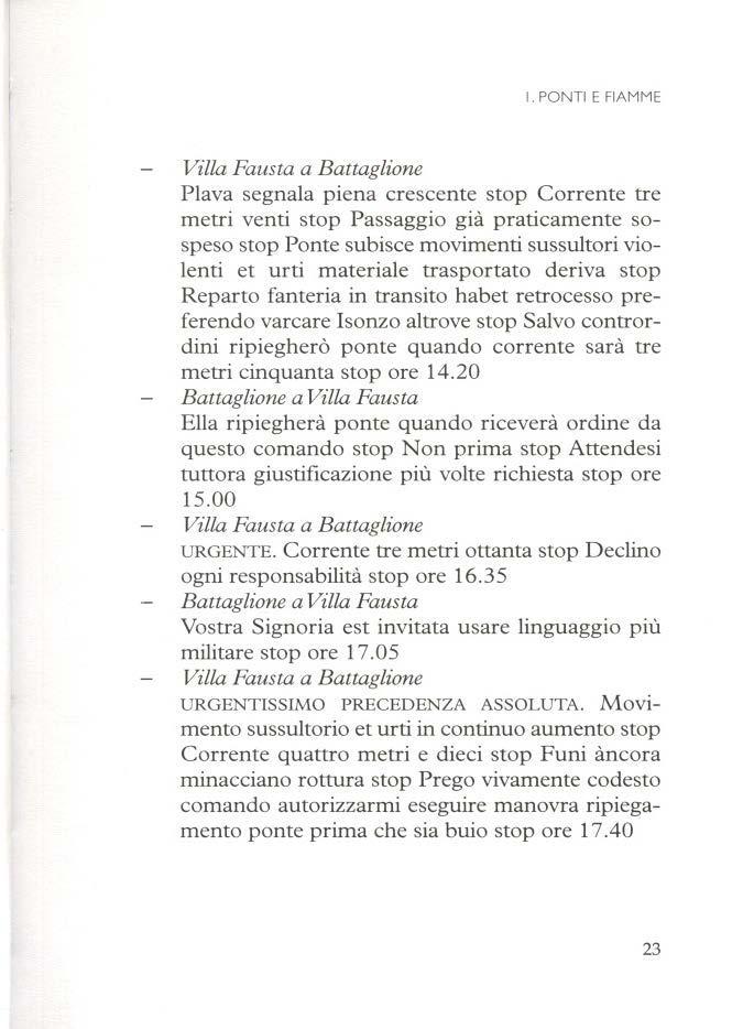 Reparto fanteria in transito habet retrocesso preferendo varcare Isonzo altrove stop Salvo contrordini ripiegherò ponce quando corrente sarà tre metri cinquanta stop ore 14.20