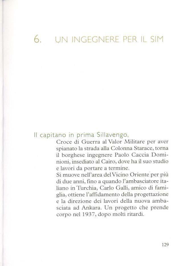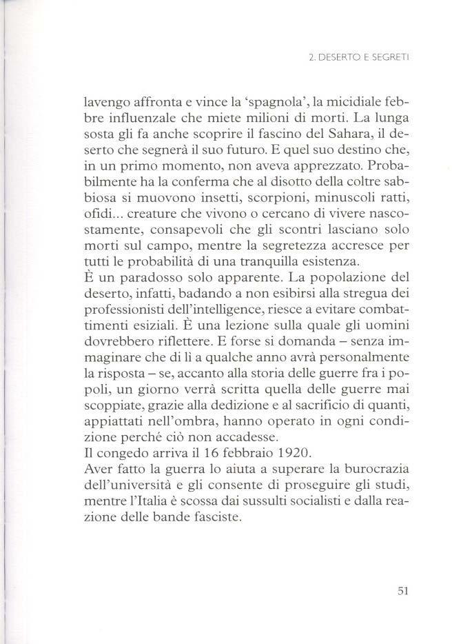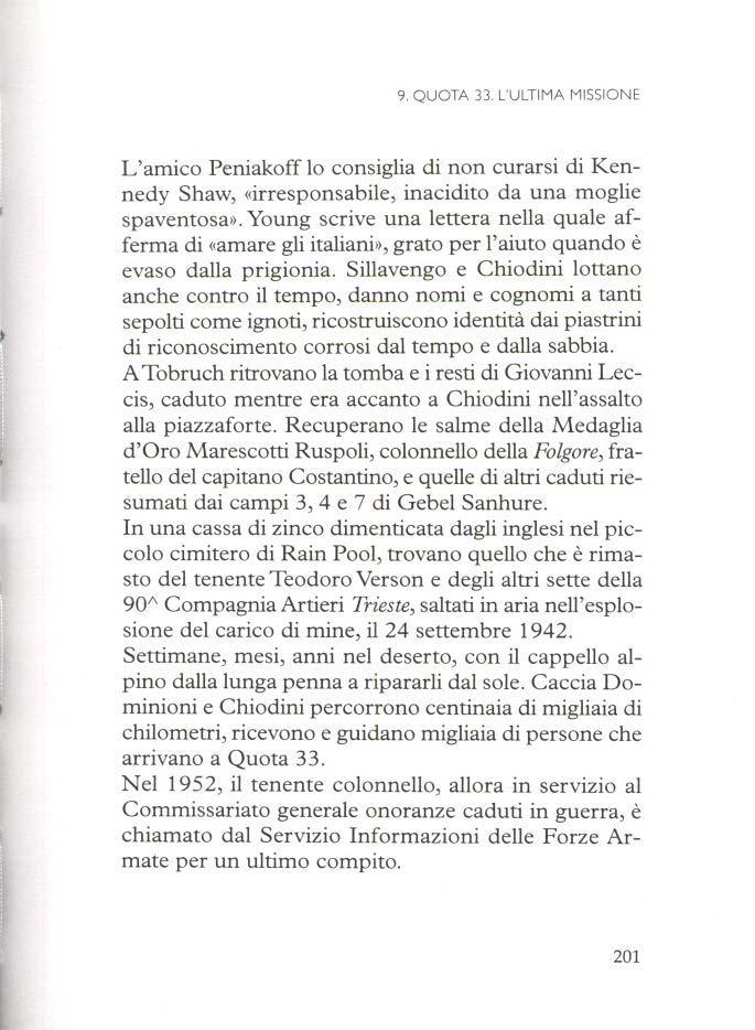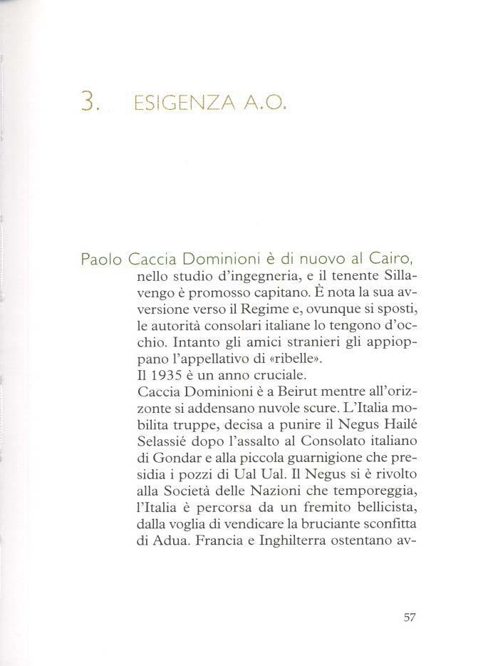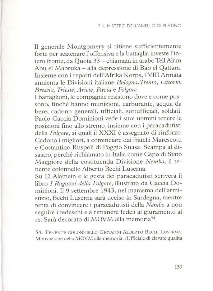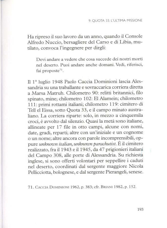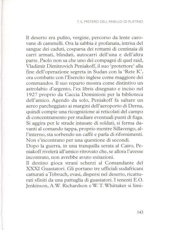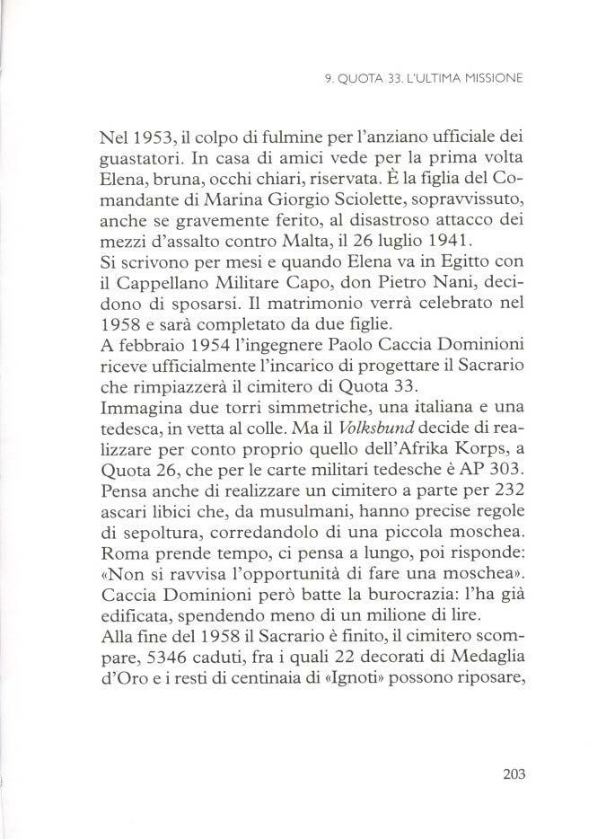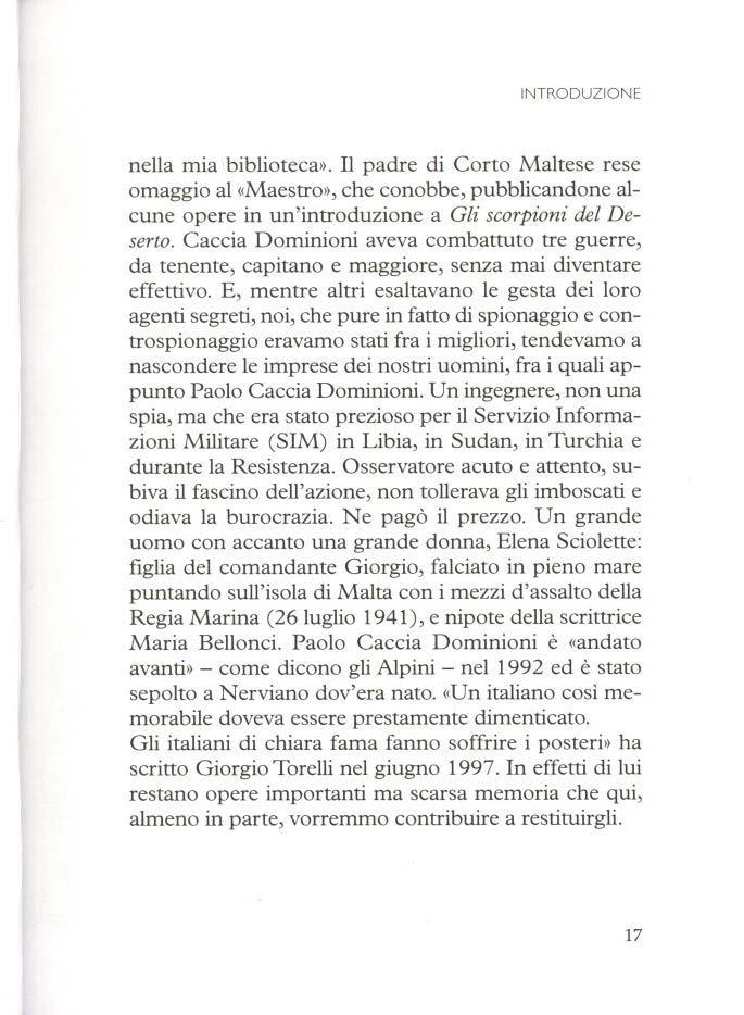 nella mia biblioteca•>. Il padre di Corto Maltese rese omaggio al <•Maestro», che conobbe, pubblicandone alcune opere in un'introduzione a Gli scorpioni dei Deserto. Caccia Dominioni aveva combattuto tre guerre, da tenente, capitano e maggiore, senza mai diventare effettivo. E , mentre a ltri esaltavano le gesta dei loro agenti segreti, noi, che pure in fatto di spionaggio e controspionaggio eravamo stati fra i migliori, tendevamo a nascondere le imprese dei nostri uomini, fra i quali appunto Paolo Caccia Dominioni. Un ingegnere, non una spia, ma che era stato prezioso per il Servizio Informazioni Militare (SIM) in Libia, in Sudan, in Turchia e durante la Resistenza . Osservatore acuto e attento, subiva il fascino dell'azione , non to ll erava g li imboscati e odiava la burocrazia. Ne pagò il prezzo. Un grande uomo con accanto una grande donna, Elena Scio lette: figl ia del comandante Giorgio, falciato in pieno mare puntando sull'isola di Malta con i mezzi d 'assalto della Regia Marina ( 26 luglio 1941), e nipote della scrittrice Maria Bellonci. Paolo Caccia Dorninioni è «andato avanti •> - come dicono gli Alpini - ne l 1992 ed è stato sepolto a Nerviano dov'era nato. «U n italiano così memorabile doveva essere prestamente dimenticato. Gli italiani di chiara fama fanno soffrire i posteri •> ha scritto Giorgio Torelli nel giugno 1997 . In effetti di lui restano opere importanti ma scarsa memoria che qui, almeno in parte, vorremmo contribuire a restituirgli.