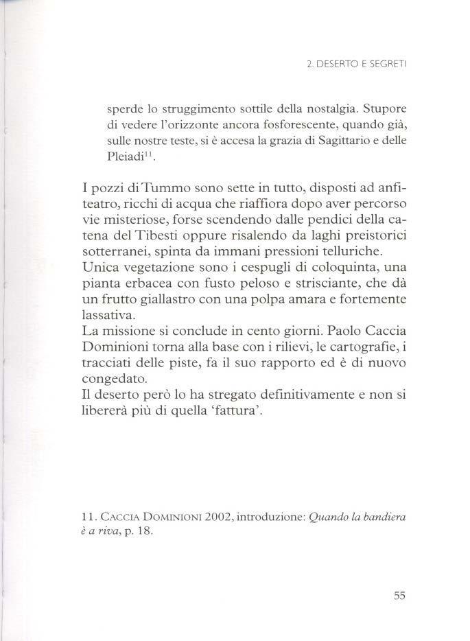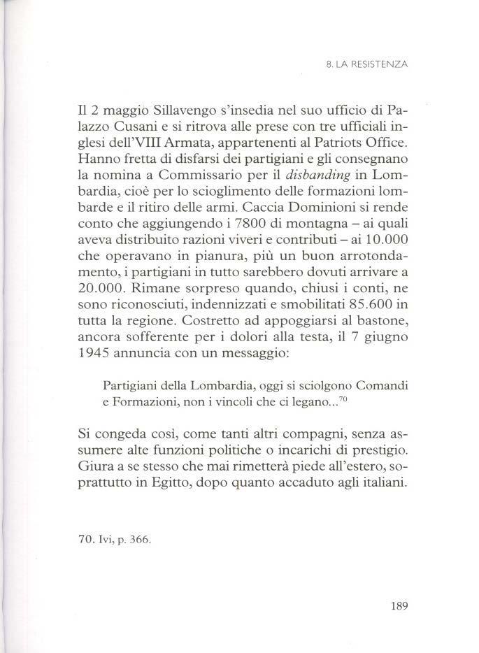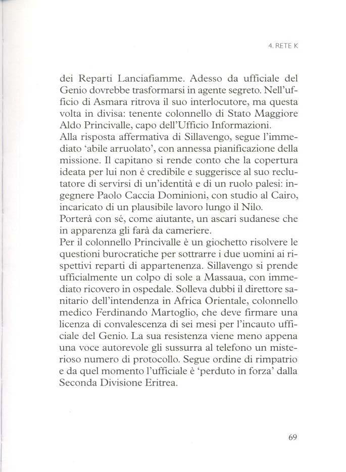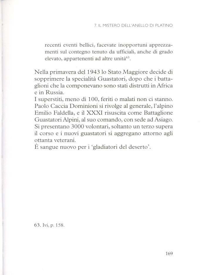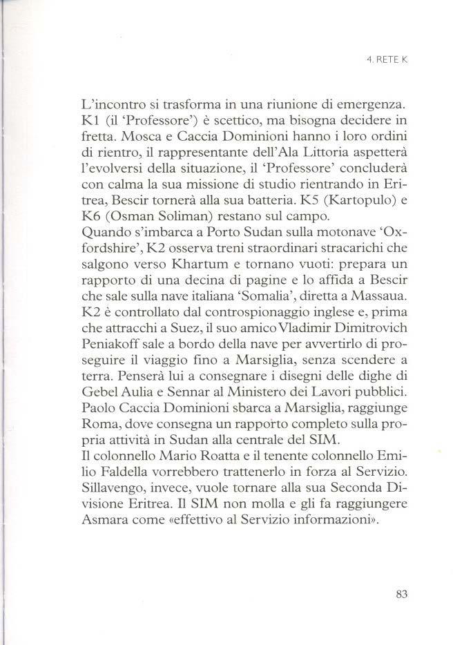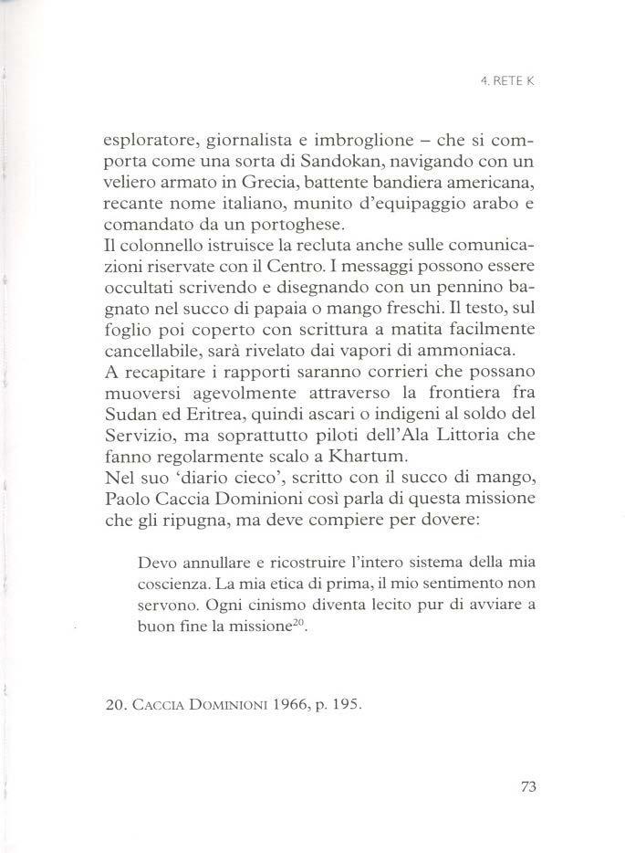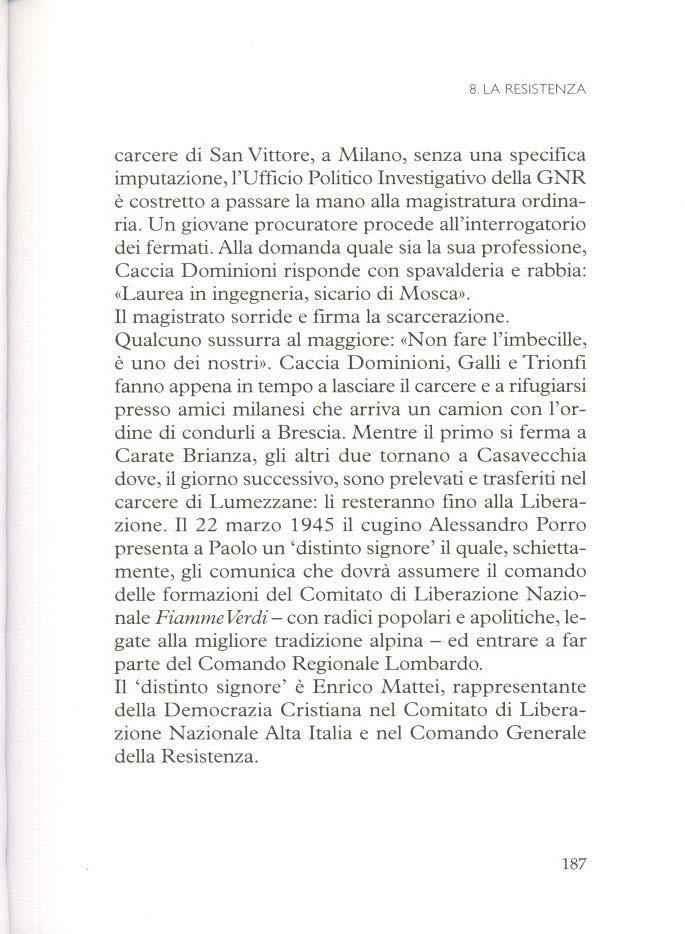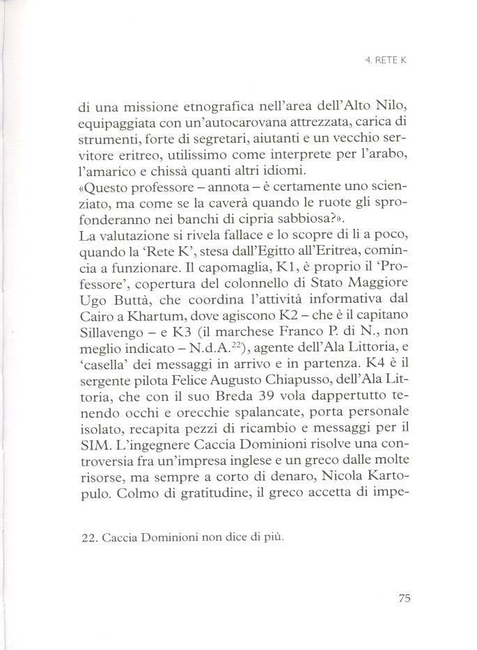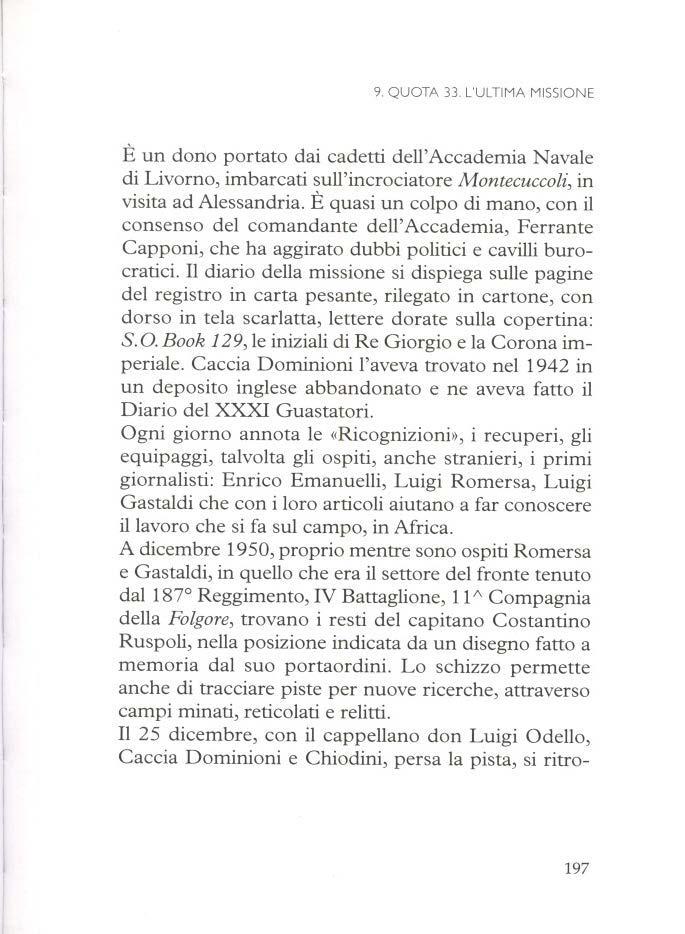 nella mia biblioteca•>. Il padre di Corto Maltese rese omaggio al <•Maestro», che conobbe, pubblicandone alcune opere in un'introduzione a Gli scorpioni dei Deserto. Caccia Dominioni aveva combattuto tre guerre, da tenente, capitano e maggiore, senza mai diventare effettivo. E , mentre a ltri esaltavano le gesta dei loro agenti segreti, noi, che pure in fatto di spionaggio e controspionaggio eravamo stati fra i migliori, tendevamo a nascondere le imprese dei nostri uomini, fra i quali appunto Paolo Caccia Dominioni. Un ingegnere, non una spia, ma che era stato prezioso per il Servizio Informazioni Militare (SIM) in Libia, in Sudan, in Turchia e durante la Resistenza . Osservatore acuto e attento, subiva il fascino dell'azione , non to ll erava g li imboscati e odiava la burocrazia. Ne pagò il prezzo. Un grande uomo con accanto una grande donna, Elena Scio lette: figl ia del comandante Giorgio, falciato in pieno mare puntando sull'isola di Malta con i mezzi d 'assalto della Regia Marina ( 26 luglio 1941), e nipote della scrittrice Maria Bellonci. Paolo Caccia Dorninioni è «andato avanti •> - come dicono gli Alpini - ne l 1992 ed è stato sepolto a Nerviano dov'era nato. «U n italiano così memorabile doveva essere prestamente dimenticato. Gli italiani di chiara fama fanno soffrire i posteri •> ha scritto Giorgio Torelli nel giugno 1997 . In effetti di lui restano opere importanti ma scarsa memoria che qui, almeno in parte, vorremmo contribuire a restituirgli.