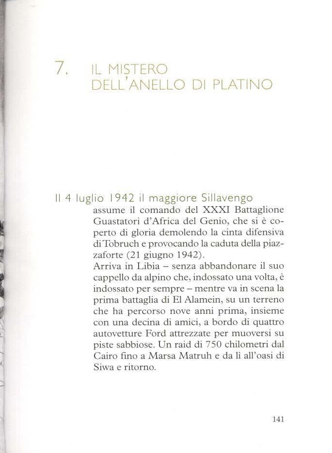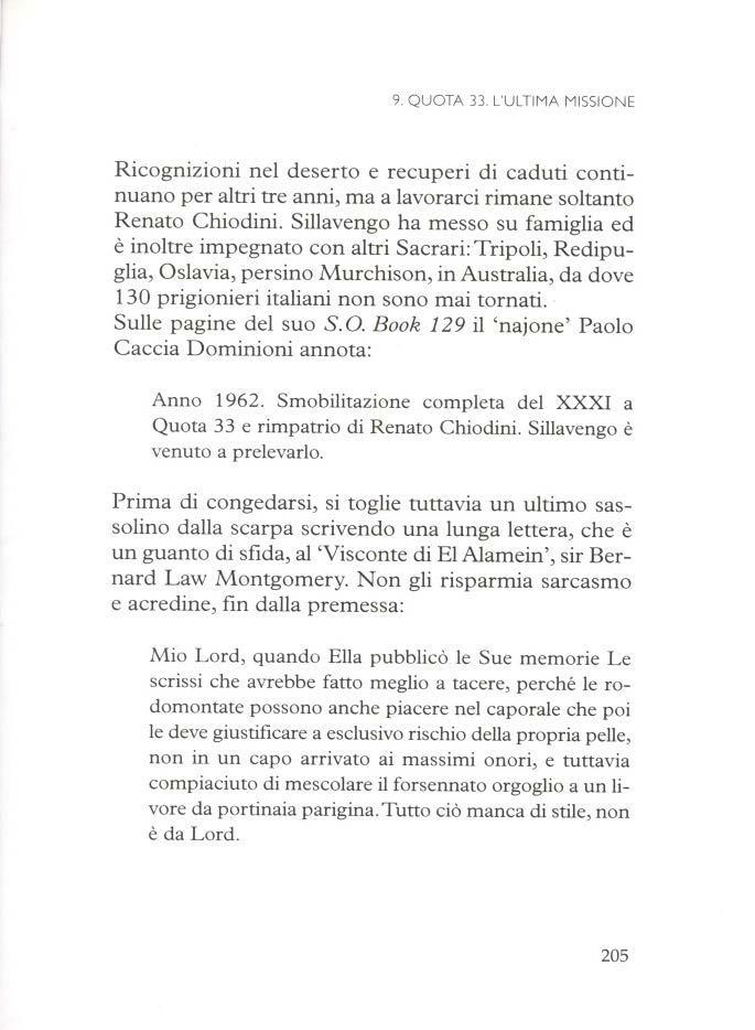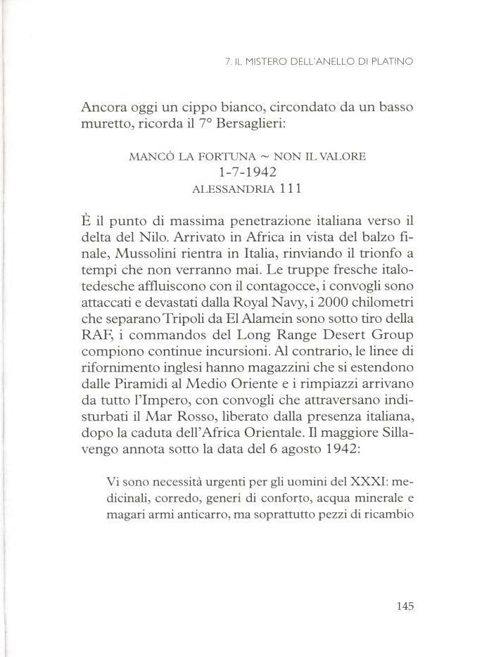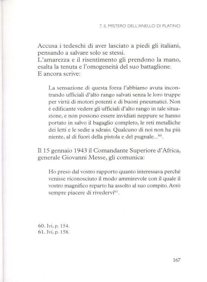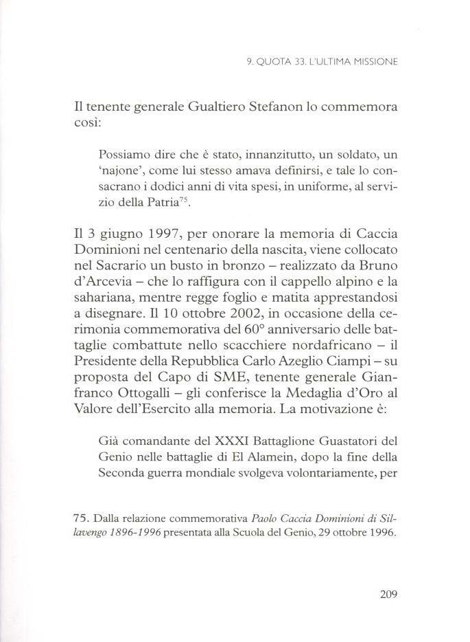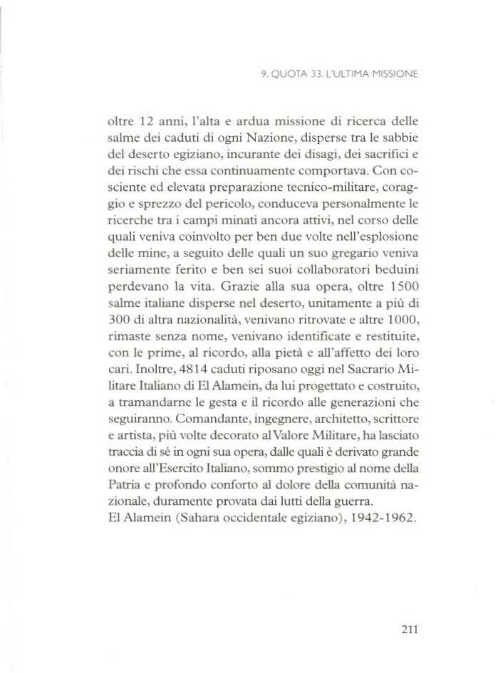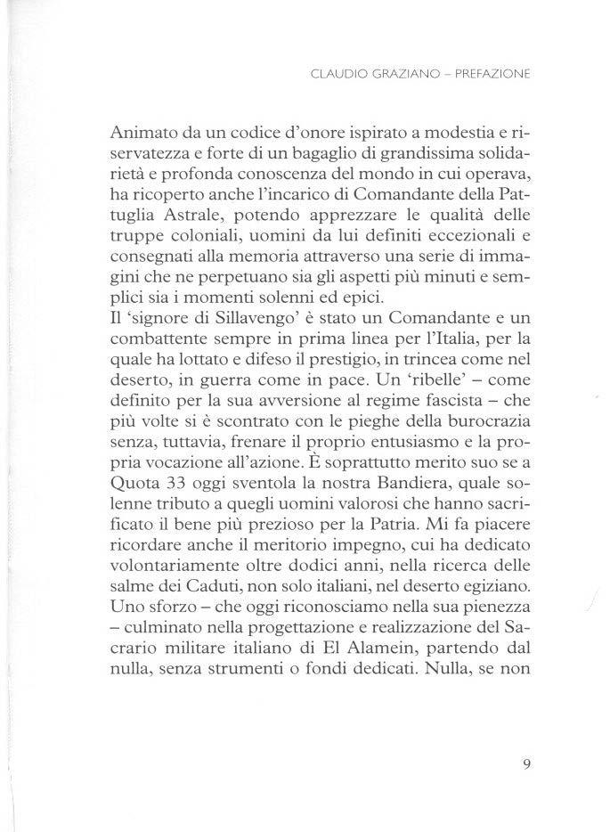 Il 'signore di S illavengo' è stato un Comandante e un combattente sempre in prima linea per l'Italia, per la quale ha lottato e difeso il p restigio, in trincea come ne l deserto, in guerra come in pace. Un 'ribe ll e ' - come definito per la sua avversione al regime fascista - c h e più volte si è scontrato con le pieghe della b urocrazia senza, tuttavia, frenare il proprio entusiasmo e la propria vocazione all 'azione. È soprattutto merito suo se a Quota 33 oggi svento la la n ostra Bandiera, quale solenne tributo a quegli uomjni valorosi c h e hanno sac r ificato il bene più prezioso per la Patria. Mi fa piacere ricordare anche il meritorio impegno, cui ha dedicato volontariamente oltre dodici anni, nella ricerca delle salme dei Caduti, non so lo italiani, nel deserto egiziano. Uno sforzo - che oggi ricon osciamo nella sua p ienezza - culminato nella progettaz ione e realizzazione de l Sacrar io militare italiano di El A lame i n, partendo da l nulla , senza strumenti o fondi dedicati . Nu ll a, se non