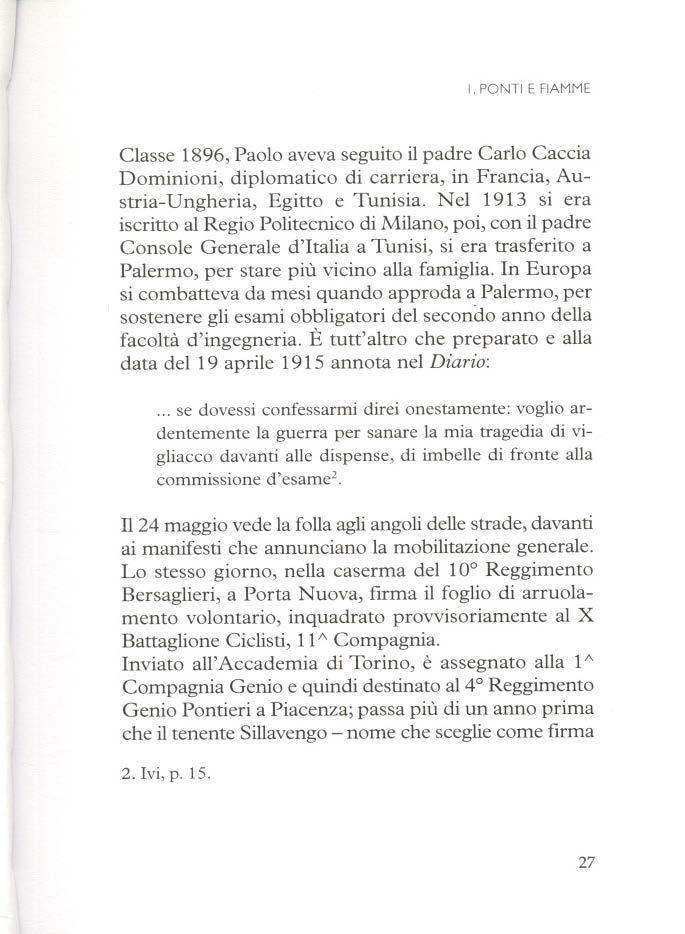 Classe 1896, Paolo aveva seguito il padre Carlo Caccia Dominioni, dip l omatico di carriera, in Francia, Austria-Ungheria, Egitto e Tunisia. Nel 1913 si era iscritto al Regio Po litecnico di Milano, poi, con il padre Console Generale d'Italia a Tunisi , si era trasferito a Palermo, per stare più vicino alla famiglia. In Europa si combatteva da mesi quando approda a Palermo, per sostenere gli esami obbligatori del secondo anno della facoltà d'ingegneria. È tutt'altro che preparato e alla data del 19 aprile 1915 annota nel Diario: