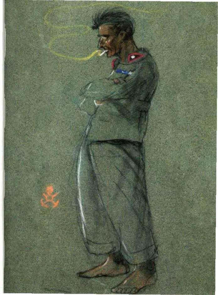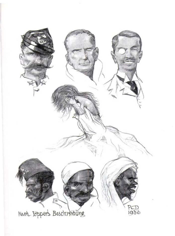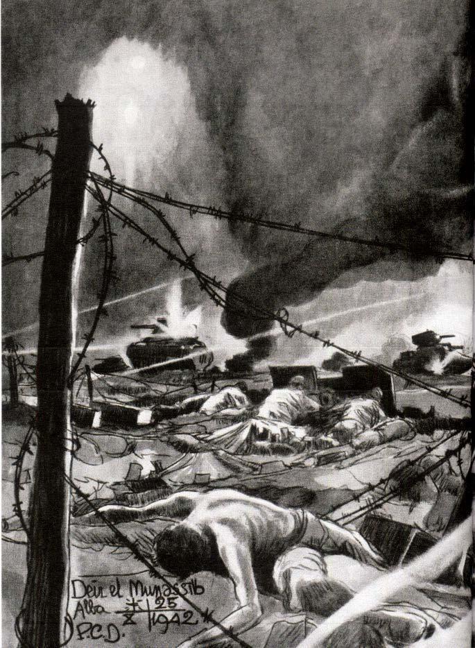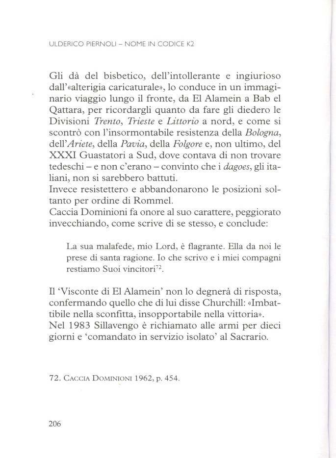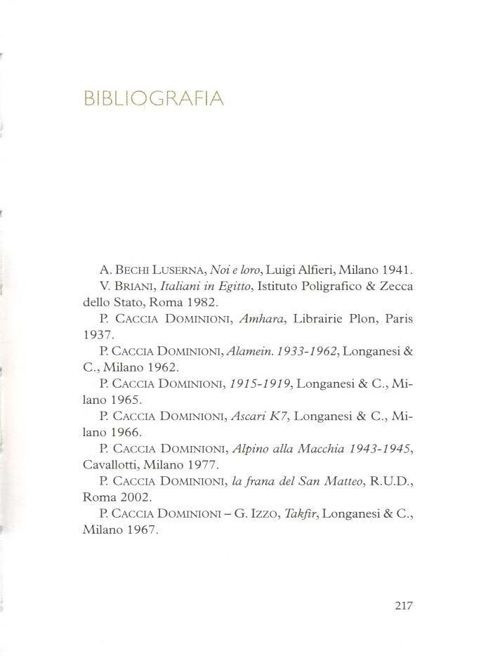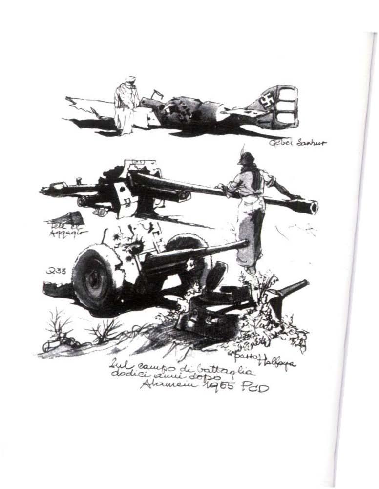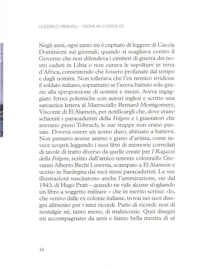 Negli anni , ogni tanto mi è capitato di leggere di Caccia Dominion i sui giornali, quando s i scagliava contro il Governo che non difendeva i cimiteri di guerra dei nostri caduti in Libia o non curava le sepolture in terra d'Africa , consentendo che fossero profanate dal tempo e dagli uomini. Non to ll erava che l'ex nemico irr idesse il soldato italiano , soprattutto se l'aveva battuto so lo grazie alla sproporzione di uomin i e mezzi. Aveva ingaggiato feroci po lemiche con autori inglesi e scritto una sarcastica lettera al Maresciallo Bernard Montgomery, Visconte di E l Alamein, per notificargli che, dove erano schierati i paracadutisti della Folgore e i guastatori che avevano preso Tobruch, le sue truppe non erano passate. Doveva essere un uomo duro, abituato a battersi. Non pensavo avesse animo e gusto d'artista, come invece scopri i leggendo i suoi libri di memor ie corredati di tavole di tratto diverso da quelle create per I Ragazzi della Folgore, scritto dall'amico tenente colonnell o Giovanni Alberto Bechi Luserna, scampato a El Alamein e ucciso in Sardegna dai suoi stessi paracadulisti. Le sue ill ustrazioni suscitarono anche l'ammiraz ione, sin dal 1943, di Hugo Pratt - quando ne vide alcune sfogliando un libro a soggetto militare - che in mer ito scrisse: <•lo, che venivo dalle ex colonie italiane, trovai nei suoi disegni alimento per i miei ricordi. Parlo di ricordi: non di nostalgie né, tanto meno, di malinconie. Quei disegni mi accompagnano da anni e fanno bella mostra di sé