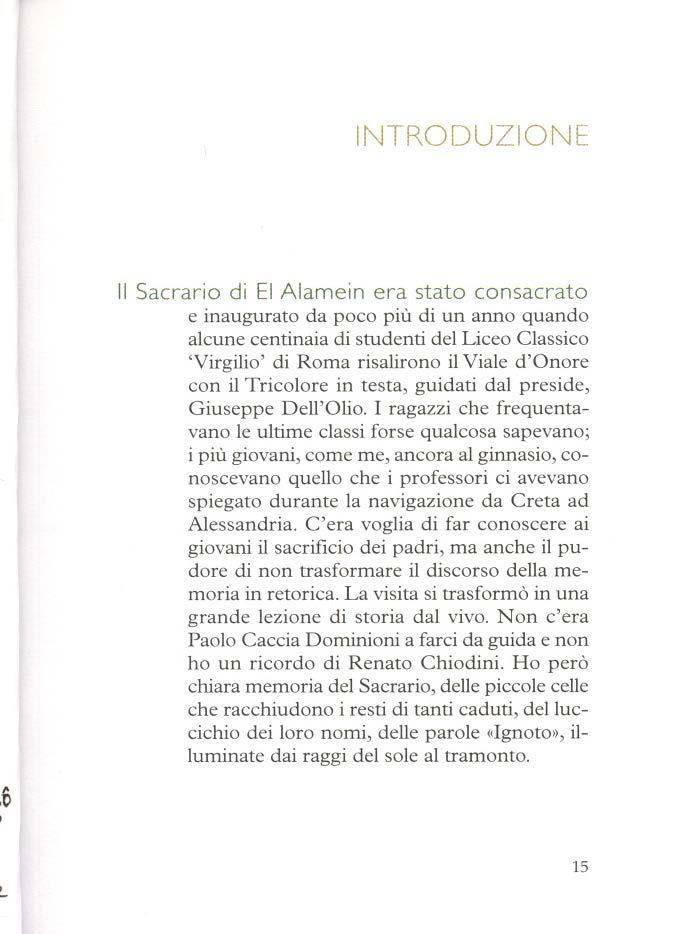 Il Sacrario di El Alamein era stato consacrato e inaugurato da poco più di un anno quando alcune centinaia di studenti del Liceo Classico ' Virgil io' di Roma risalirono il Viale d'Onore con il Tricolore in testa, guidati dal preside, Giuseppe Dell'Olio. I ragazzi che frequentavano le ultime classi forse qualcosa sapevano; i più giovani, come me, ancora al ginnasio, conoscevano quello che i professori ci avevano spiegato durante la navigazione da Creta ad Ale ssan dria. C'era voglia di far conoscere ai giovani il sacrificio dei padri , ma anche il pudore di non trasformare il discorso della memoria in retorica. La visita si trasformò in una grande lezione di storia dal vivo. Non c'era Paolo Caccia Dominioni a farci da guida e non ho un ricordo di Renato Chiodini. Ho però chiara memoria del Sacrario, delle piccole celle che racchiudono i resti di tanti caduti, del luccichio dei loro n o mi, delle parole «Ignoto >>, illuminate dai raggi del sole al tramonto.