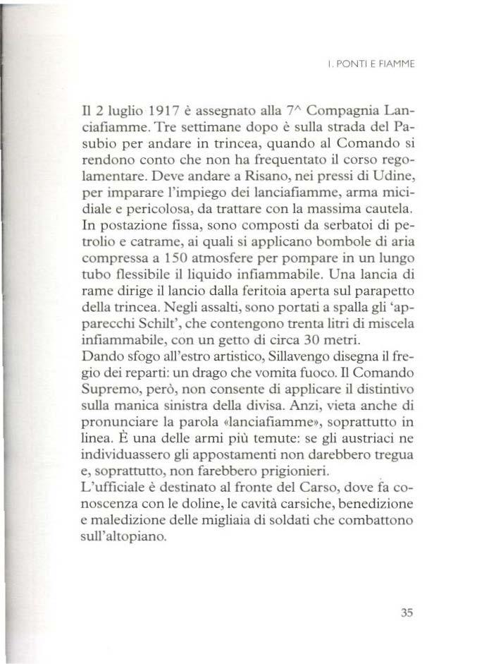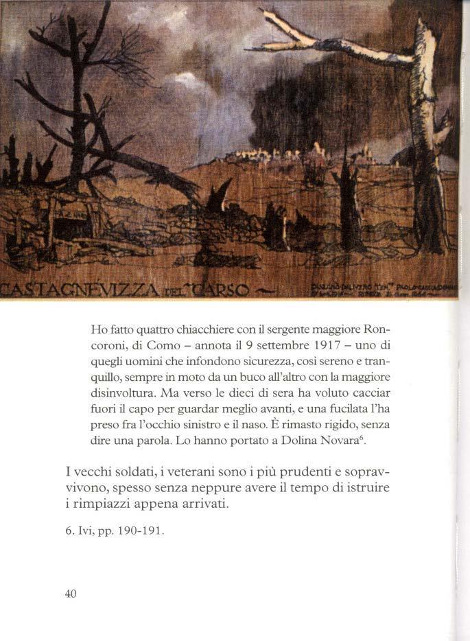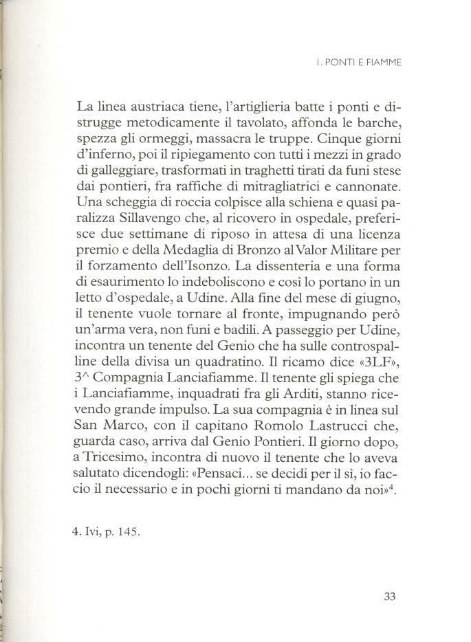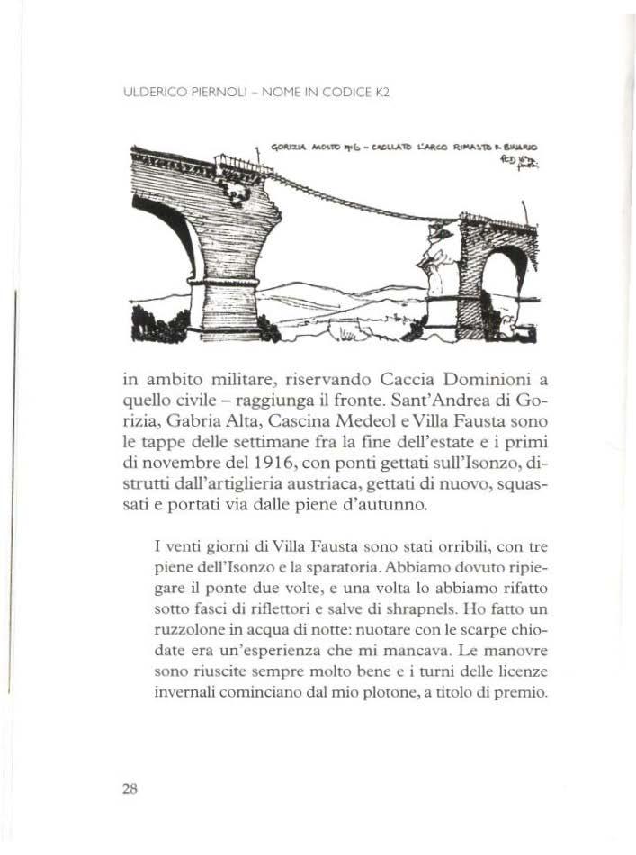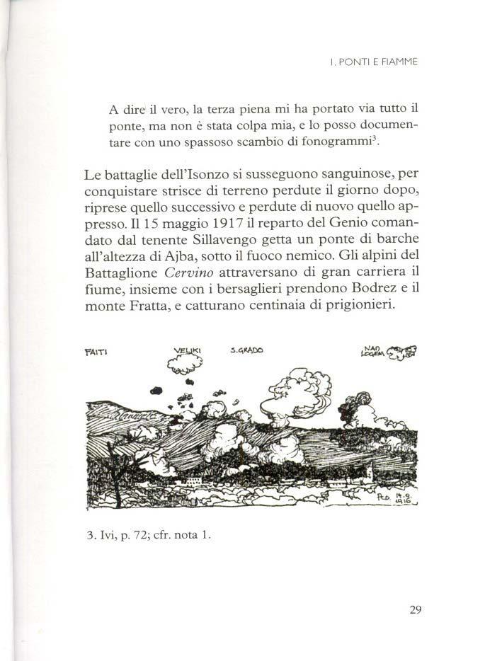 J venti giorni di Villa Fausta sono stati o rribili, con tre piene dell'Isonzo e la sparatoria. Abbiamo dovuto ripiegare il ponte due volte, e una volta lo abb iam o rifatto sotto fasci di riflettori e salve di shrapnels. Ho fatto un ruzzolone in acqua di notte: nuotare con le scarpe chiodate era un 'esperienza che mi mancava. Le manovre sono riuscite sempre molto bene e i turni delle licenze invernali cominciano dal mio plotone, a titolo di premio.