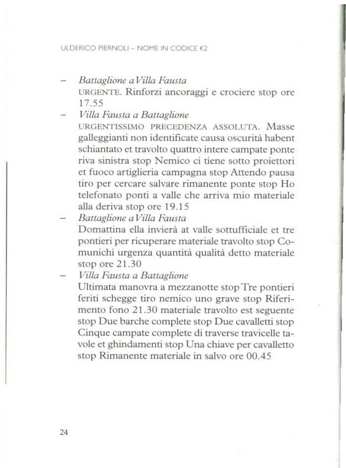 LRG ENTISSlMO PRECEDE:,JZA ASSOl.l;1A. Masse gaUeggianti non identificare causa oscurità habent schiantato et travolto quattro intere campate ponce riva sinistra stop Nemico ci tiene sotto proiettori et fuoco artiglieria campagna stop Attendo pausa tiro per cercare sa l vare rimanente ponte stop Ho telefonato ponti a valle che arriva mio materiale aUa deriva stop ore 19 .15