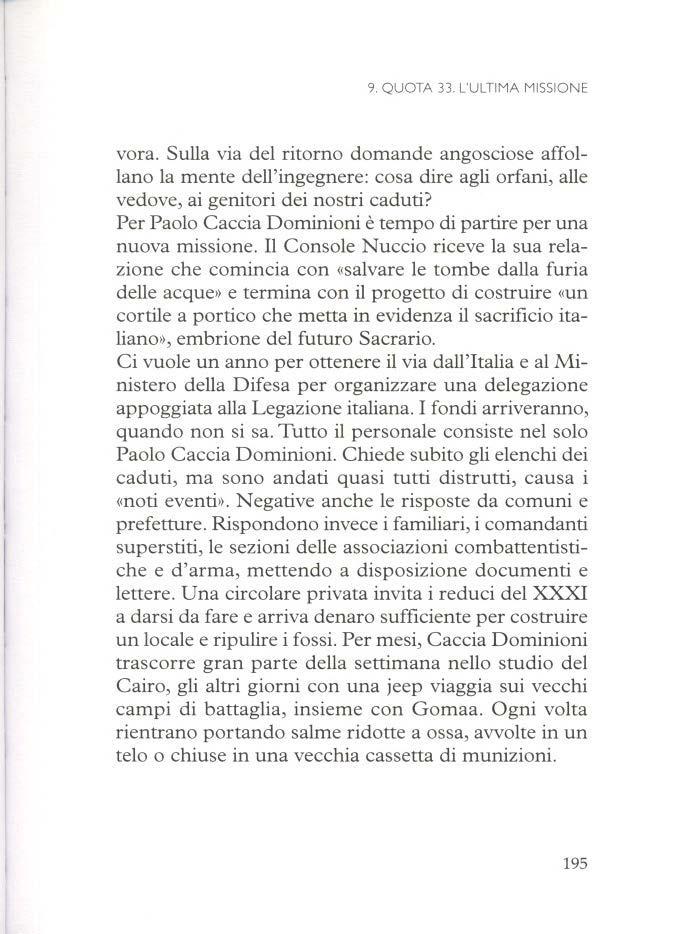 Attingendo a memorie, testimonianze e conoscenze del passato, U lderico Piernoli riannoda i fili della complessa personalità dell ' eroe , dando vita a un racconto inedi to e brillante: un grande affre sco in cui s'intrecciano storia, azione, ideali, altruismo ed esempi per il futuro. Il ritratto ch e si staglia sullo sfondo degli eventi per molti aspetti esula dalla stor iografia ufficiale, facendo emergere e apprezzare g li aspetti più profondi della persona l ità di Pao lo Caccia Dominioni, individuo pacato ma impavido, dalla tempra forte e ostinata. Ingegnere, artista e scrittore prima che militare, il conte e barone originario di Nerviano ha incarnato una figura d' i ntellettuale poliedrico, che ha lasciato traccia di sé in costruzioni di ogni tipo (monumentali , stradali, minerarie e res idenziali), real izzando centinaia di progetti in Italia e all'estero, in quattro continenti, tra cui l'Ambasciata del Regno d ' Italia ad Ankara, in Turchia. Viene ricordato, inol t re, per aver prodotto un migliaio di disegni , bozzetti e acquerelli sui soggetti e sugli argomenti più disparati e per aver scritto numerosi libri, in gran parte incentrati s u lle proprie esperienze di guerra, e circa una ventina di racconti e opere minori, scaturiti dalle vicende vissute in tante parti del g lobo. Conoscitore di numerose lingue straniere, tra cui l'arabo, si è rivelato da subito cittadin o del mondo, collaborando con s tu di di architettura e ingegneria in tutto il Mediterraneo, tra un richiamo in servizio e l'al tro.