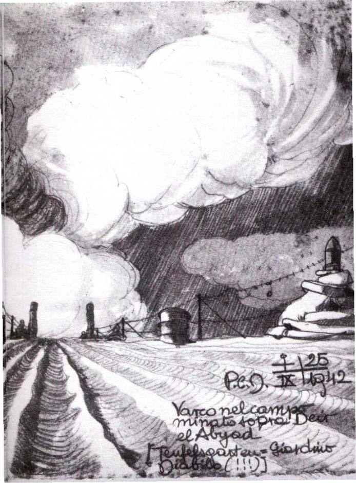 p. IO: Carto lina per il Sacrario Militare Italiano d i El Alamein (1987); in basso, •P r eghiera» di Alamein (1953).