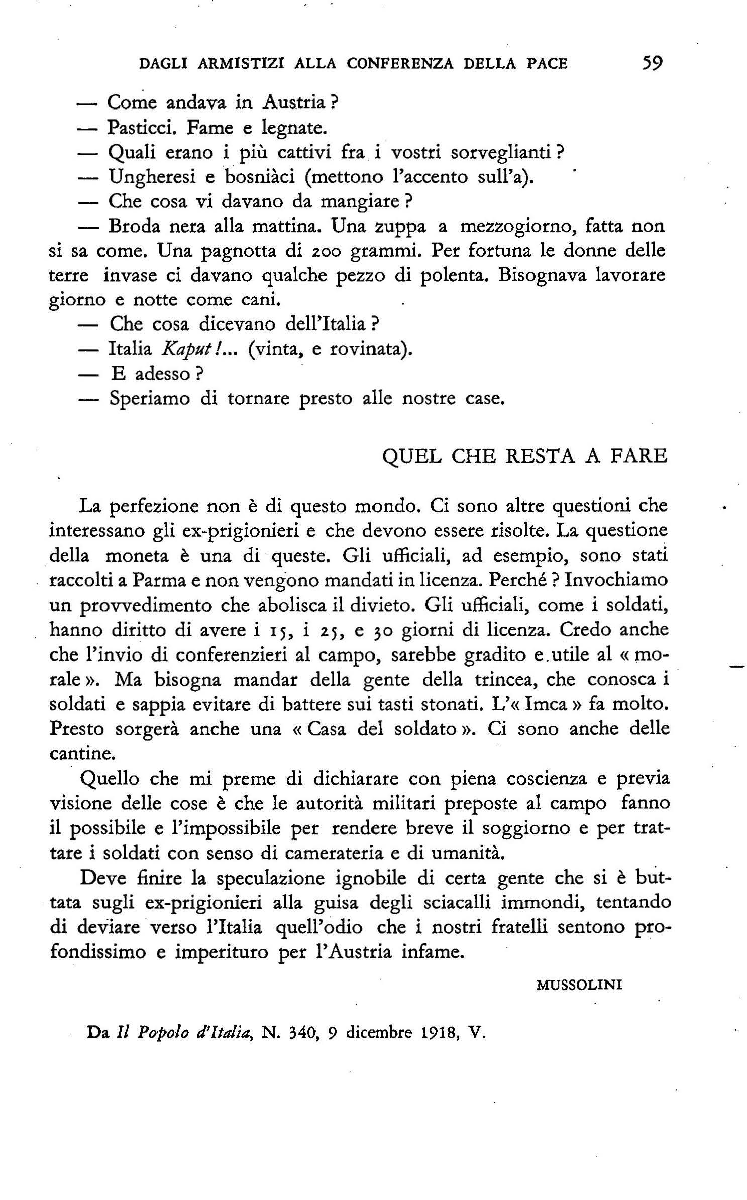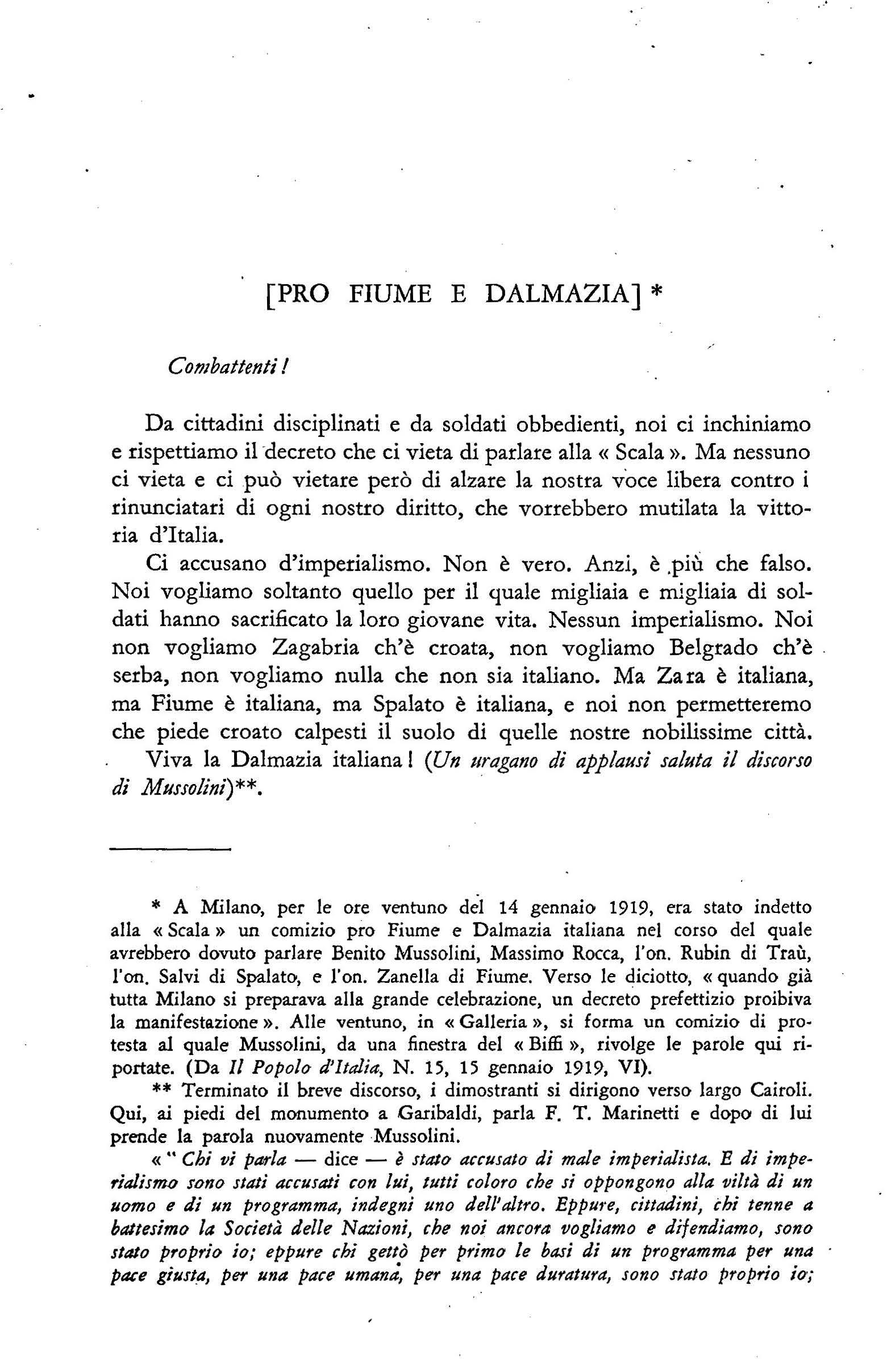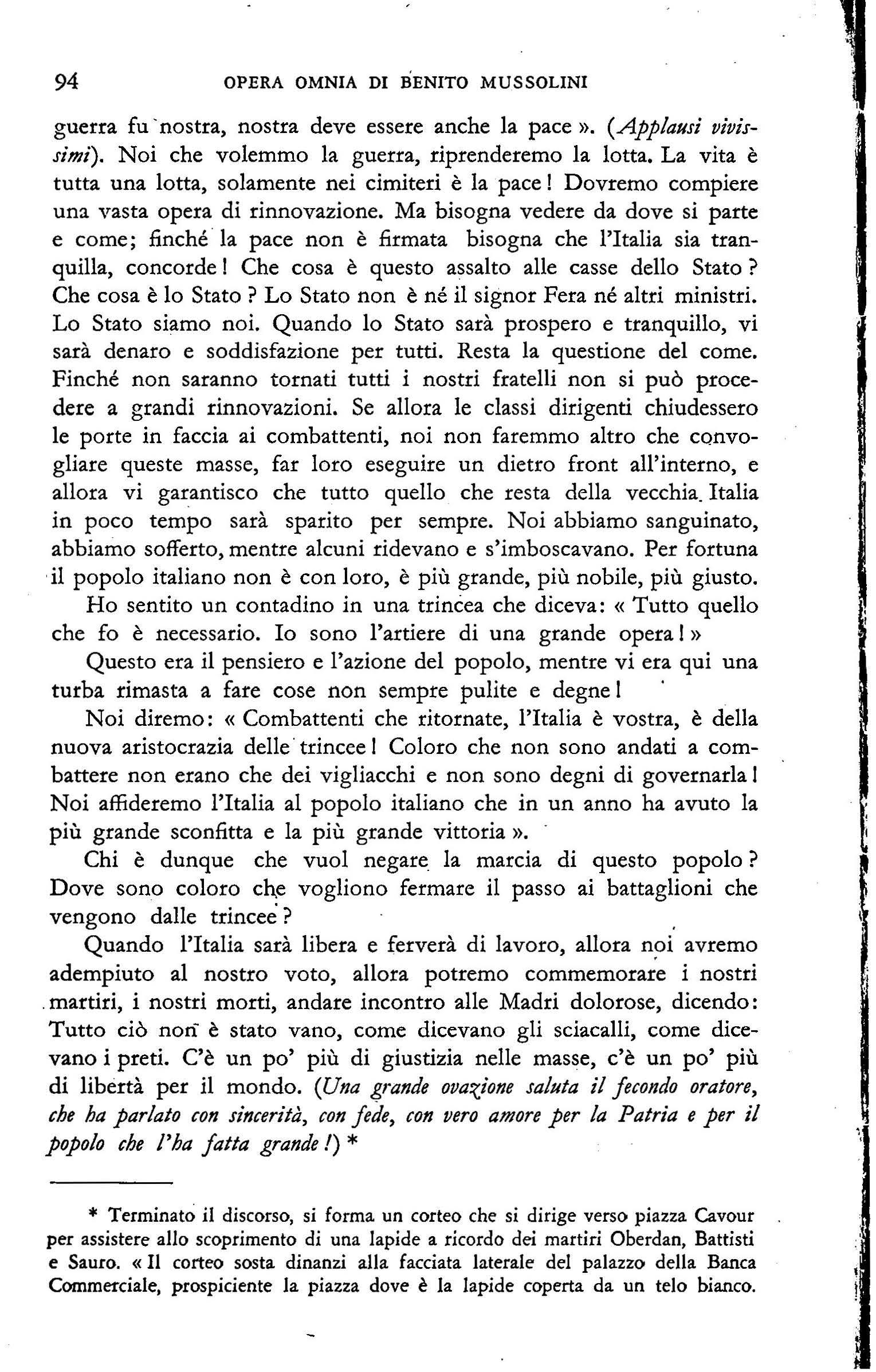N oi tutti çhe volemmo l'interv ento siamo necessariamente legati al fatto storico che contribuimmo con tutte le nostre forze e tutte le nostre passioni a determinare e siamo quindi legati alla situazione che si è d elineata in conseguenza dell'intervento. Se nostra, in un certo senso, fu la guerra, nostro dev'essere il dopo-guerra, poiché tra l"uno e l'altro evento non esiste soluzione di continuità. Il d opo-guerra deve trovarci in linea, all'avanguardia, noi che volemmo la guerra e la volemmo per ragioni che hanno avuto la più alta, la più p ura, la p iù decisiva delle consacrazioni.