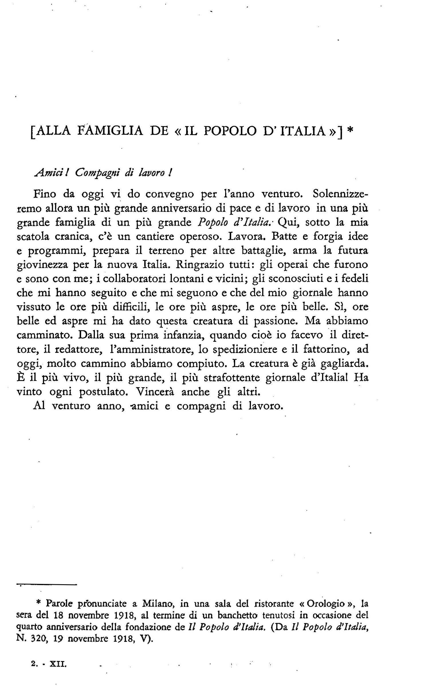 • Parole pr'onunciate a Milano, in utuL sala del ristorante «Orologio», la sera. del 18 novembre 19 18, a.l termine di un banchetto tenutosi in occasione del quarto anniversario della fondazione de Il Popolo à'Italia (Da Il Popolo d'Italia, N. 320, 19 novembre 1918, V).