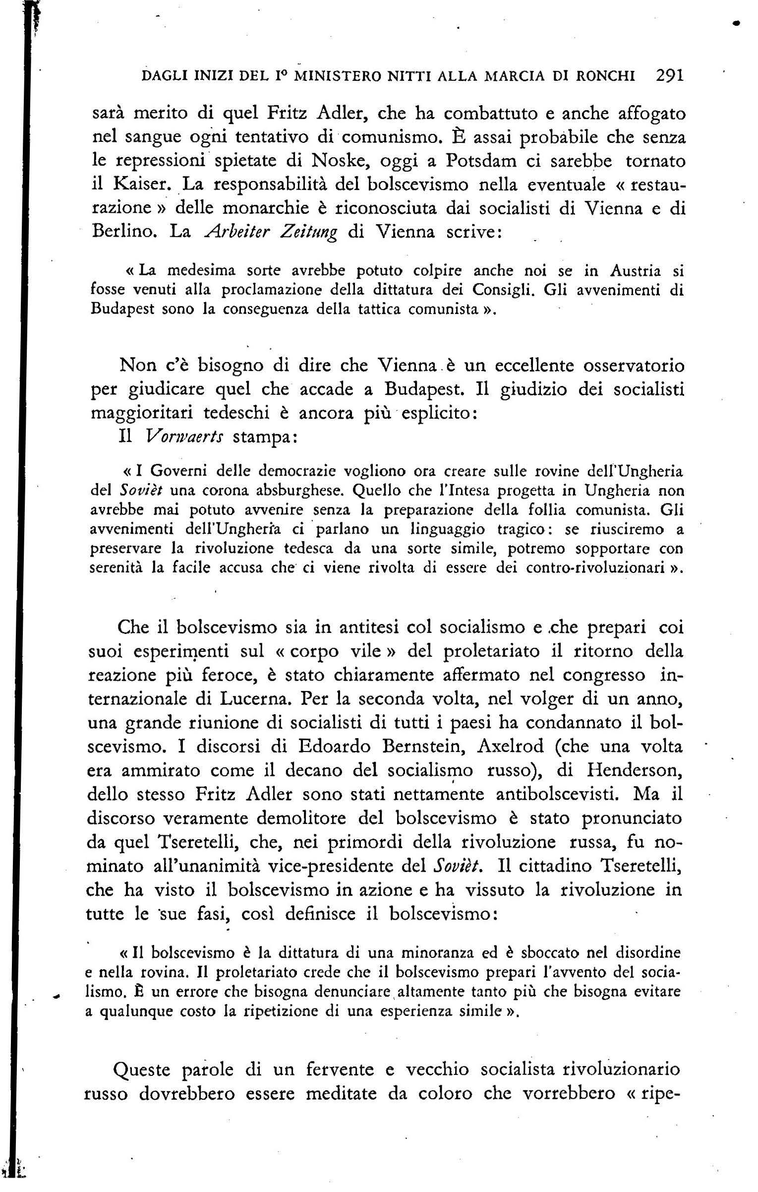 che per r ealizzare il s~ia lismo occorreva c~ esislcs$e!o le condiz.ioni economiche generali per la s ua generaliua:iione L'errore più grande del bolscevismo è .stato di voi~ applicare il socia lismo in una Russia non preparata. politicamente ed economicamente, con un popolo stanco da quattro anni di guerra c he avevano annientato la vita &:onomica d ella Russia. Perché la rivoluzione trionfi, bisogna contare sull'entusiasmo e non costruire sulla disperazione e sulla miseria del popolo. La villo ria dd bolscevismo è l'antitesi del socialismo. Si è paragonato il r egime bolscevico alla Comune di Parigi: non è la stessa cosa. La Comune voleva creare un organismo di Stato socialista; i bolscevich i hanno distrutto ogni organiziaz..ione di. Stato.... »,