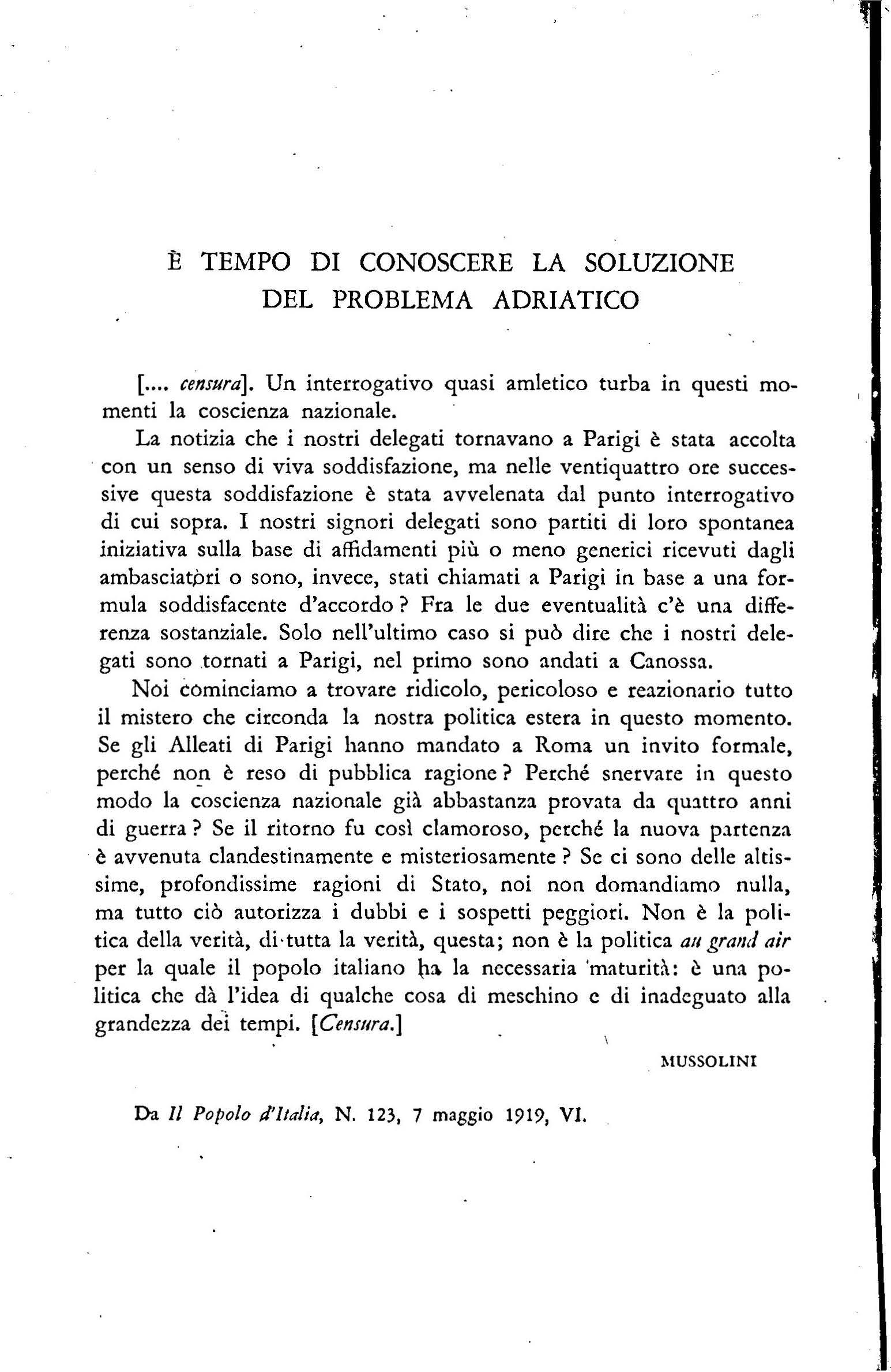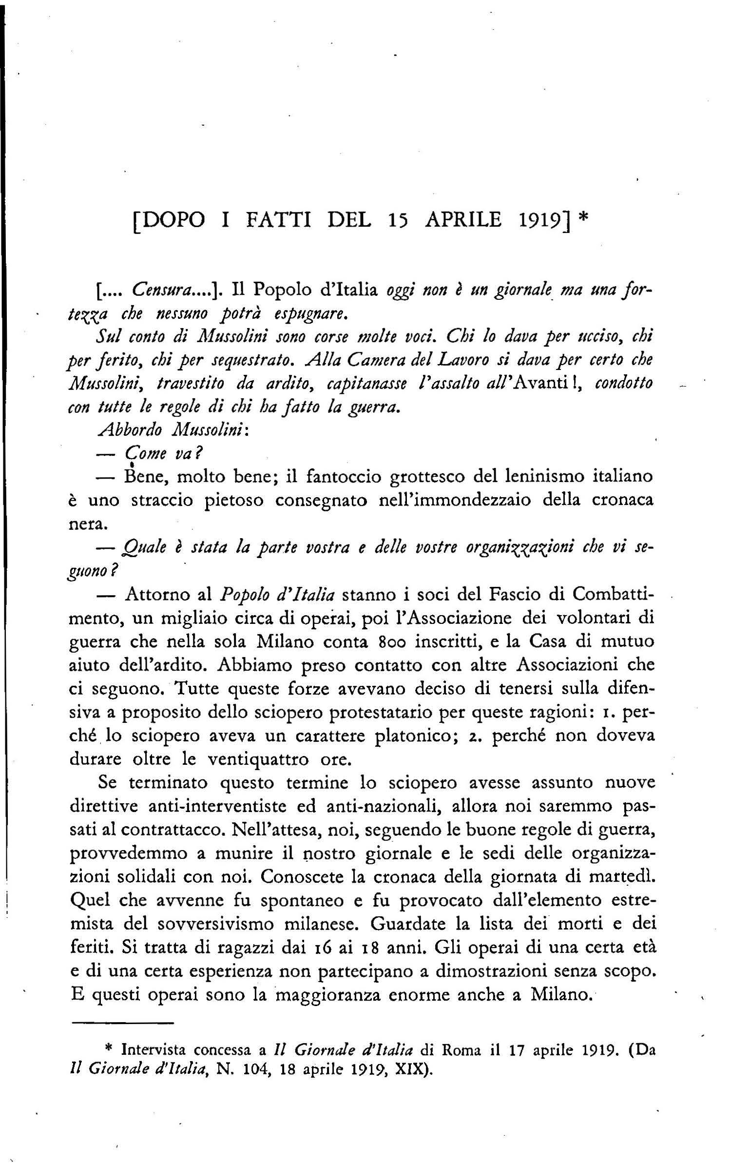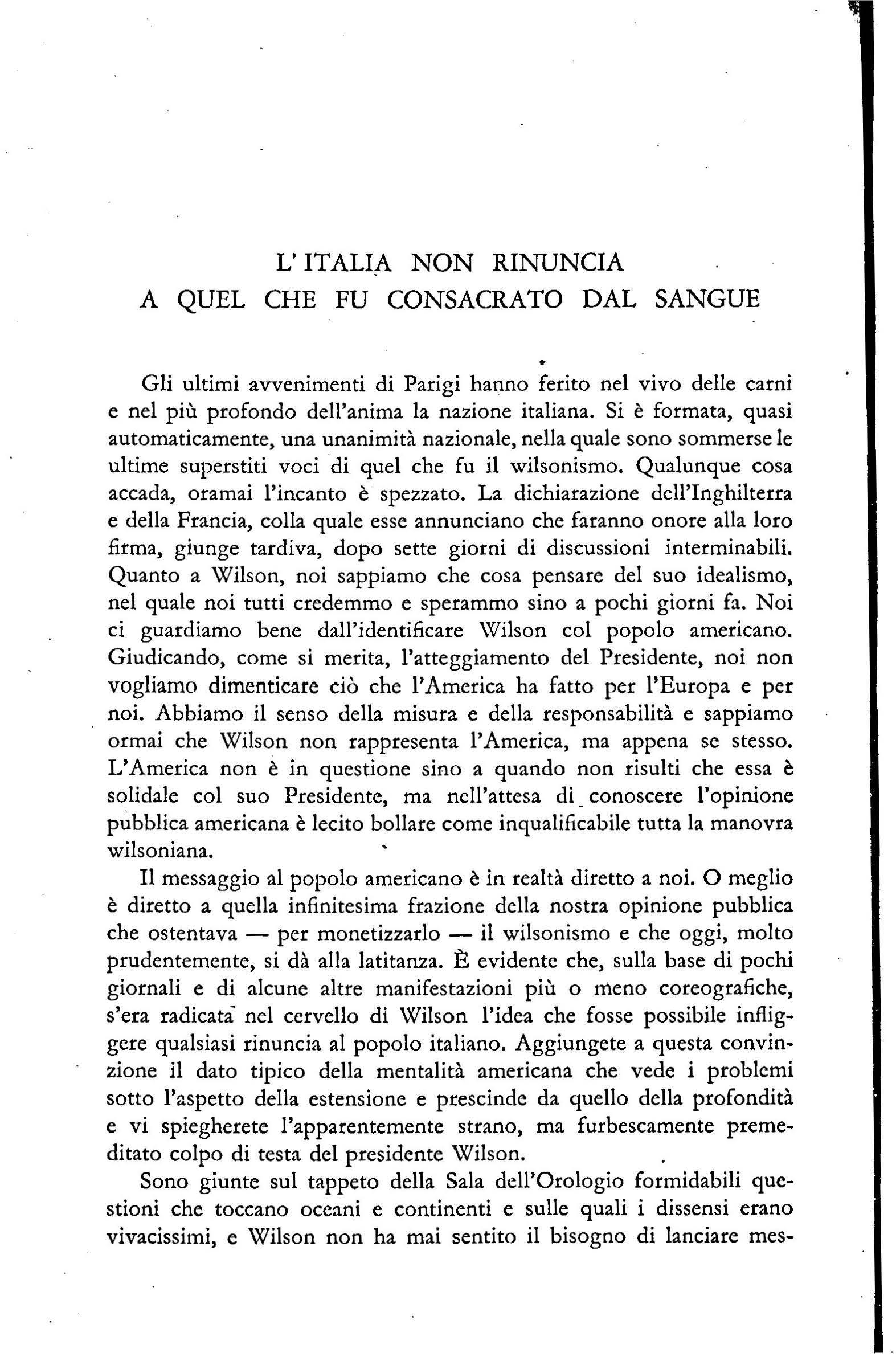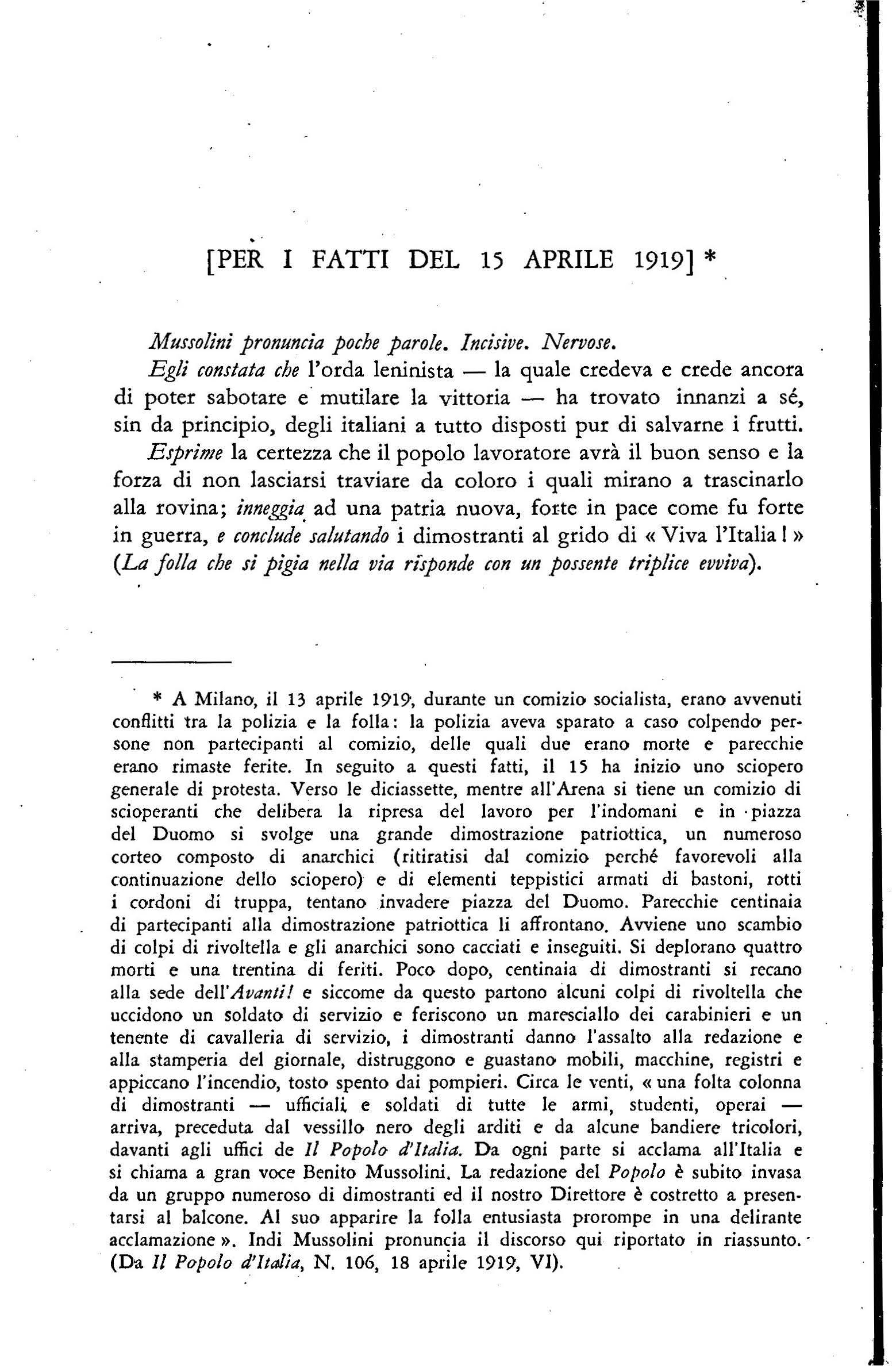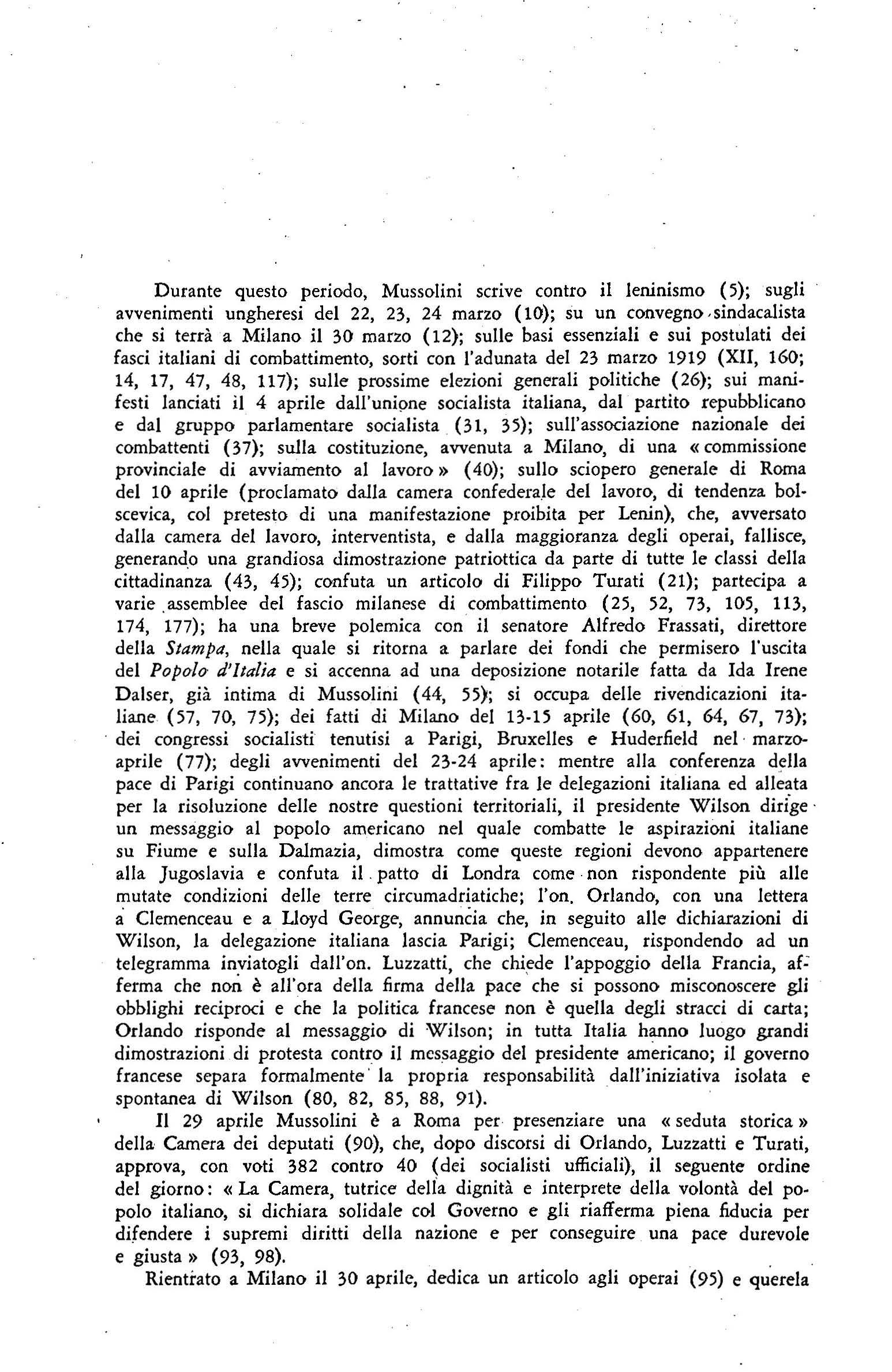 Durante questo peri<Xlo, Mussolini scrive contro il leninismo ( S); sugli avvenimenti ungheresi del 22, 23, 24 mano (10}; su un convegno.sindacalista che si terrà a Milano il 30 marzo ( 12); sulle basi essenziali e sui postulati dei fasci italiani di combattimento, sorti con l'adunata del 23 marzo 1919 (XII , 160; 14, 17, 47, 48, 117); sulle prossime elezioni generali politiche (26); sui manifesti lanciati il 4 aprile dall'unipne socialista italiana, dal partito repubblicano e dal gruppo parlamentare socialista {31, 35); su ll'associazione nazionale dei combattenti ( 37); sulla costitu:zlone, avvenuta a Milano, d i una « commissione provinciale d i avviaÌnento al lavoro» ( 40) ; sullo sciopero generale di Roma del 10 aprile (proclamato dalla camera confederale del lavoro, di t enden.ca bolscevica, col p retesto di una manifestnione proibita per Lenin), che, avversato dalla camera del lavoro, interventista, e da lla maggioranza degli operai, falli sce, gene.rand.o una gra ndiosa dimost razione pat riottica da parte d i tutte Je classi della cittadinanza ( 43, 45); confuta un articolo di Fi lippo Turati (21); p utecipa a varie assemblee del fascio milanese di combattimento ( 25, 52, 73, 105, 11 3, 174, 177) ; ha una breve polemica con· il senatore Alfredo Frassati, direttore della S tampa, nella quale si ritorna a parlare dei fondi che permisero l"uscita del Popolo d ' for{;a e si accenna ad una deposizione notarile fatta. da I da Irene D alser, g ià intima di M ussolini (44, :>S); si occupa delle rivendicazioni i taliane (S 7, 70, 7S); dei fatti di Milano del 13- lS aprile (60, 61, 64, 67, 73); dei congressi socialisti tenutisi a Parigi, Bruxelles e Huderfidd nel · marzoaprile (77); degli avvenimenti del 23-24 aprile: mentre alla conferenza della pace di Parigi continuano ancora le trattative fra le d elegazioni italiana ed all~ata per la risoluzione delle nostre questioni territoriali, il presidente W i lson dirige · un messaggio al popo lo americano nel quale combatte le a.spiiazioni italiane su Fiume e sulla Dalma-zia, d imostra come q ueste regioni devono appartenere alla J ugos lavia e confuta il patto di Londra come non rispondente più alle mutate condizioni dc-I le tcr re circumadriaticbe; l'on Orlando, con una lettera à Clcmenceau e a Lloyd George, annunéia che, in seguito alle dichiarazioni di Wi lson, la delegazione italiana lascia. Parig i ; CJemenccau, rispondendo ad un telegramma inviatogli dall'on. Luzzatti, che chi~e l' appoggio della Francia, af; fenna che nori è all'ora della fi rma della pace che si possono misconoscere gJi obblighi reciproci e che la politica francese non è quella degli stracci di carta; Orlando risponde al messaggio di Wilson; in tutta Italia h~no luogo grandi dimostrazioni di protesta contro i l mcs.saggio del presidente americano; il g overno fra ncese separa formalmente " la propria responsabilità dalriniziativa isolata e spontanea di Wilson ( 80, 82, 8'.'.i, 88, 91) ·